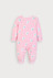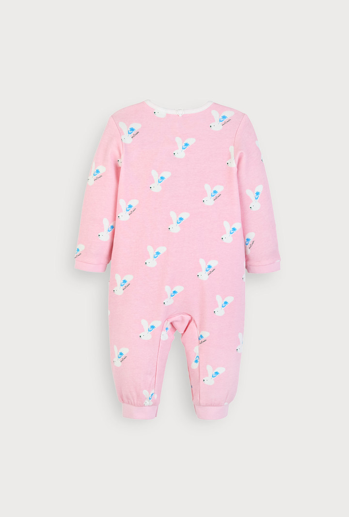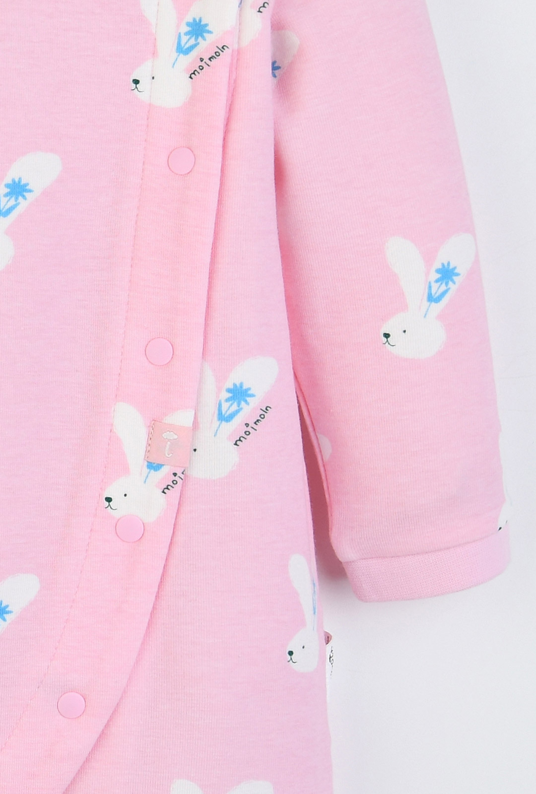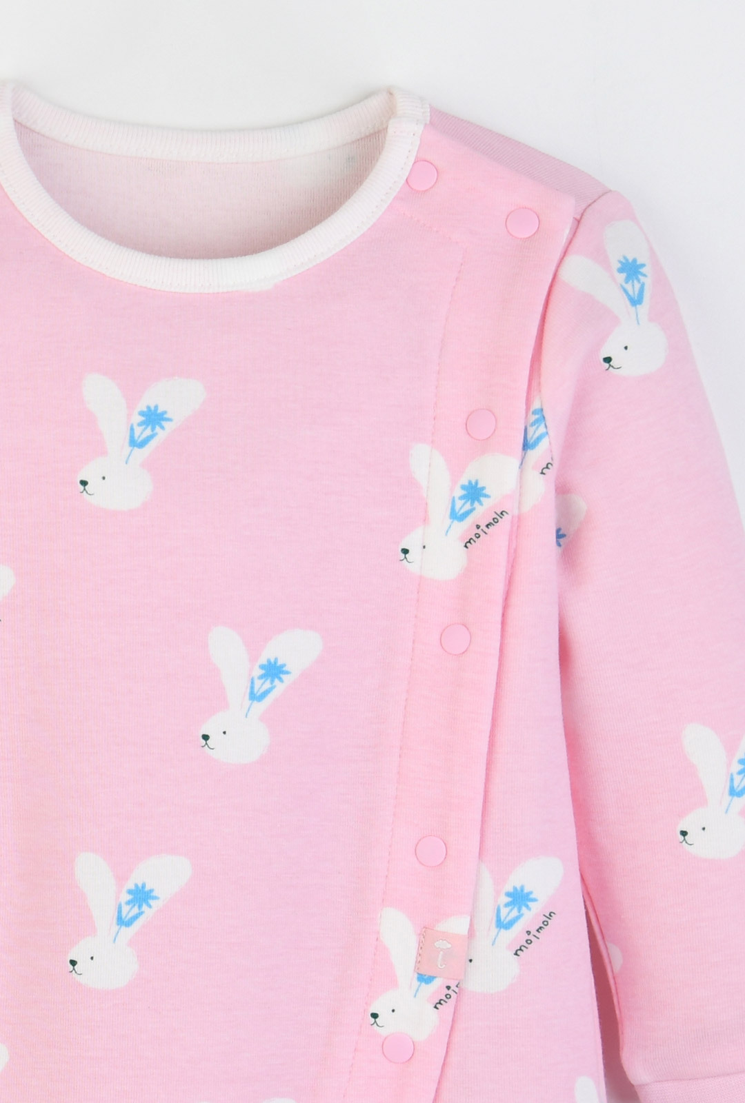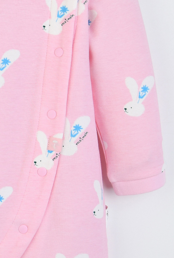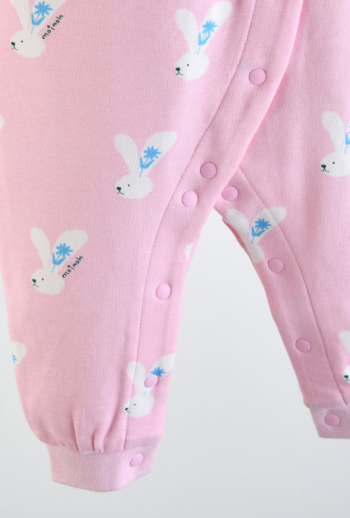 부드럽고 유연한 면모달스판 원단으로 피부에 자극 없이 닿고, 산뜻한 핑크 바닥 컬러에 위트 있는 토끼 나염이 어우러진 우주복