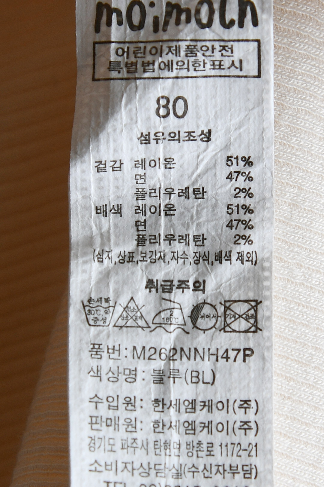 | 세탁방법 및 취급시 주의사항 | 본 세품은 손세탁 하십시오(케어라벨 참고) |