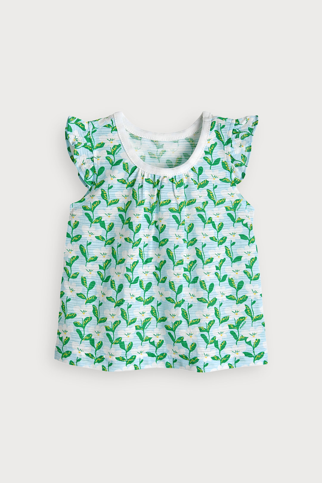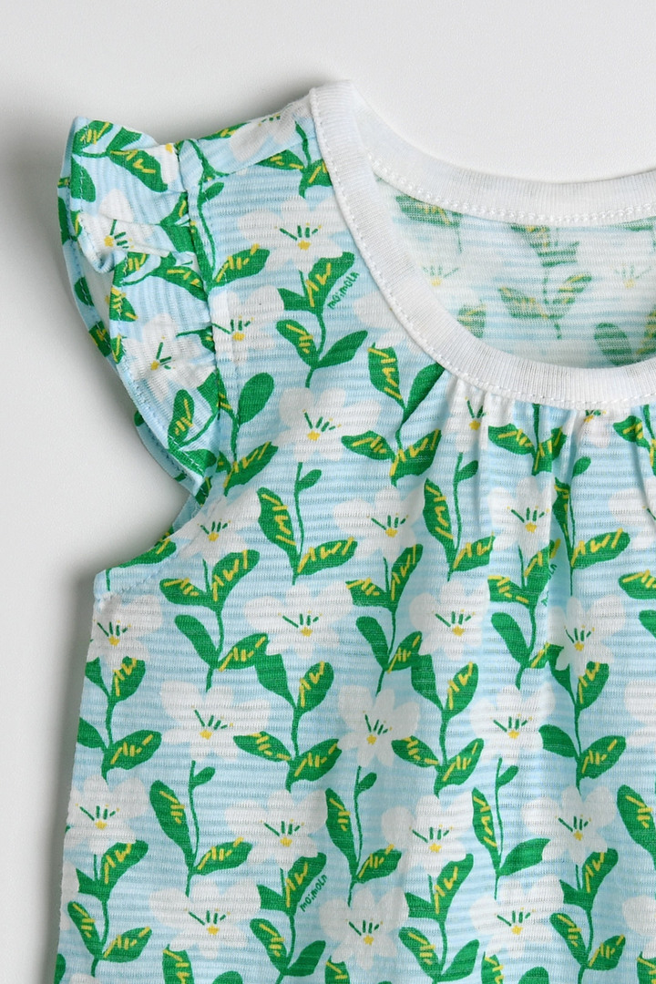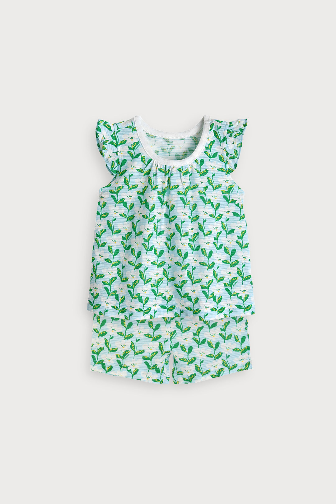 면 100%에 나염과 프릴 디테일이 더해져 여름의 싱그러움이 느껴지는 나시 상하 세트