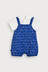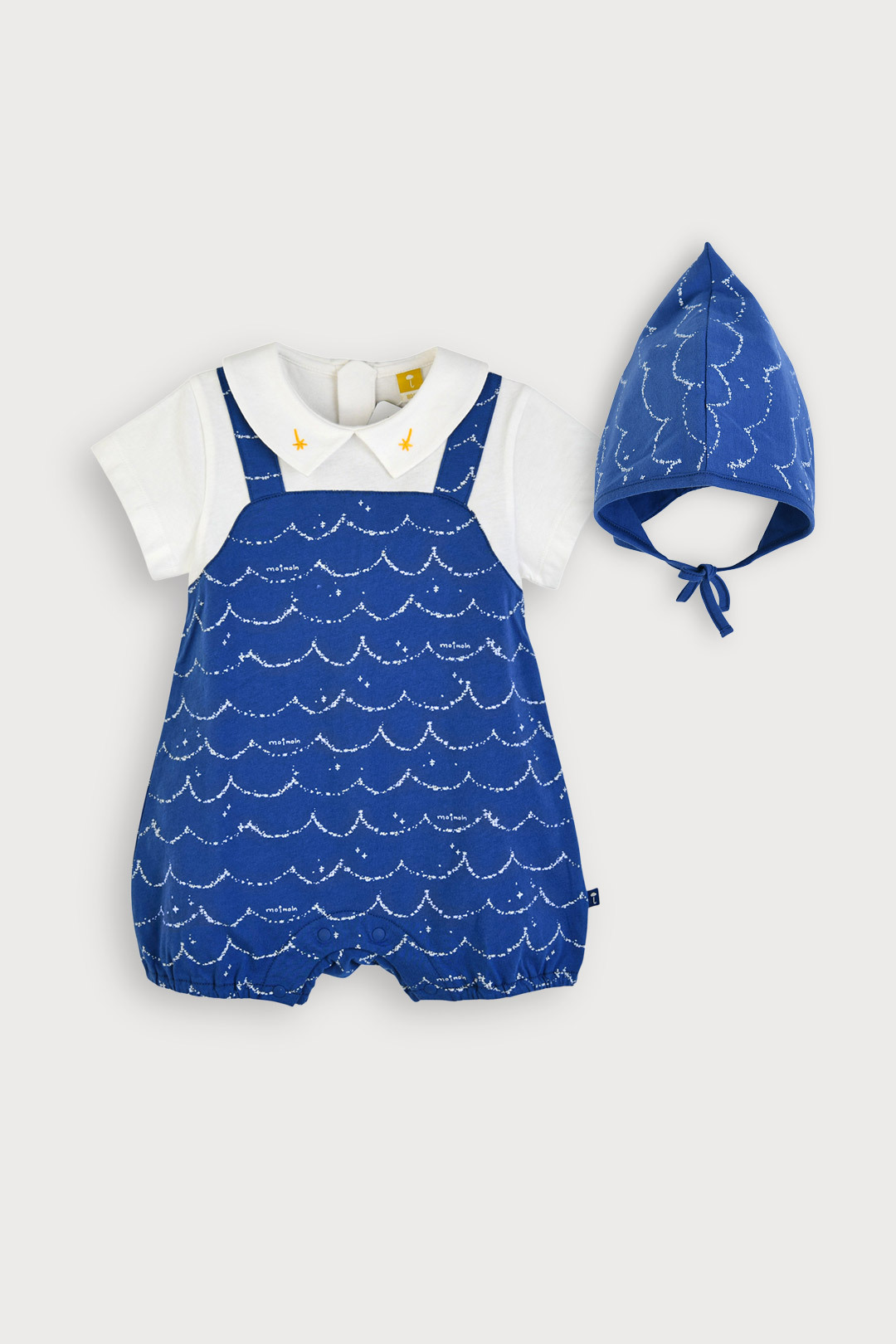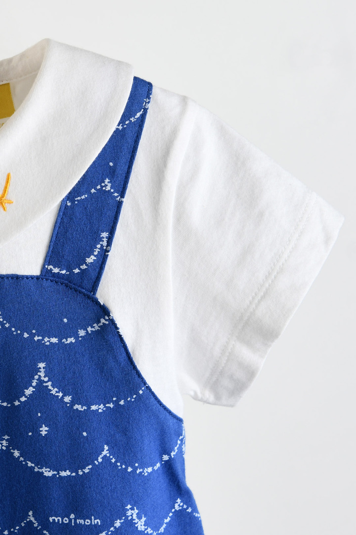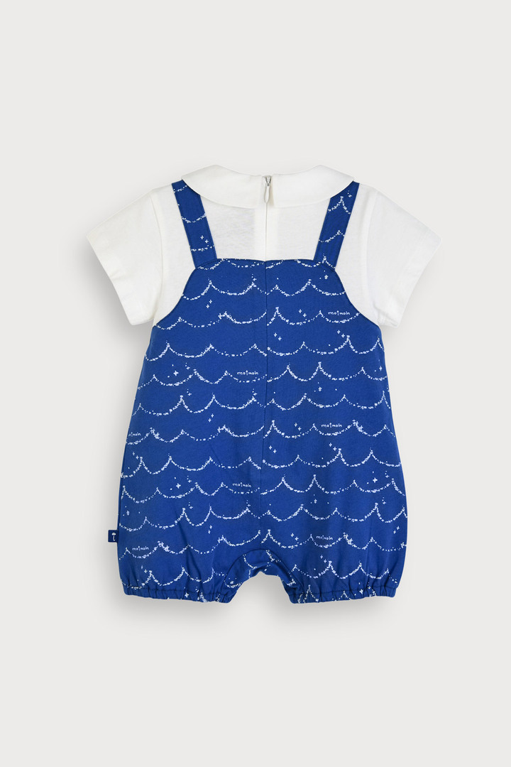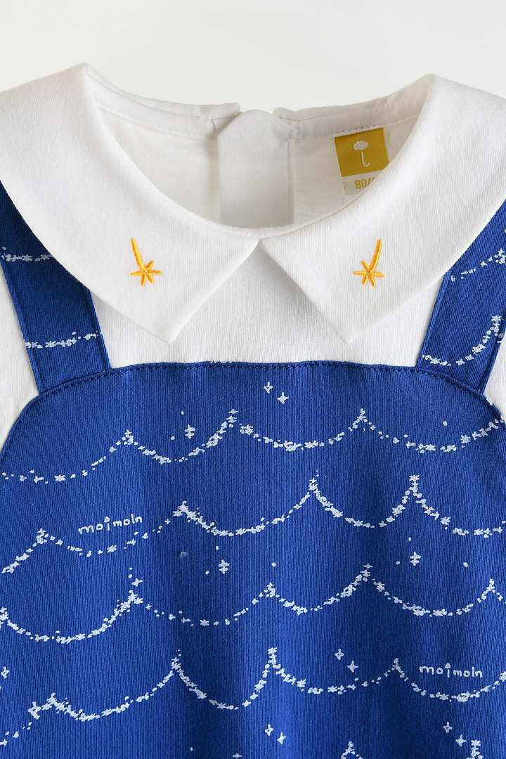 시원한 블루 컬러 위에 하얀 물결 나염이 포인트인 4부 우주복 반팔 티셔츠와 멜빵 우주복을 레이어드한 듯한 귀여운 일체형 디자인 동일한 패턴의 보넷이 세트로 구성되어 완벽한 코디 연출 가능 천연 효소를 사용해 원단 표면을 부드럽게 가공하여 자극 최소화 찬물 손세탁을 권장