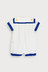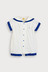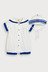 마린룩 감성의 컬러 배색과 모자가 세트로 구성된 청량한 무드의 베이비 자카드 우주복