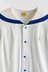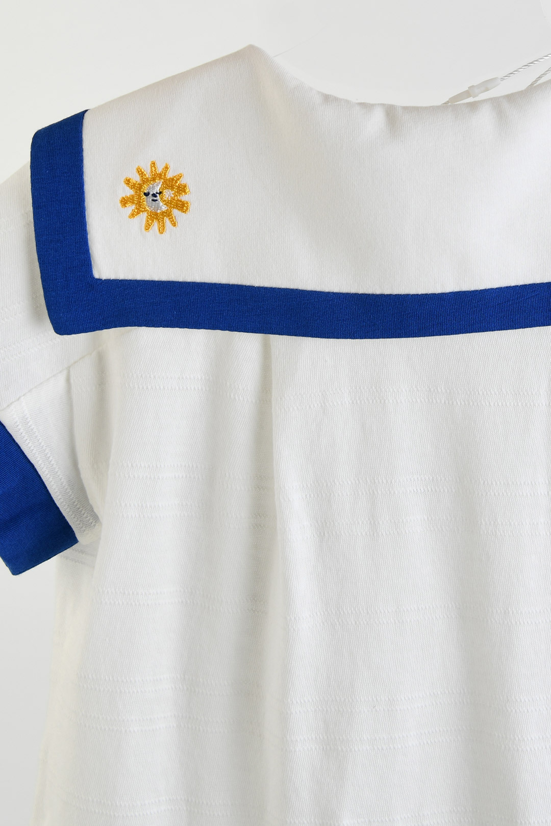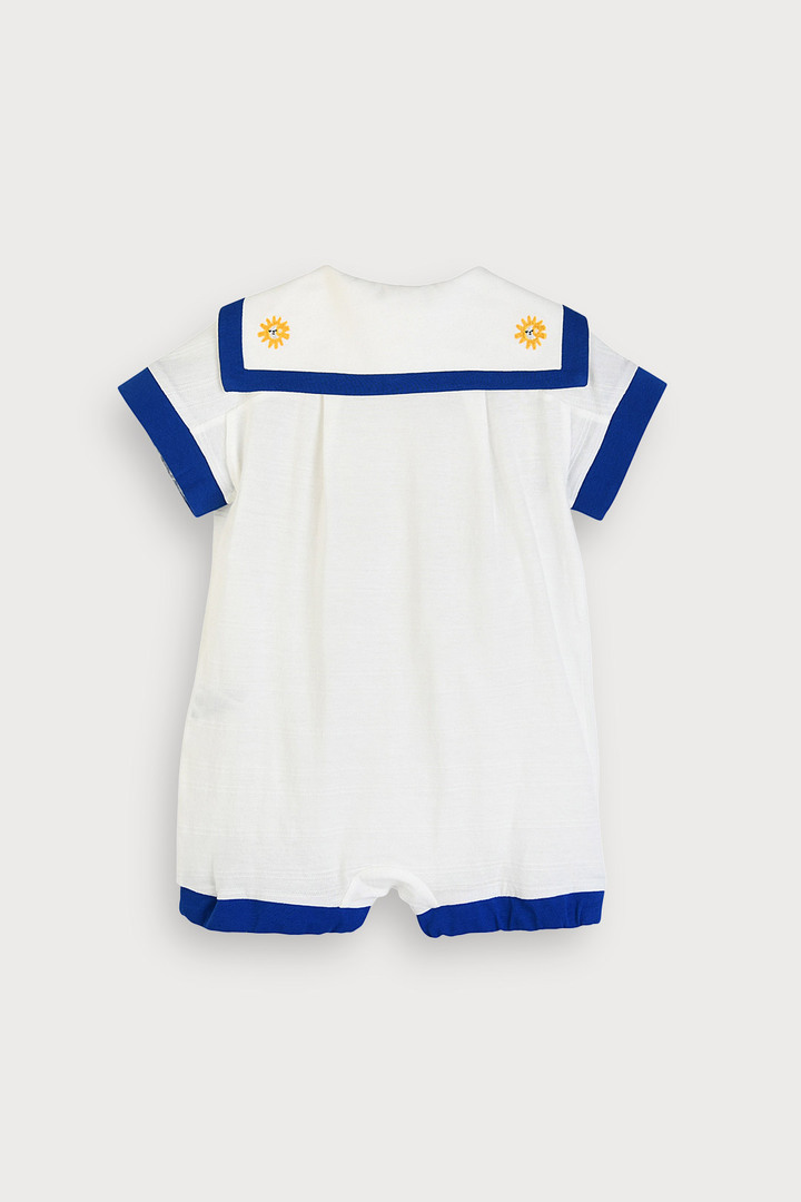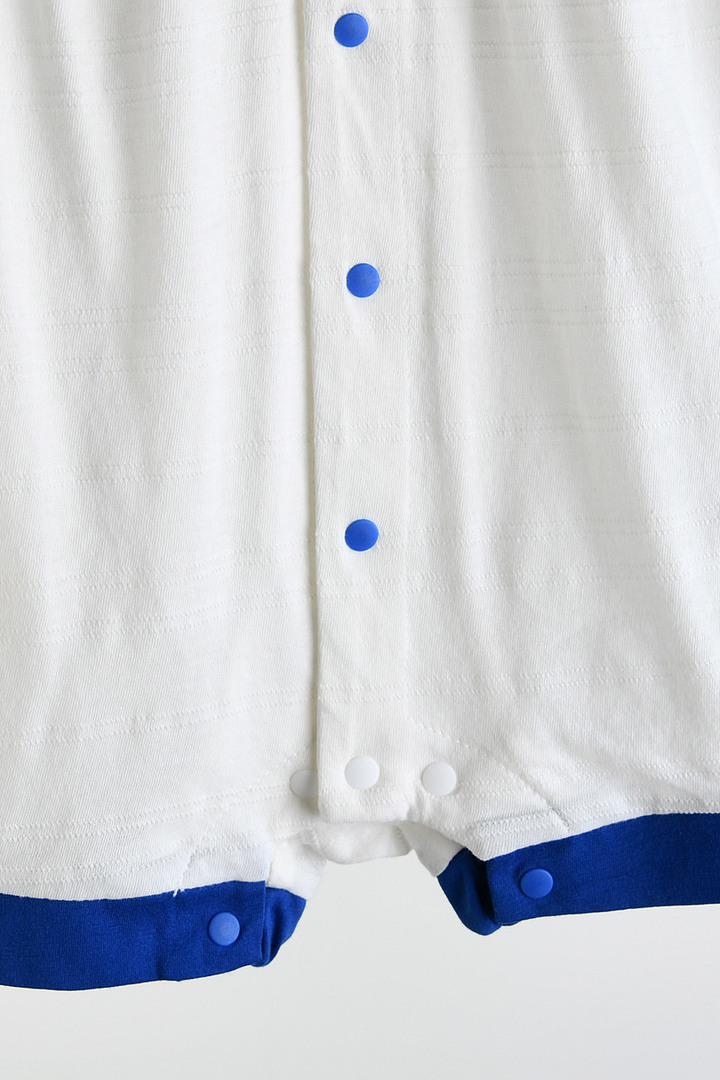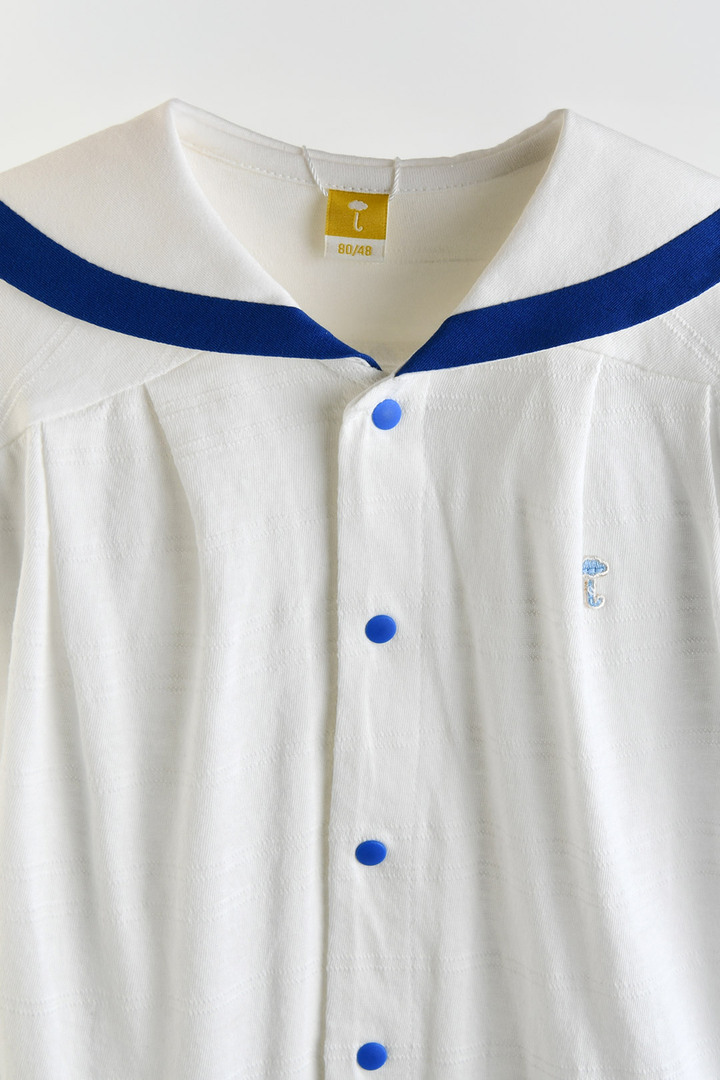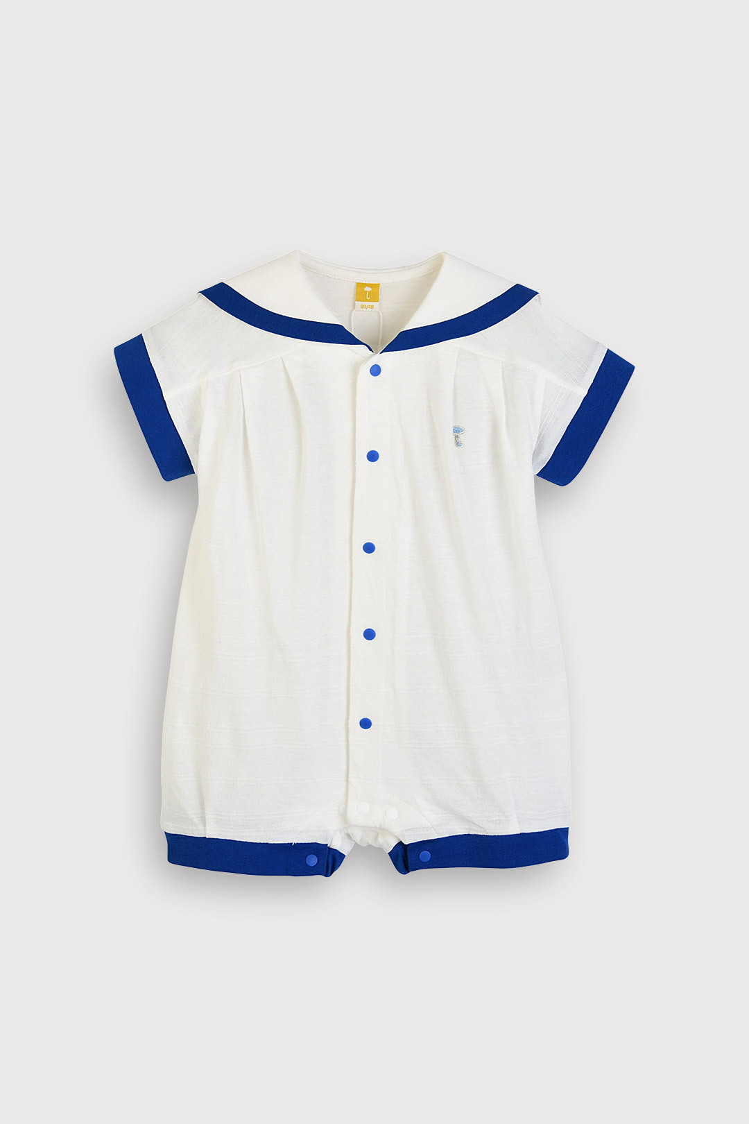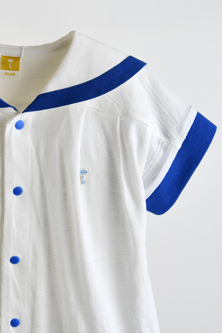 시원한 느낌을 주는 3부 기장의 반소매 우주복 우주복과 통일감을 주는 마린룩 스타일 모자 세트 포함 전체 앞트임 스냅 단추 적용으로 입고 벗기기 매우 편리함 카라의 배색과 자수 디테일로 귀여운 포인트 강조