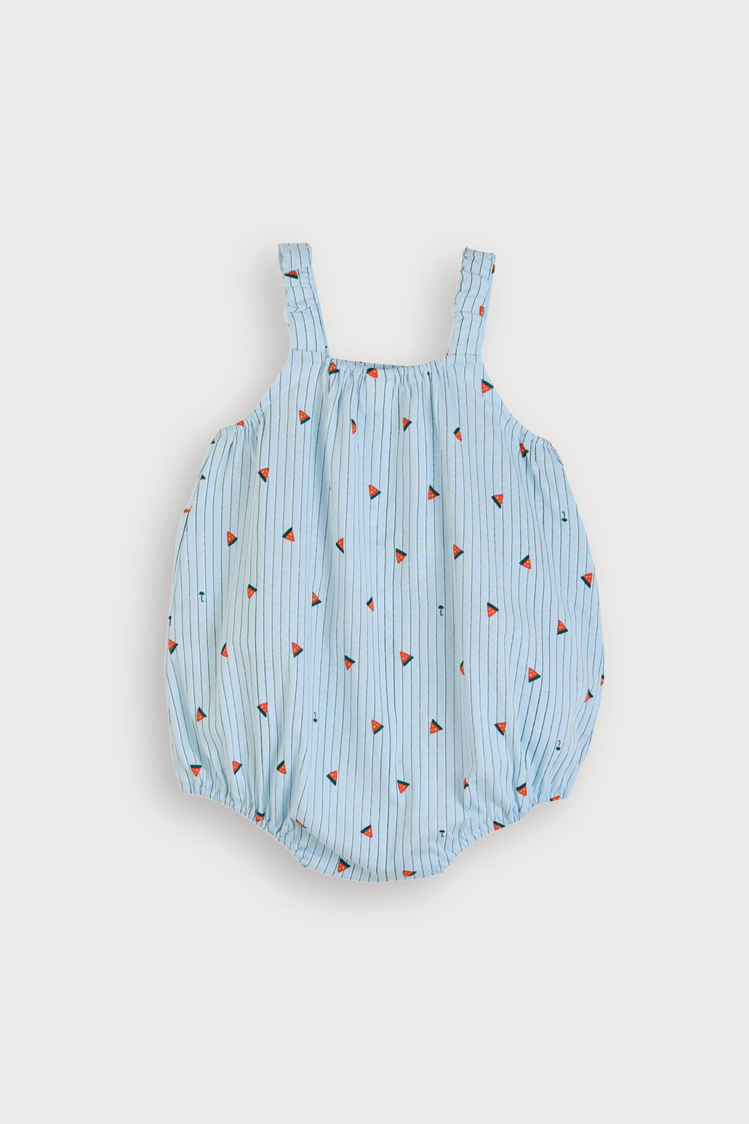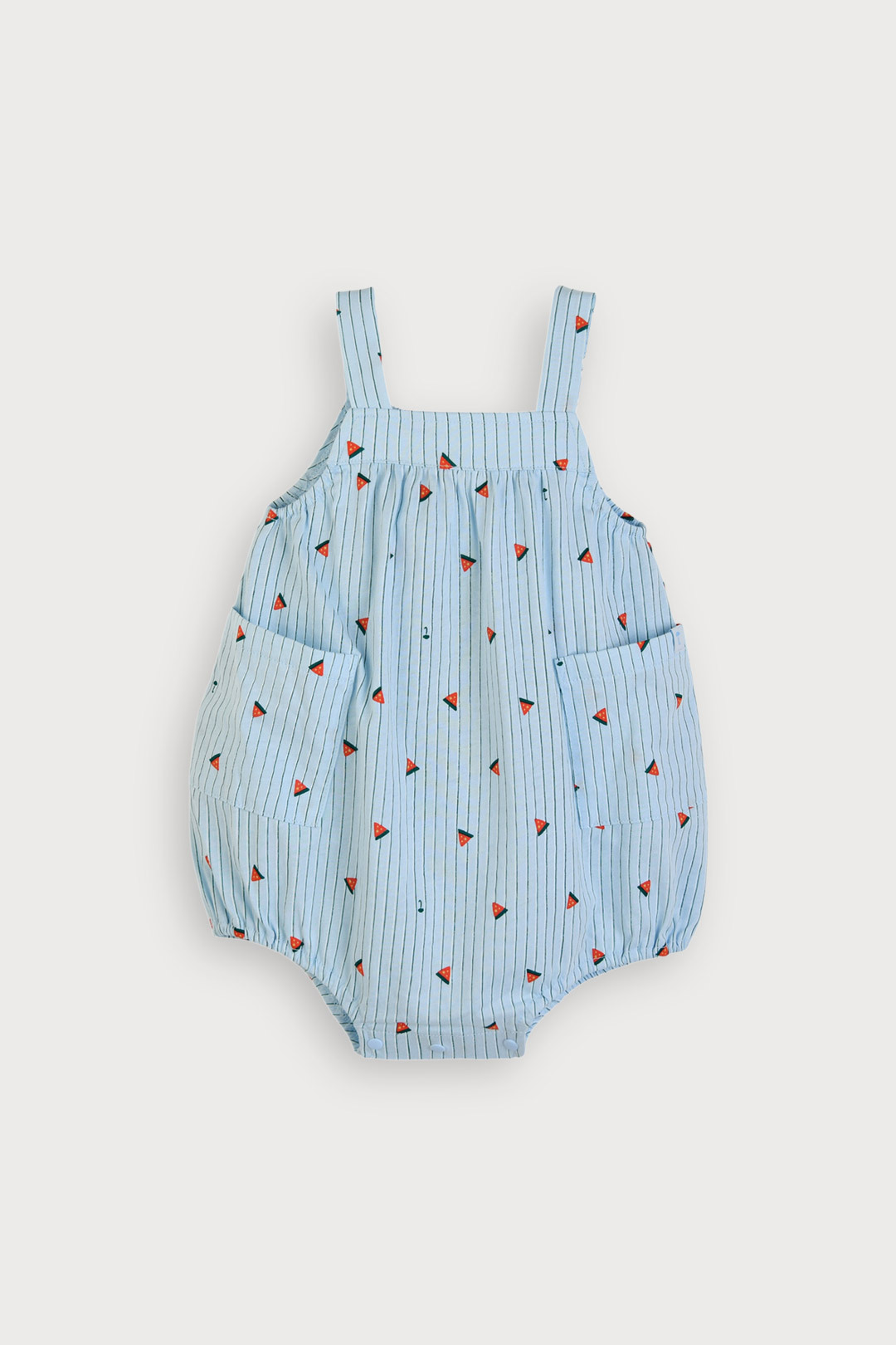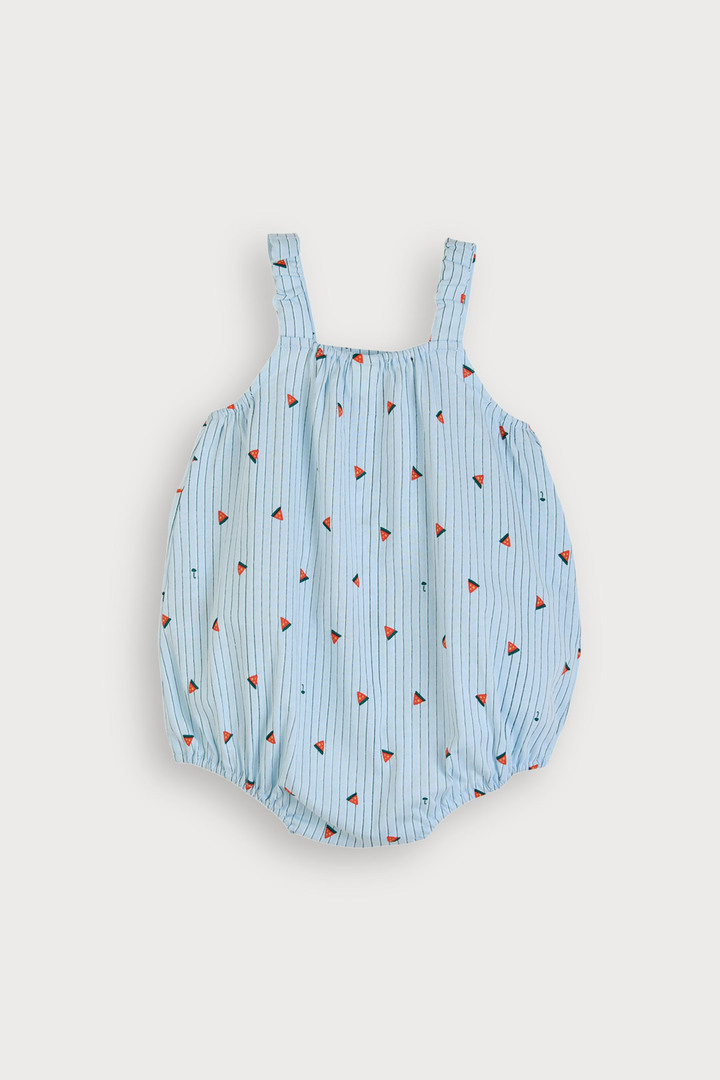 수박 모티브와 경쾌한 스트라이프 그래픽이 돋보이는 베이비 나시 오버올 우주복
