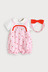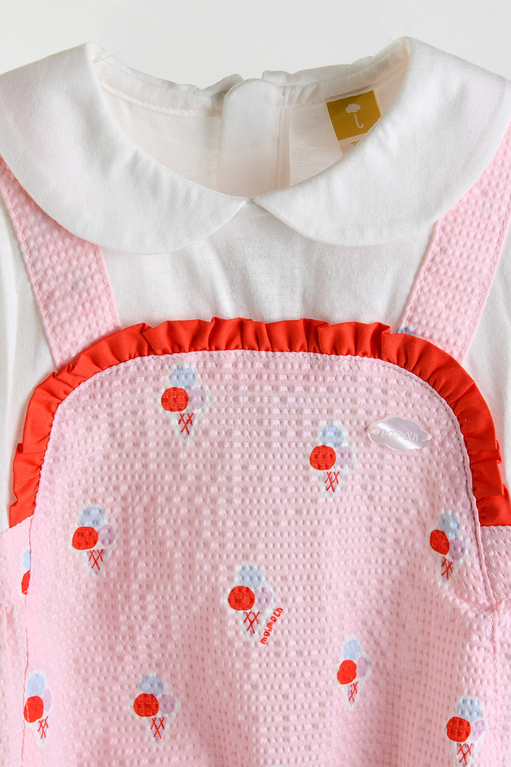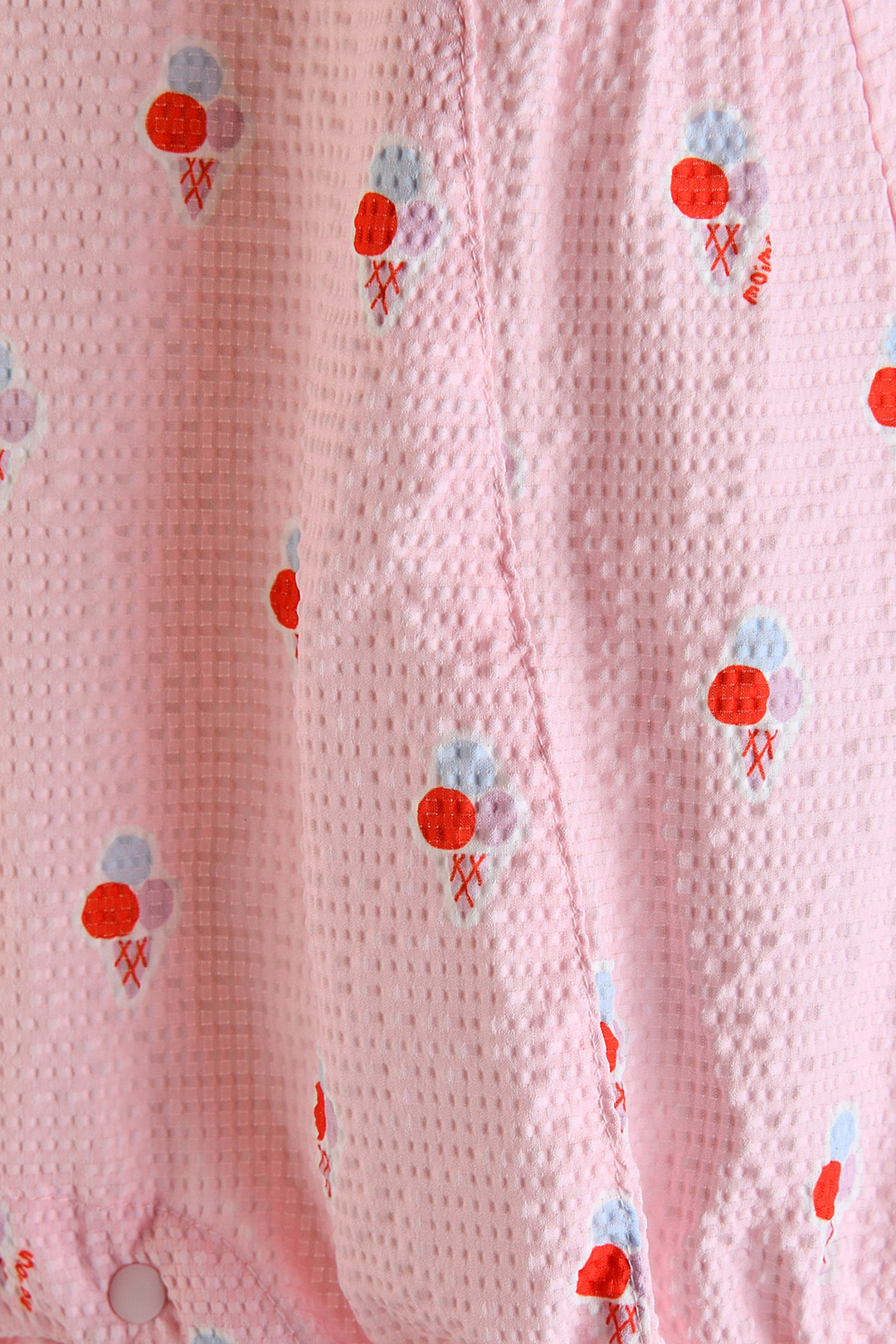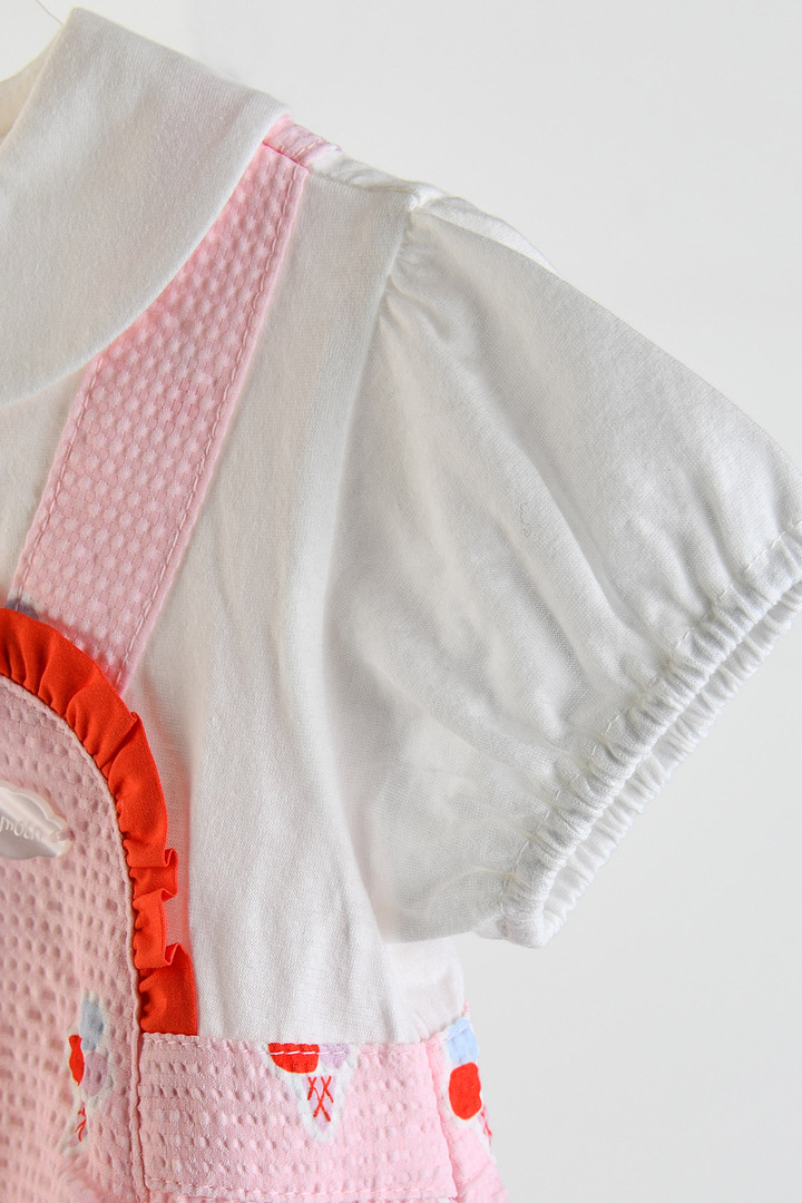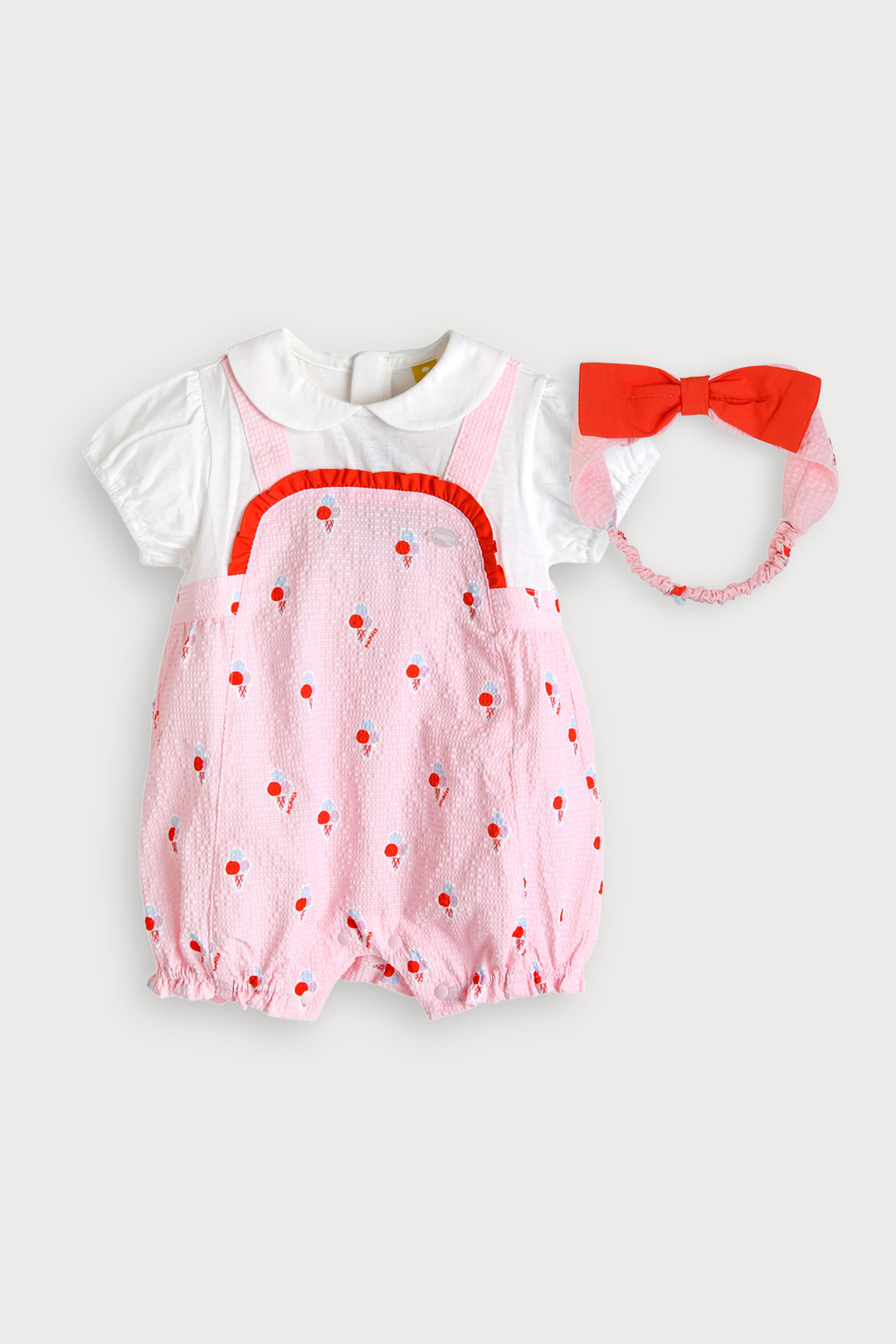 오버올을 겹쳐 입은 듯한 유니크한 레이어드 스타일의 4부 우주복 우주복과 세트로 코디 가능한 사랑스러운 리본 머리띠 포함 등 쪽 지퍼 여밈 구조로 간편하게 입고 벗기기 편리함 상단 싱글 소재와 하단 시어서커 소재의 믹스매치로 활동성과 쾌적함 동시 제공