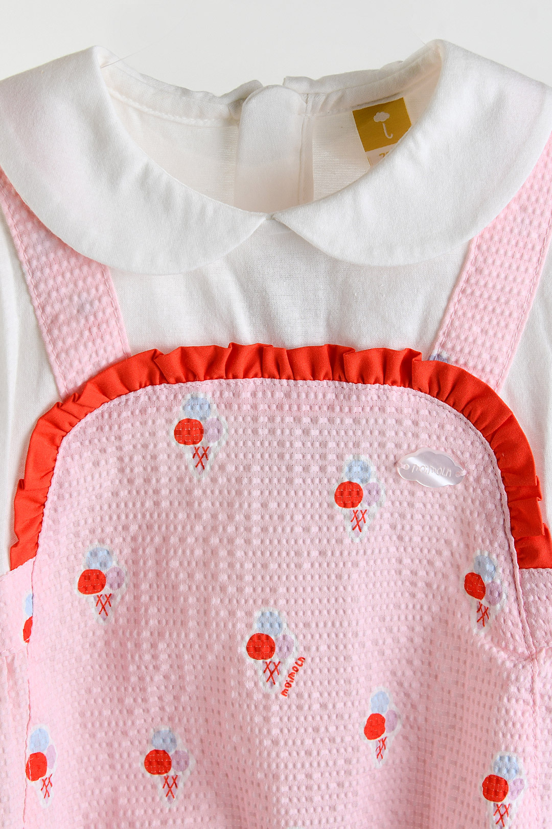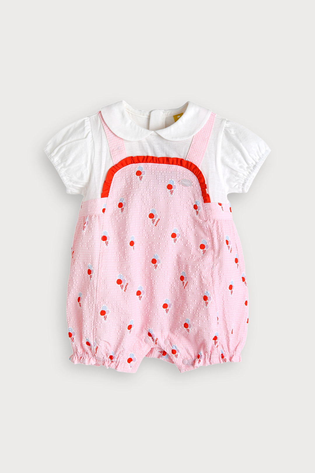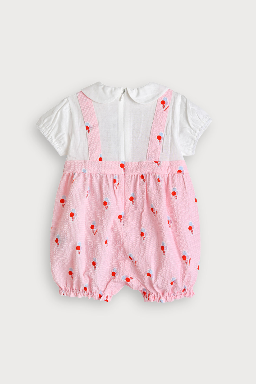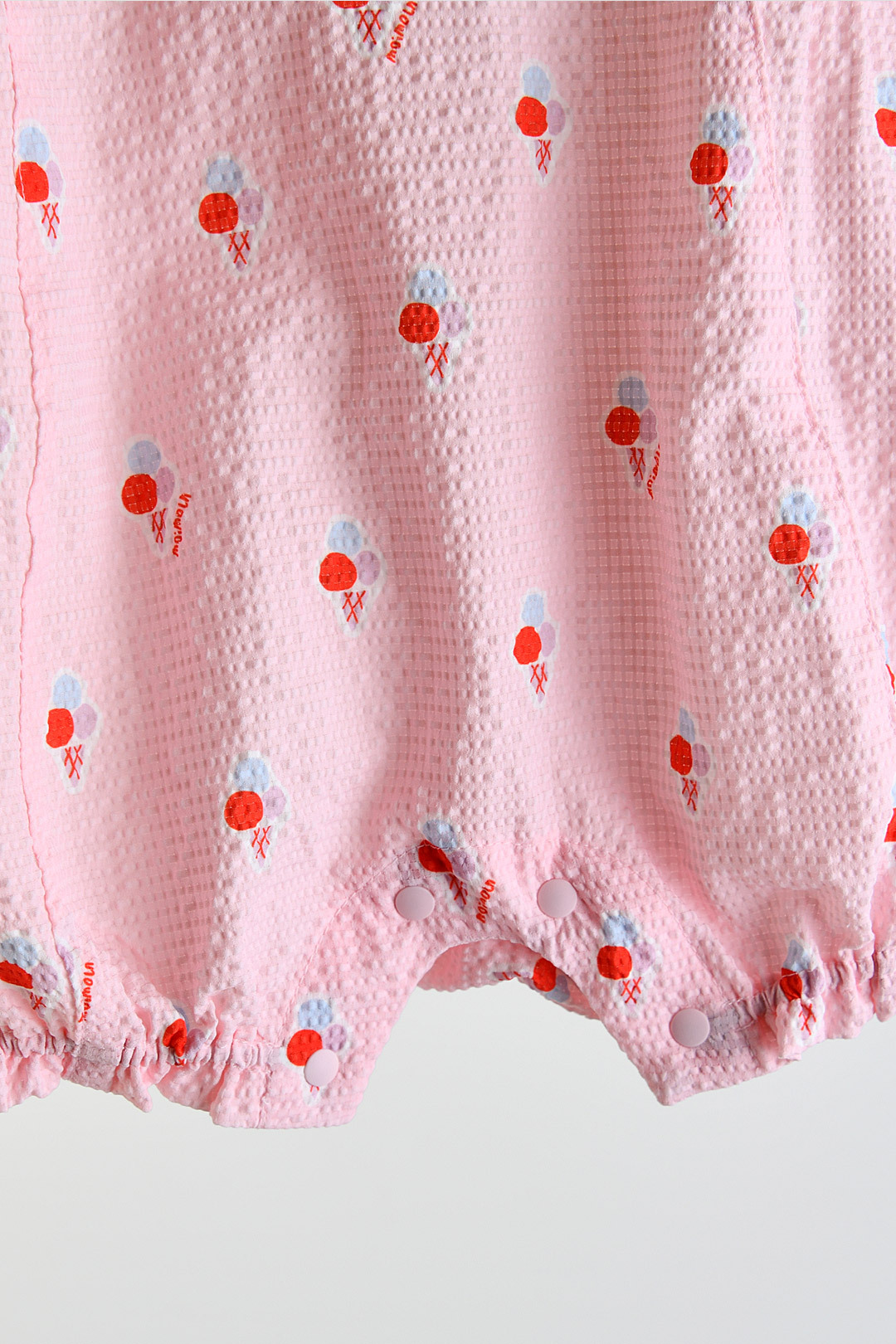 오버올을 레이어드한 듯한 유니크한 디자인의 시원한 시어서커 베이비 우주복