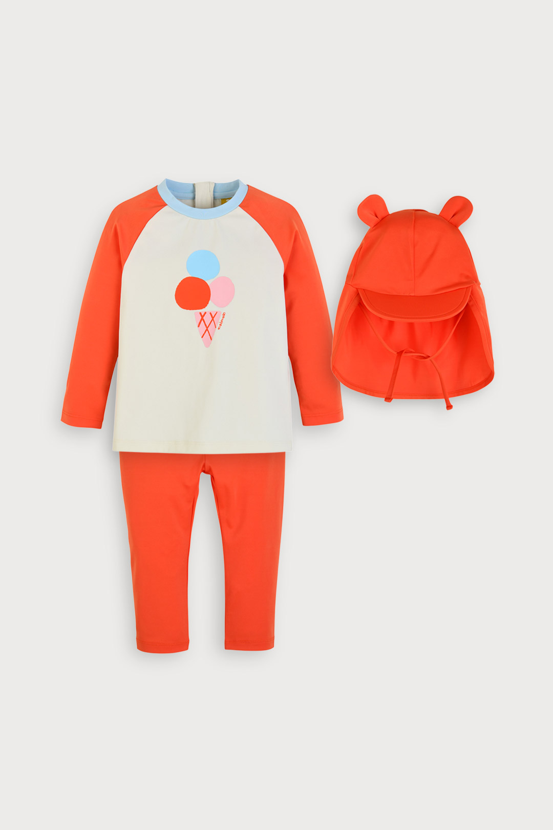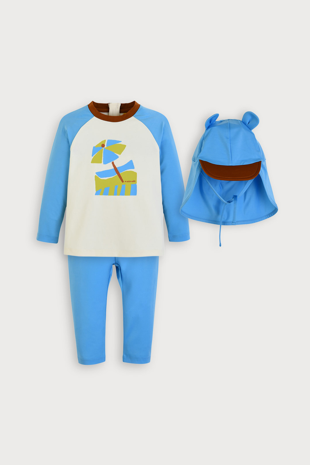 모자세트로 실용성을 높였으며 충분한 9부 기장감으로 안전하게 물놀이 가능한 아이템.