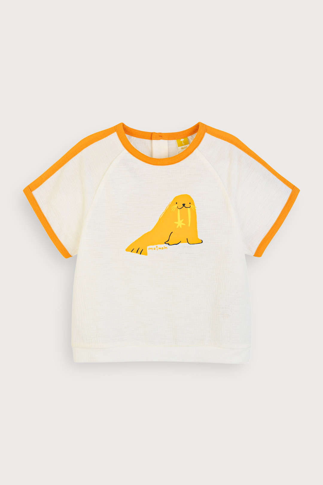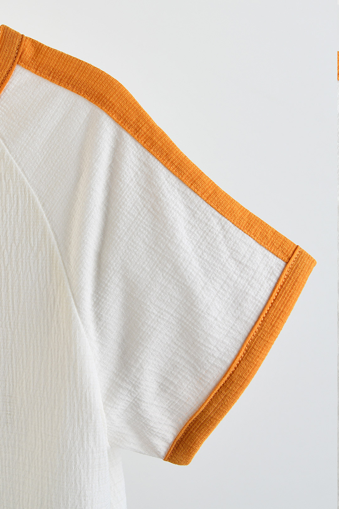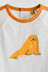 솔리드 컬러의 하의에 상의 배색 포인트를 더해 스타일을 살렸으며, 귀여운 모티브 나염 디테일이 더해져 데일리룩에 포인트를 주는 아이템.