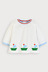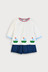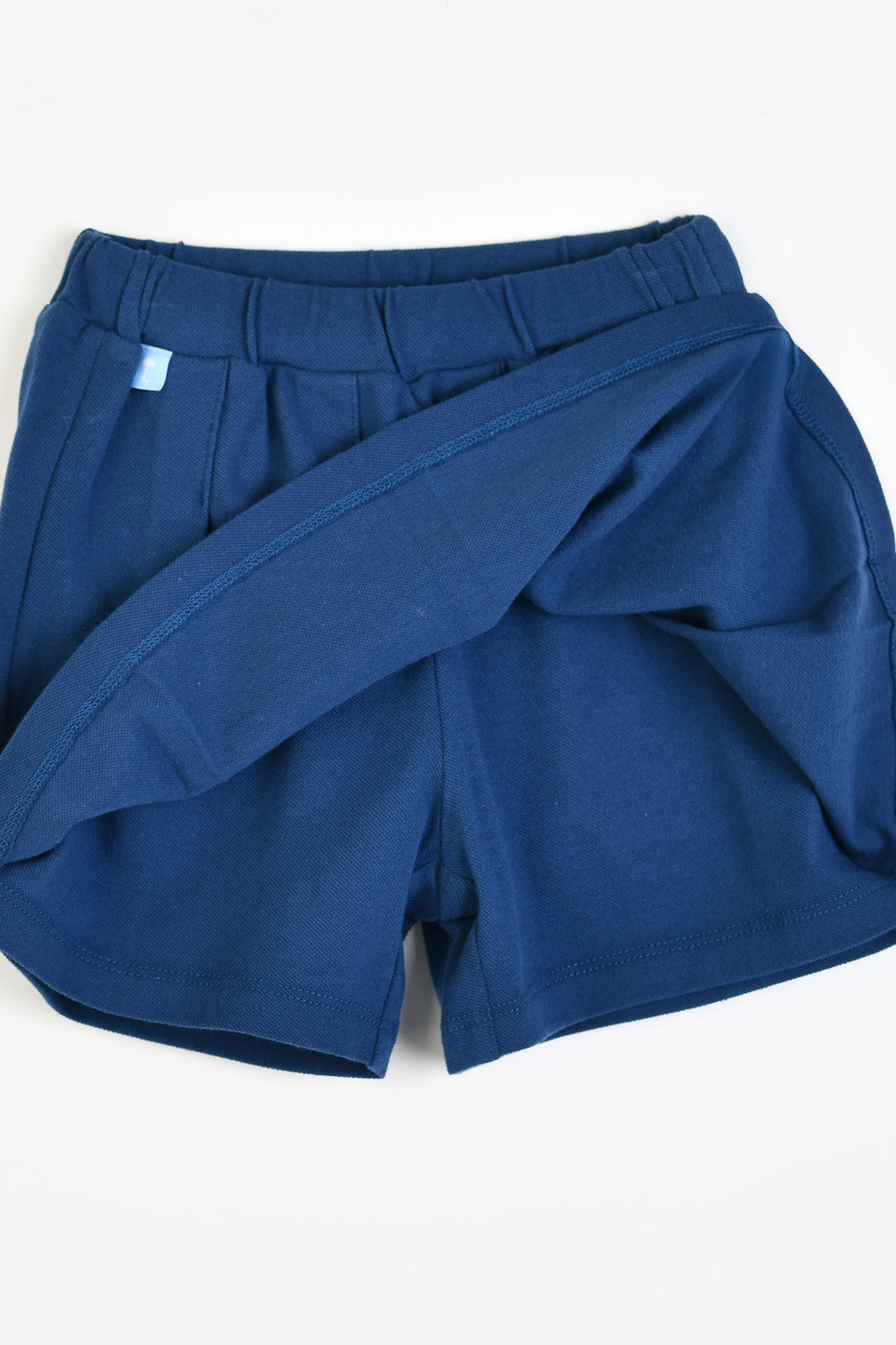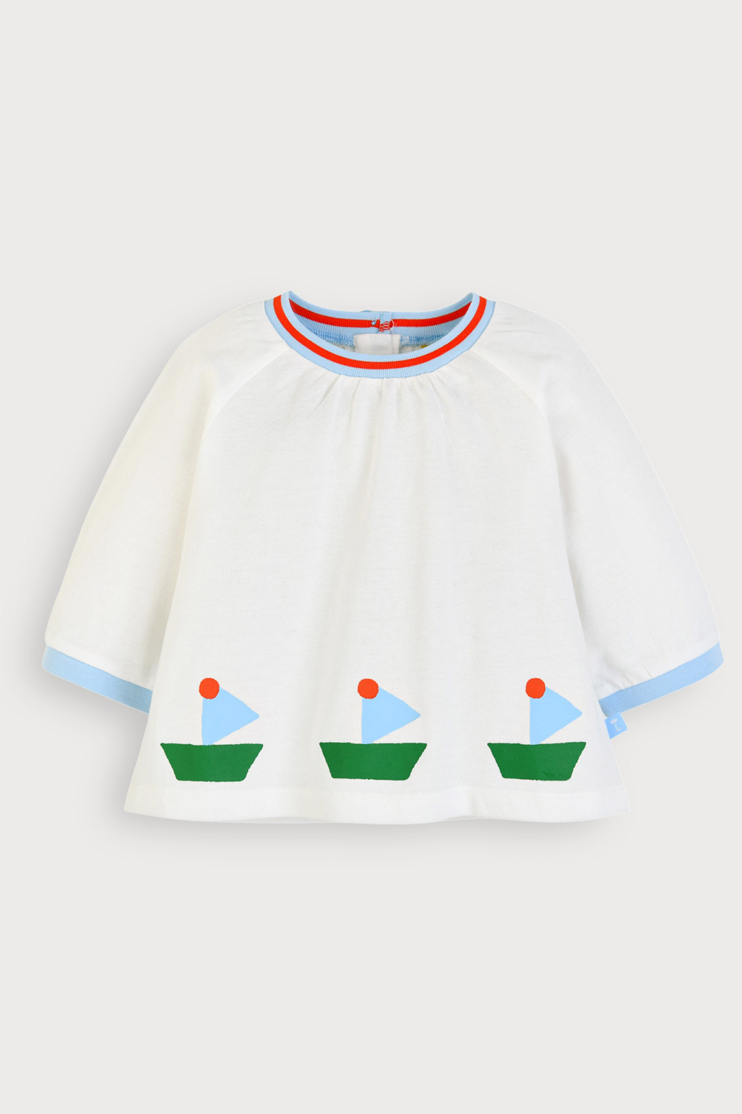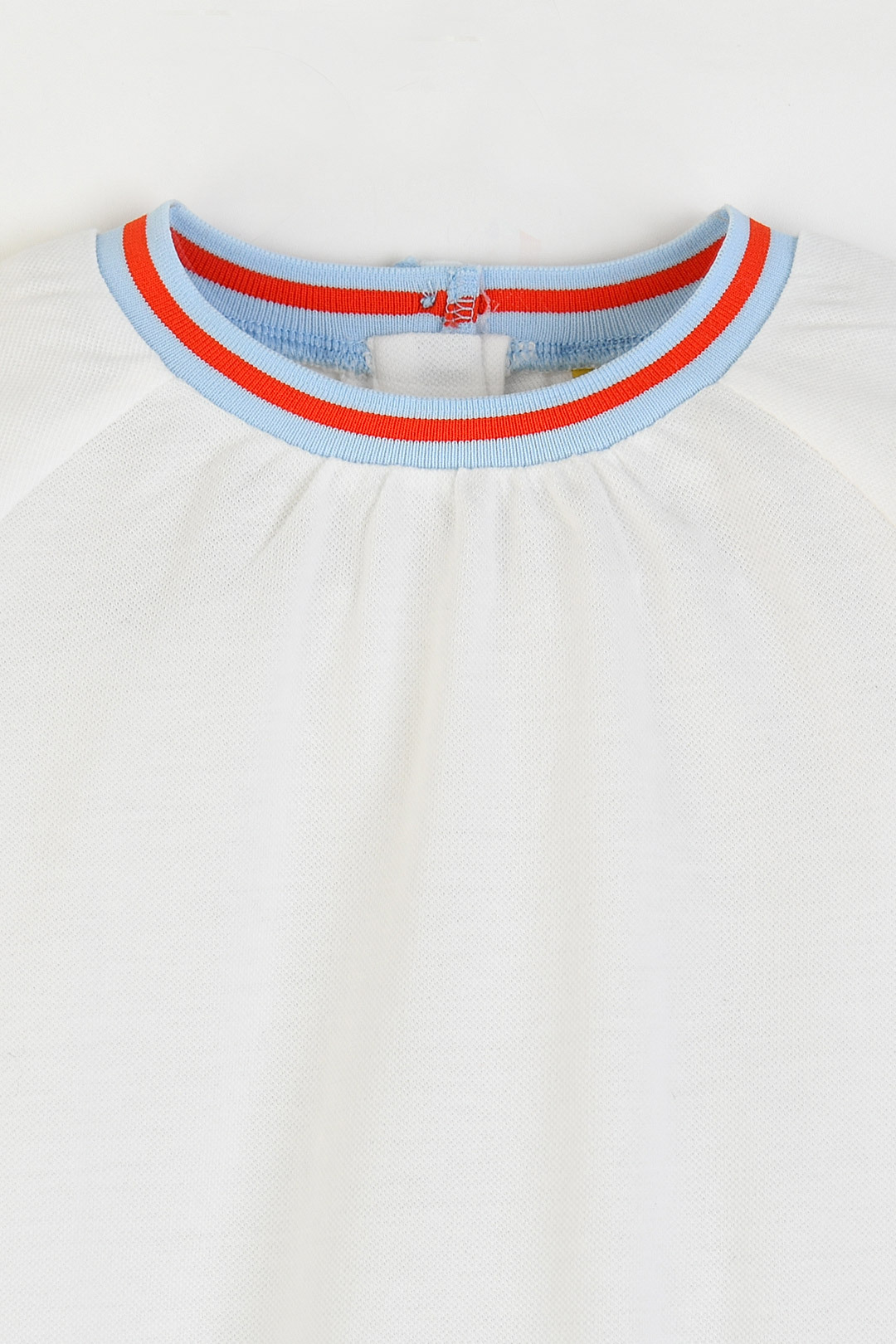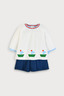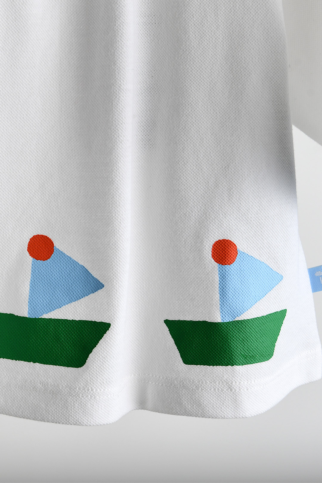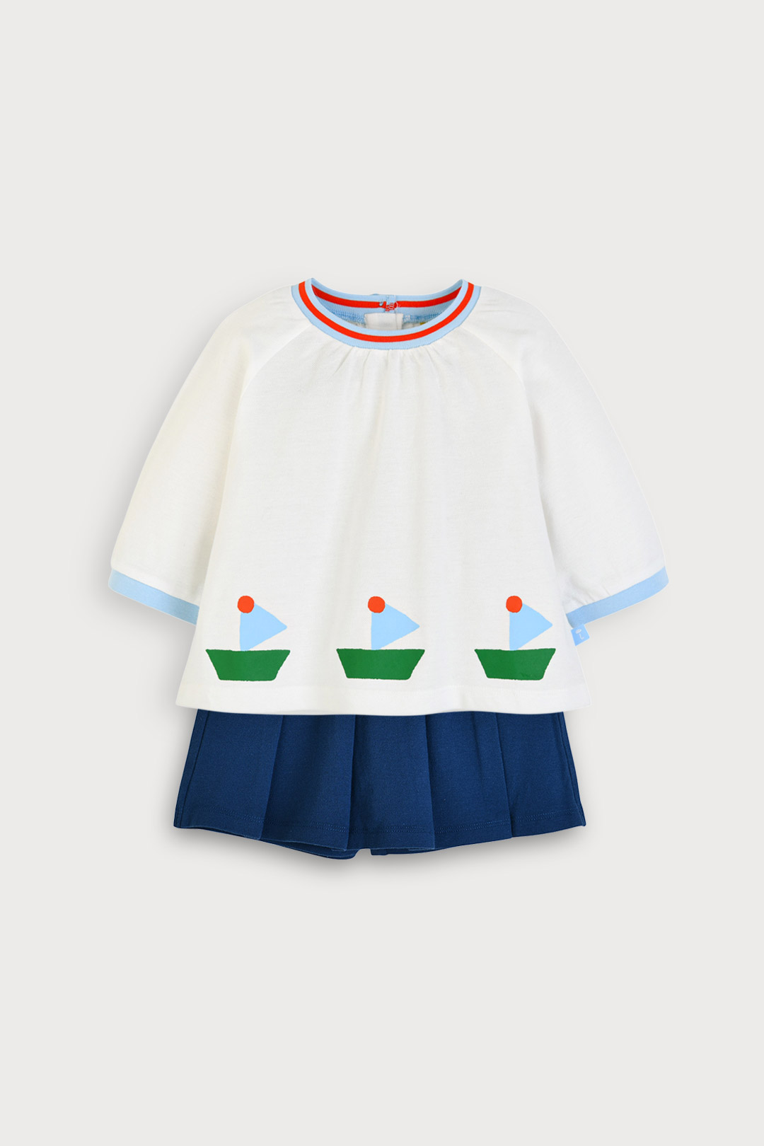 시원한 피케 소재의 상하복으로, 화이트 바닥에 대비되는 블루네이비 컬러의 팬츠를 매치하여 시즌감을 높이고, 상의 하단에 귀여운 돛단배 모티브로 세일러 느낌을 주는 아이템. 치마바지 형태의 팬츠로 활동성 좋지만 귀여움을 더하며 넥라인에 사용한 요꼬 시보리가 포인트.