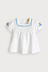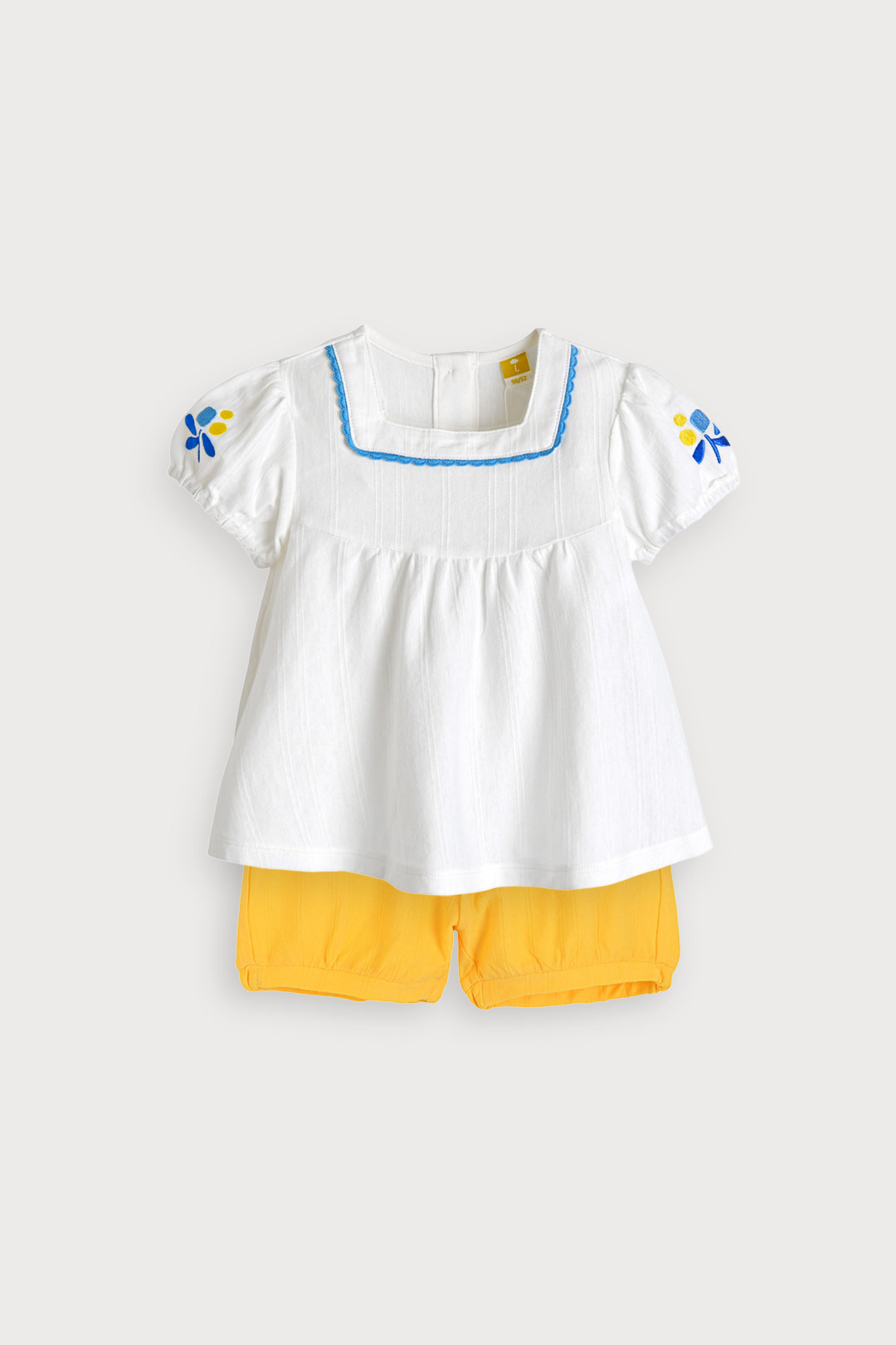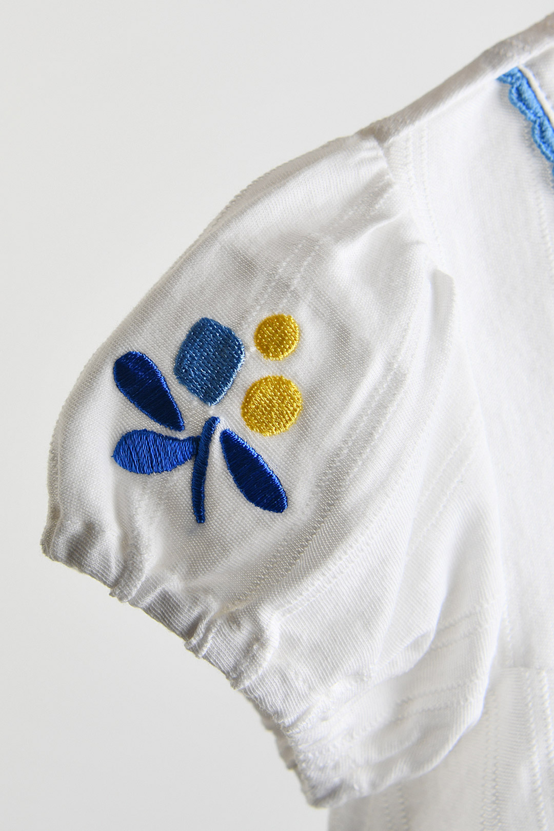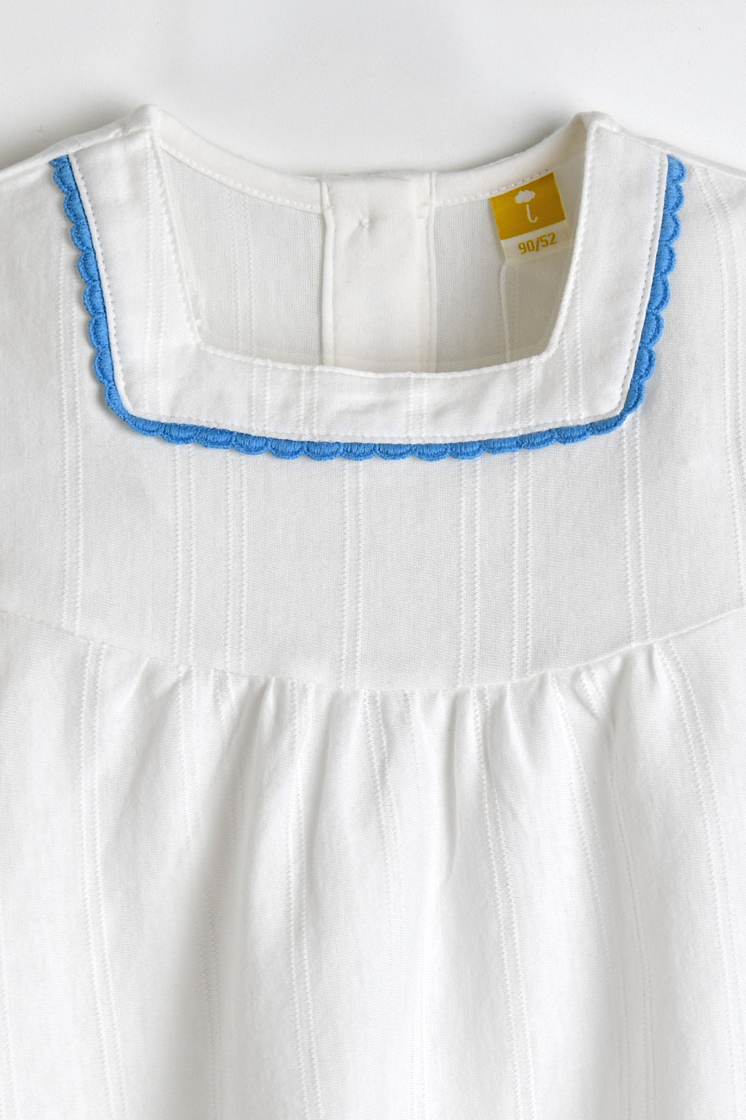 4부 블루머 하의로 귀엽고 편안하며, 스퀘어 넥 라인과 비비드한 블루 컬러 레이스로 귀여움을 더해 주었으며, 소매의 열매 모티브 자수로 앙증맞은 포인트를 더해준 아이템.