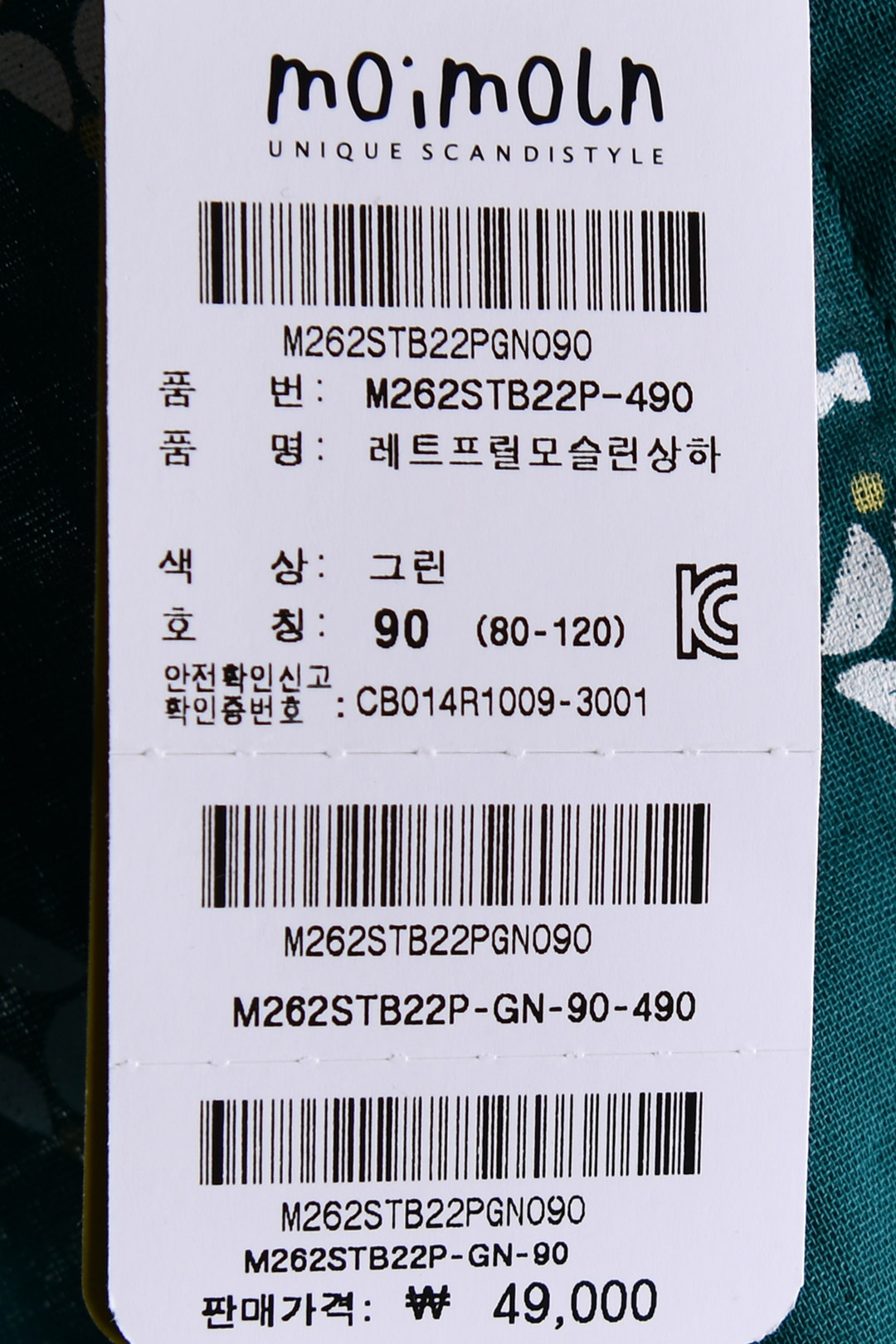 제품소재 (겉감)면100%