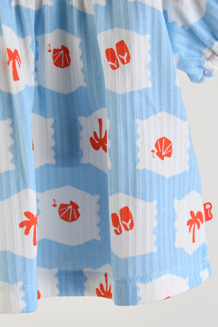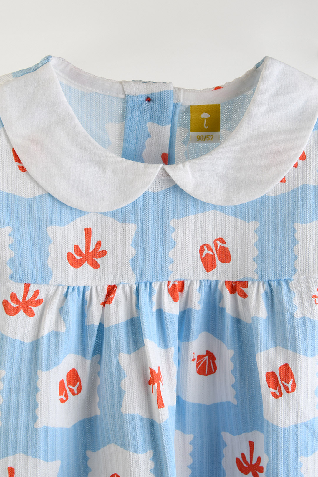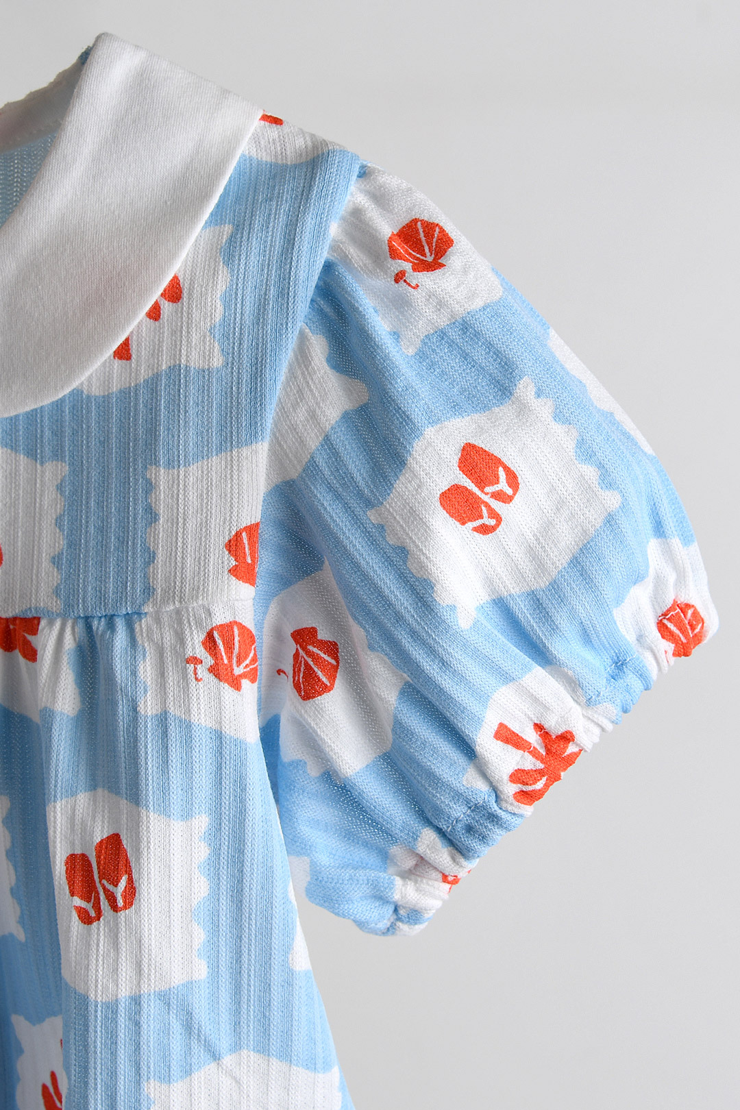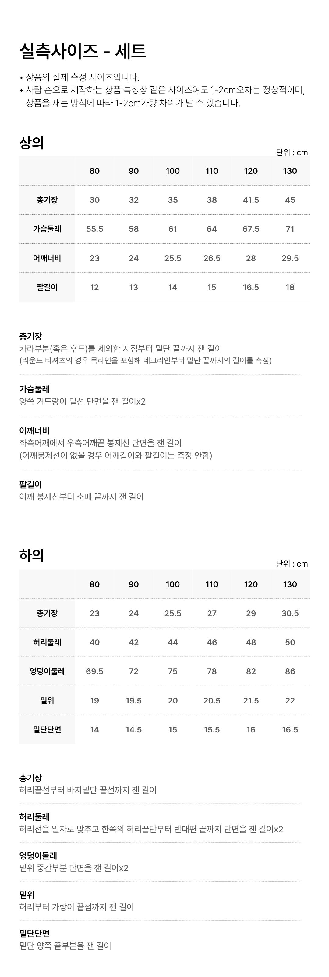 둥근 카라와 퍼프 소매 디자인으로 귀여운 실루엣을 연출 상의 4부와 하의 3부 구성 하의는 블루머 핏으로 제작되어 귀여운 착용감 사이즈별 단추 개수: 80, 90, 100호 2개, 110, 120호 3개 수축 방지를 위해 저온 단독 세탁을 권장 건조기 및 아이롱 사용 금지