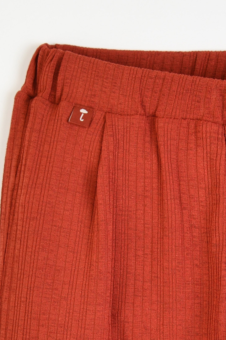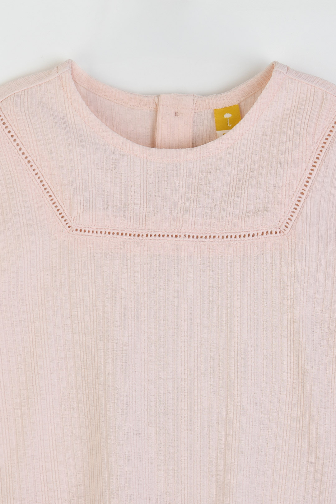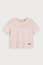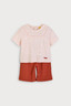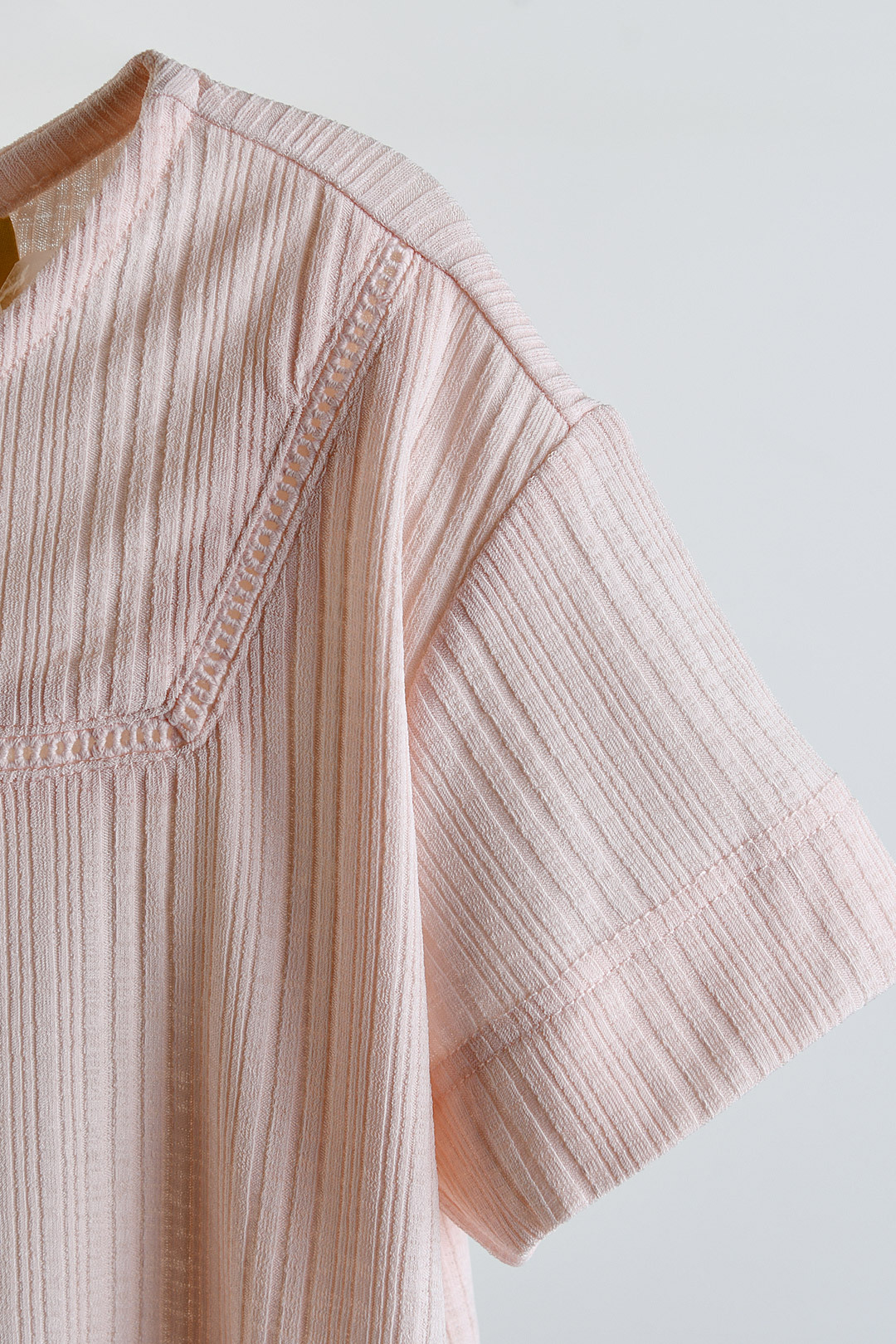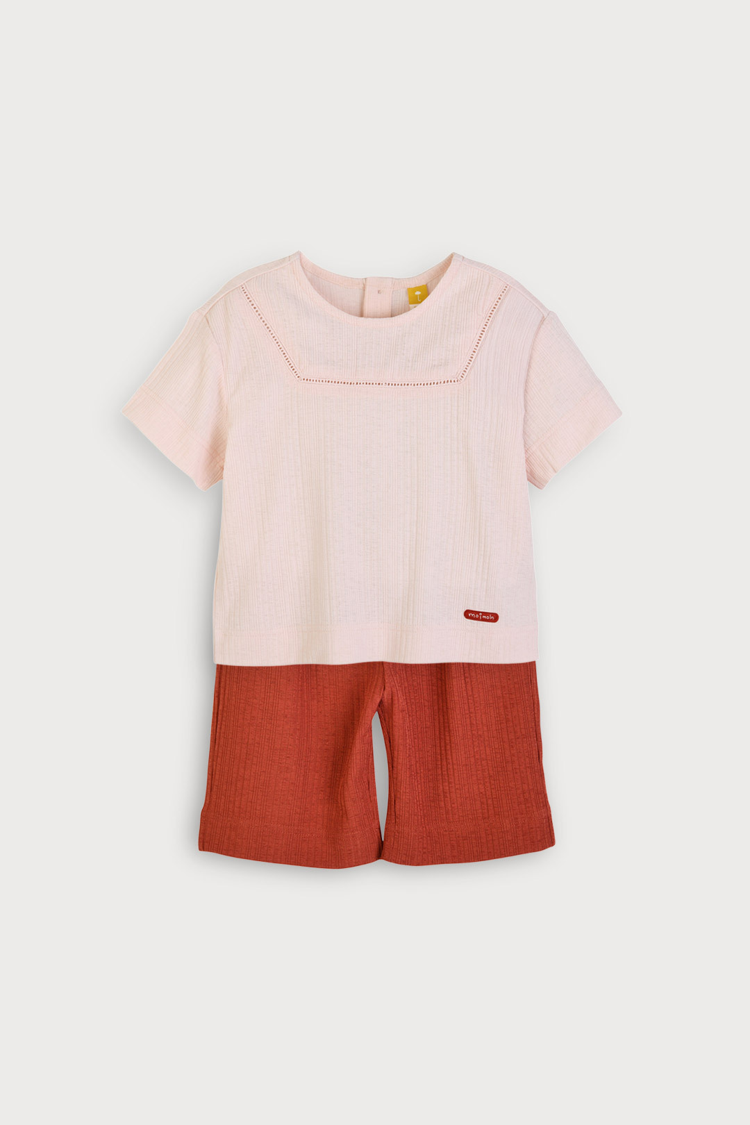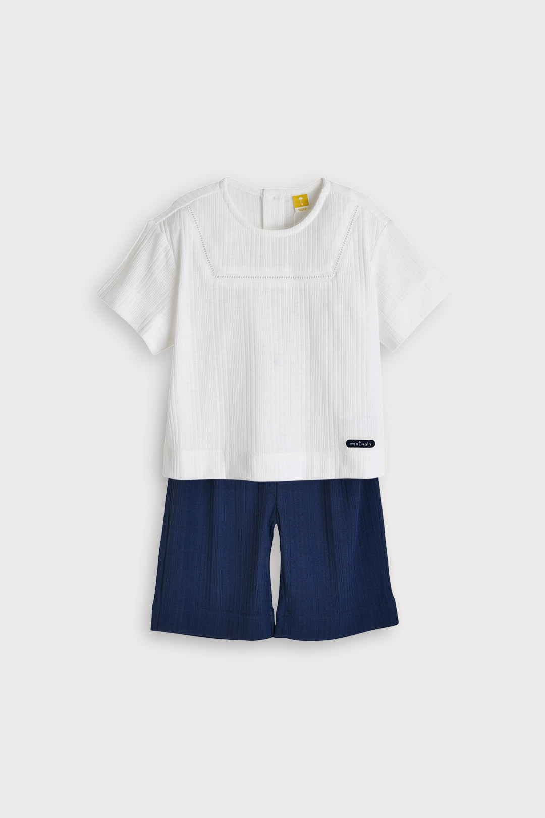 찰랑이고 피부에 붙지 않아 시원한 골지 냉감소재를 사용한 상하 7부 상하복으로, 깔끔한 네이비, 무드있는 카멜 두가지 컬러로 구성. 상의에 스퀘어 라인으로 들어간 사다리 레이스와 티셔츠 밑단에 둥근 바 형태의 로고 직조 라벨이 포인트.