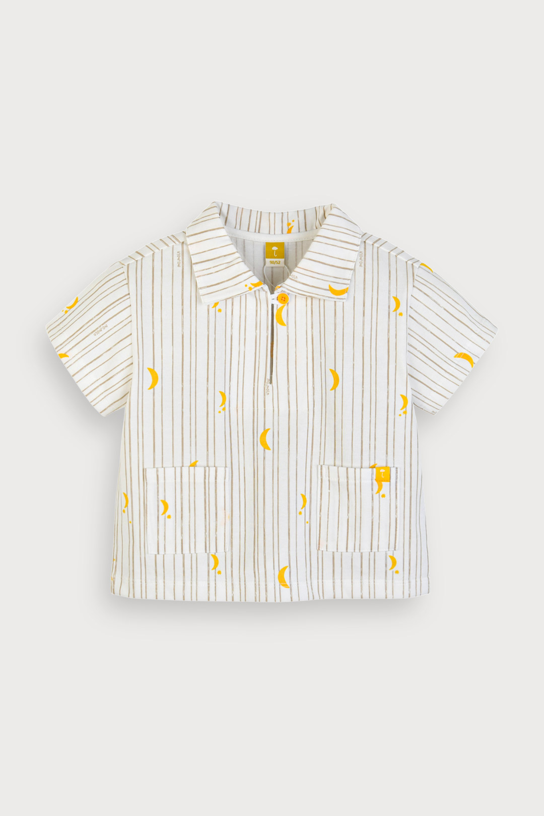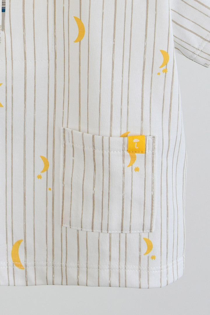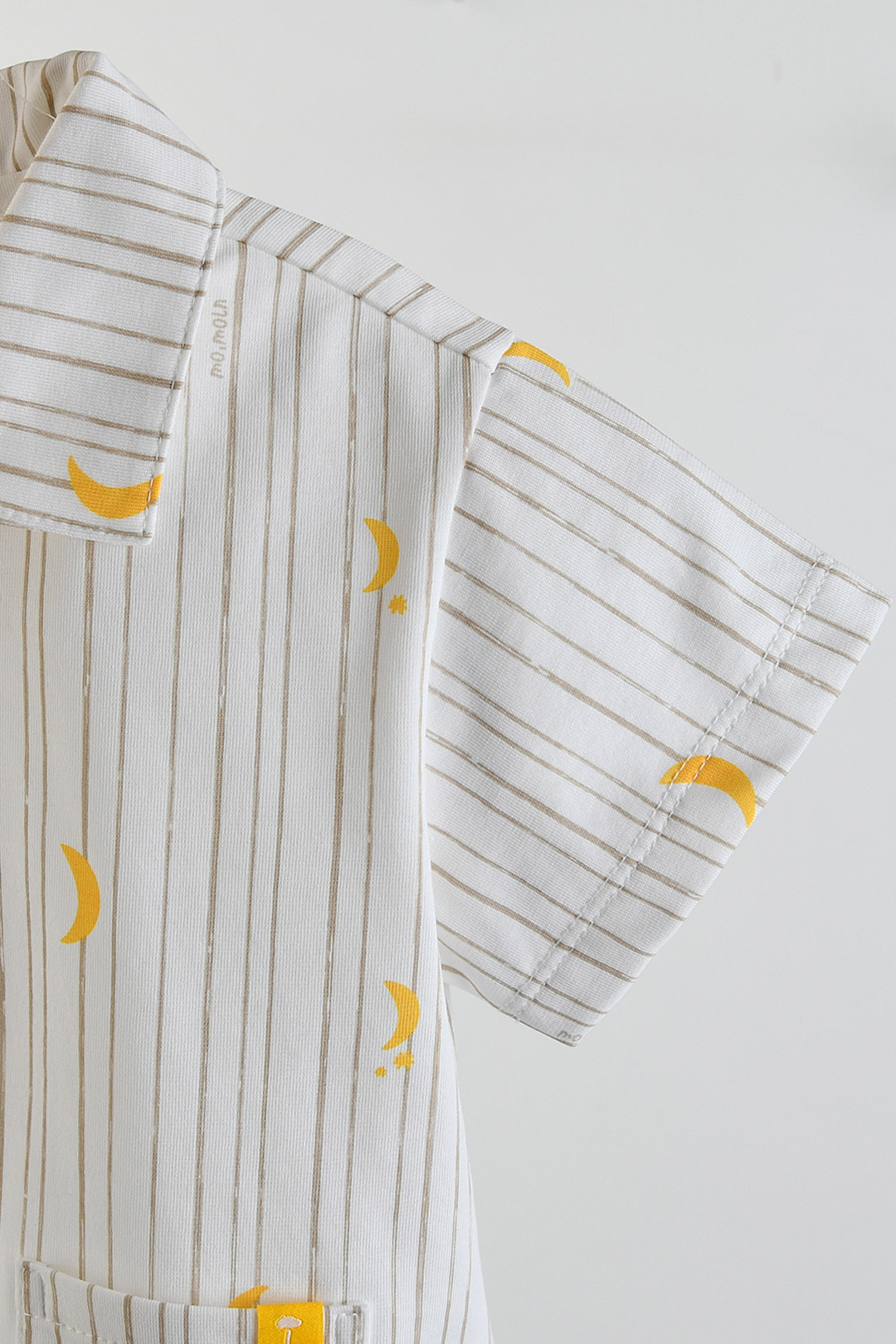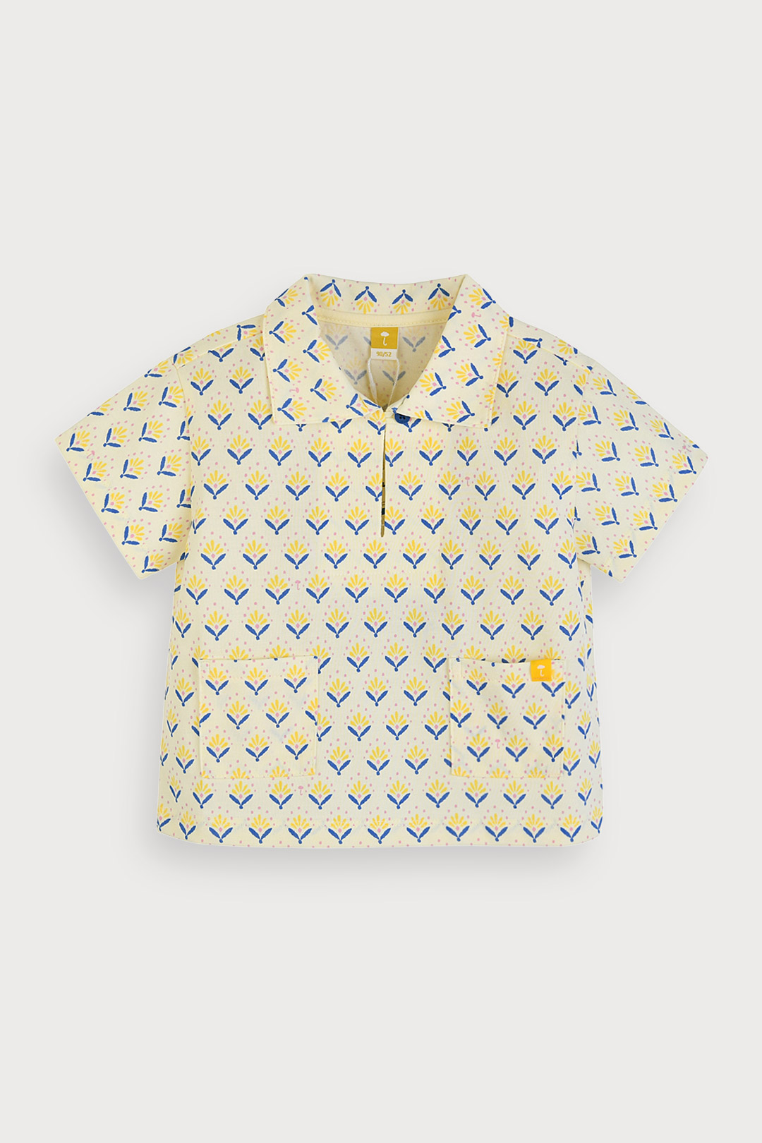 땀과 열을 빠르게 흡수 및 확산하는 60수 싱글 쿨에버 소재 사용 입고 벗기 편리한 앞트임 단추 여밈 디자인 단정한 인상을 주는 베이직 카라 디테일 옐로우 톤의 화사한 전판 패턴 나염 손세탁 권장