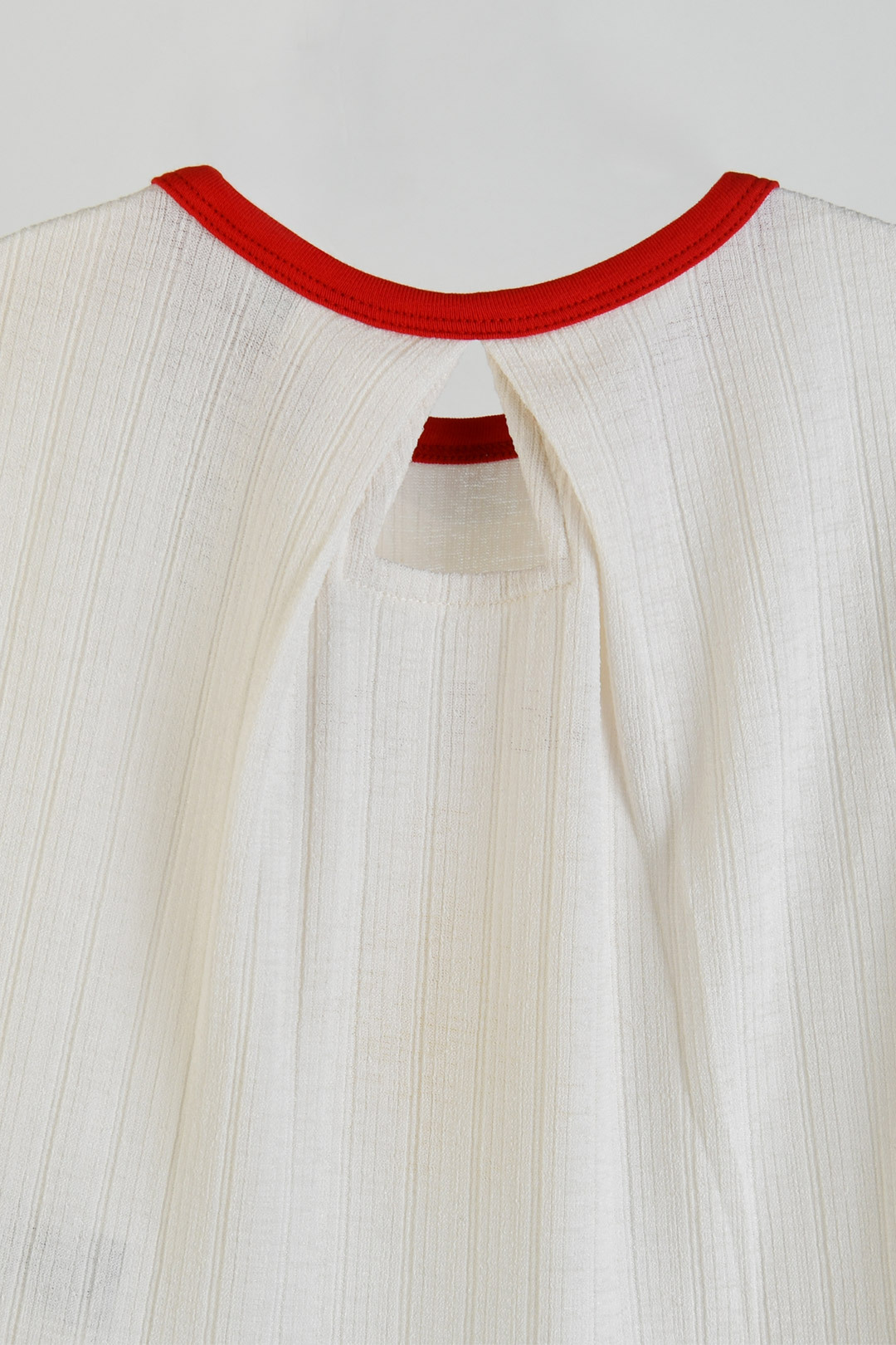 아이보리 컬러는 냉감 소재를 사용하여 쾌적한 착용감 선사 라이트블루 컬러는 유니크한 스트라이프 니트라이크 소재 적용 등판의 삼각 트임 디테일로 시각적인 포인트와 통기성 확보 여유 있는 소매 라인 설계로 활동성 극대화 80 및 90 사이즈는 어깨 스냅 2개가 있어 착탈의가 간편함 원단 보호를 위해 손세탁을 권장합니다