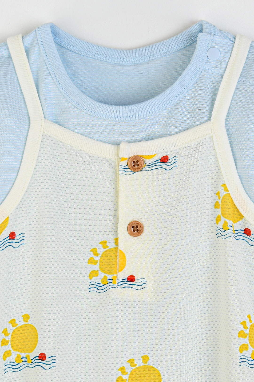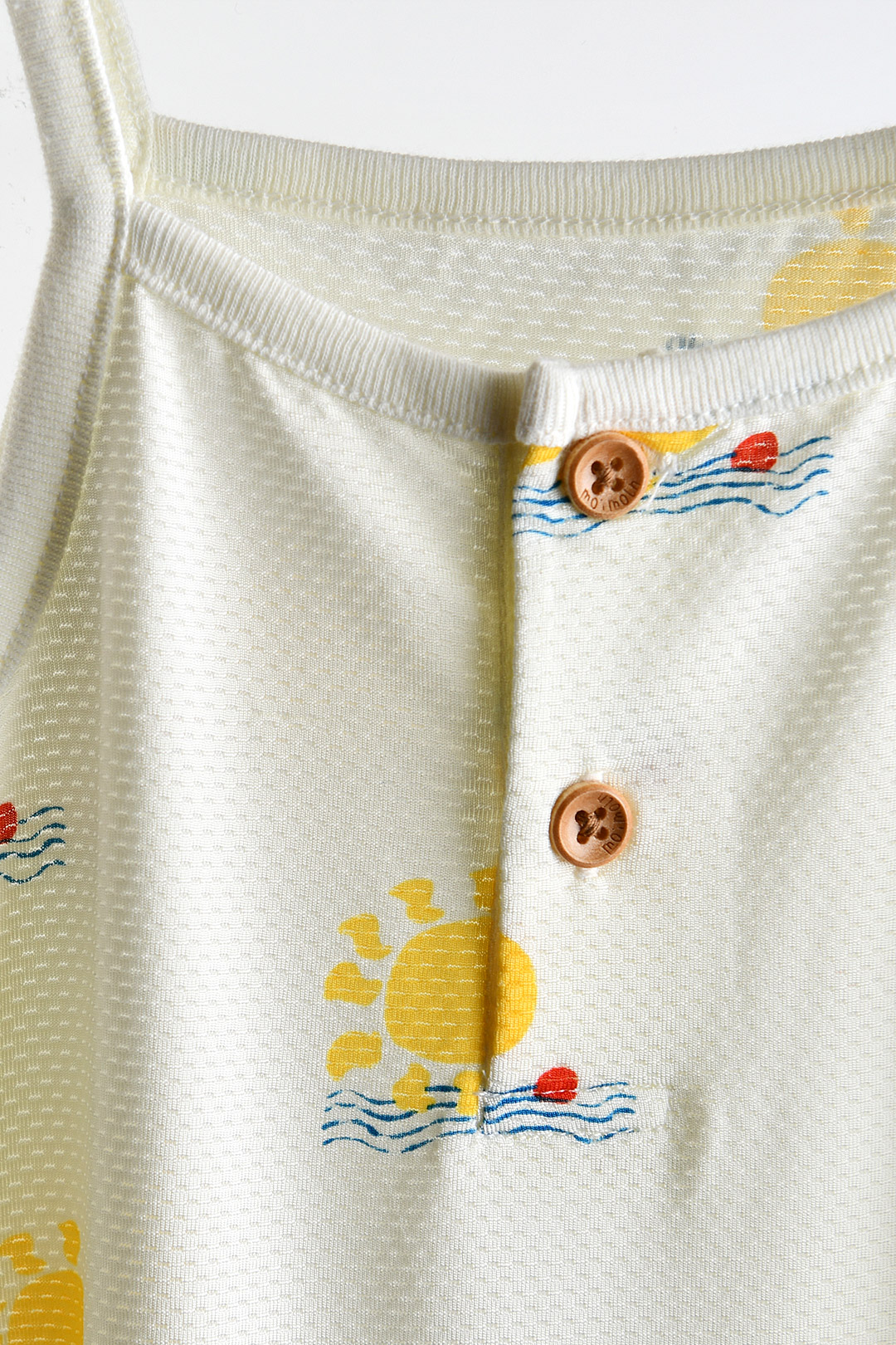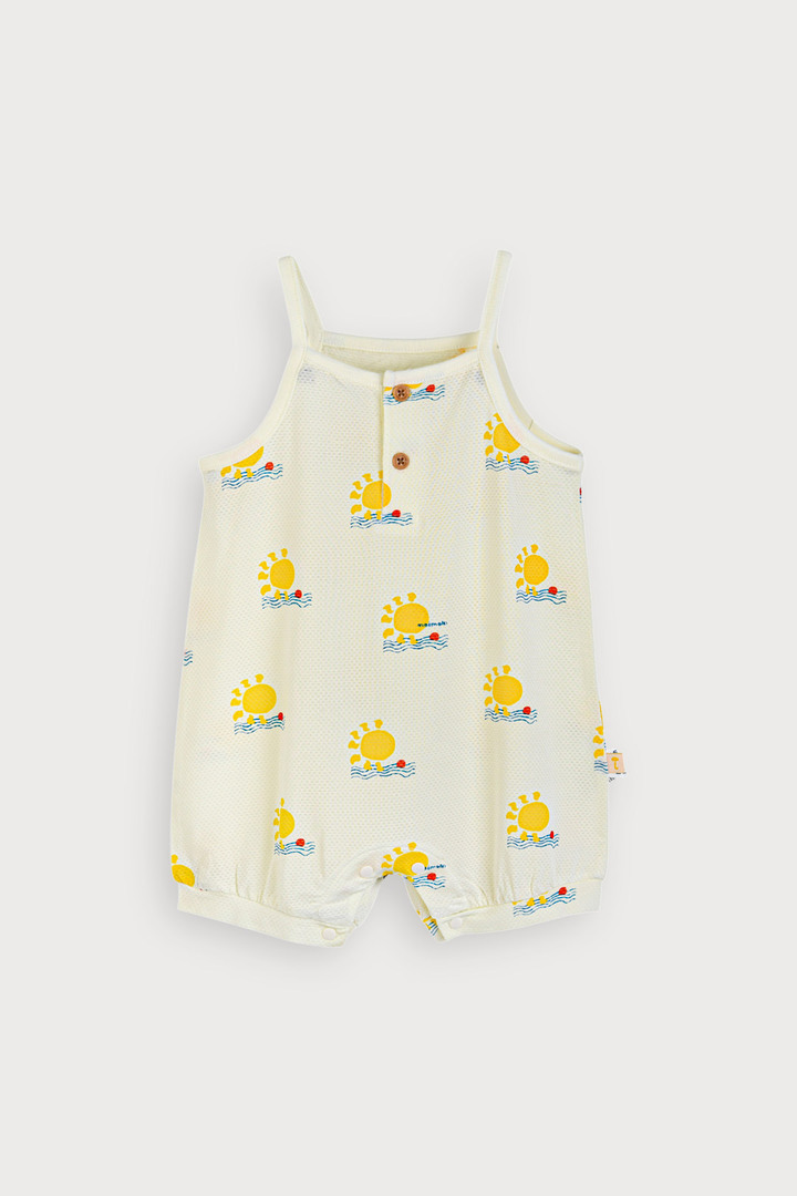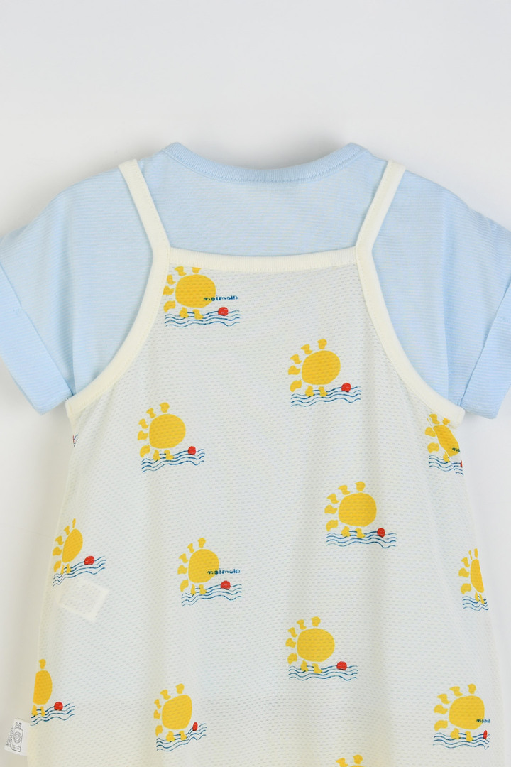 상의는 어디에나 매치하기 쉬워 아기와 유아의 데일리 코디에 활용하기 좋으며, 우주복은 통기성이 좋아 시원하고 편안하게 착용할 수 있고, 선명한 컬러감과 해 모티브 나염, 나무 단추 포인트가 어우러져 모이몰른만의 밝고 경쾌한 여름 무드를 담은 아이템.
