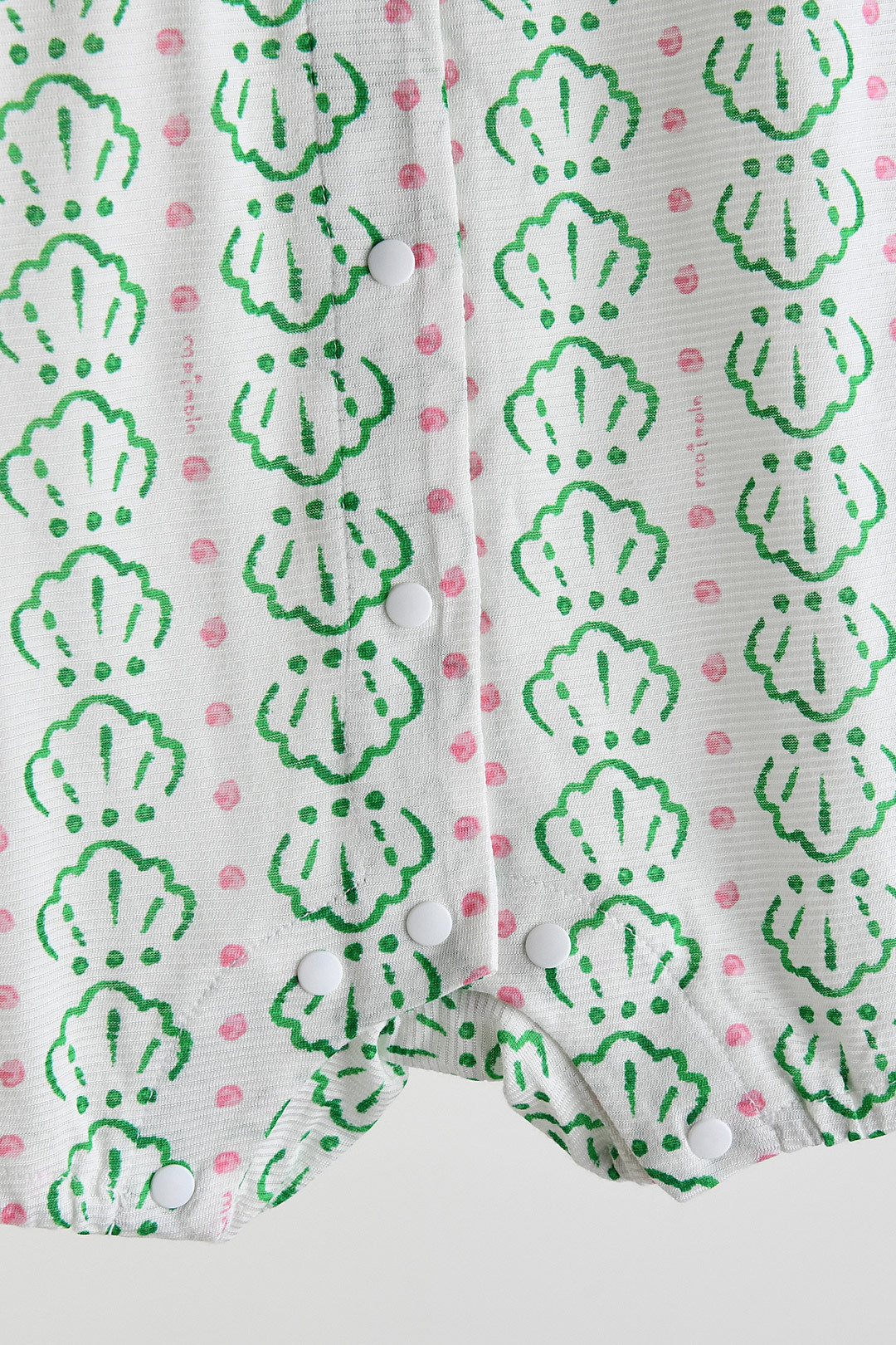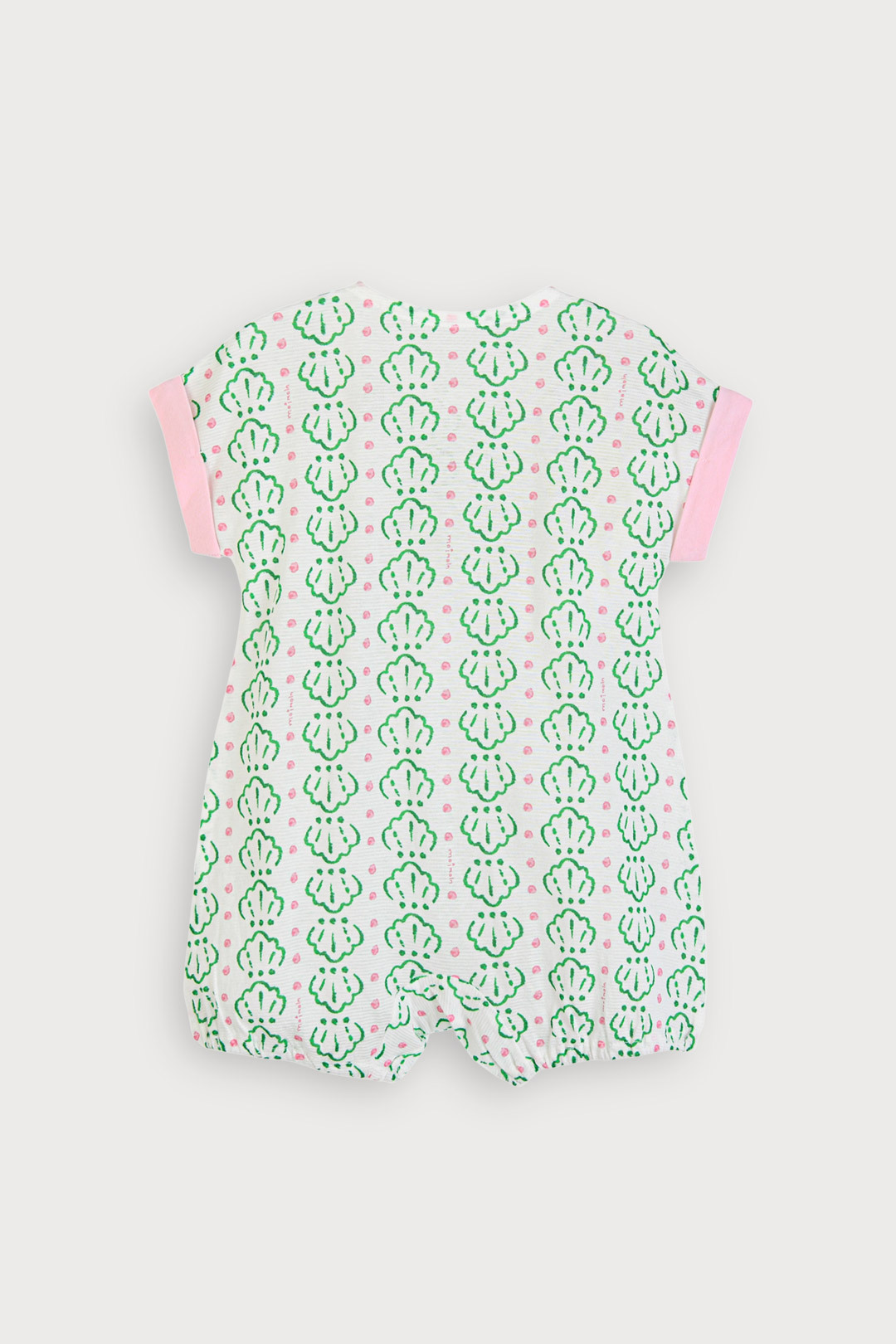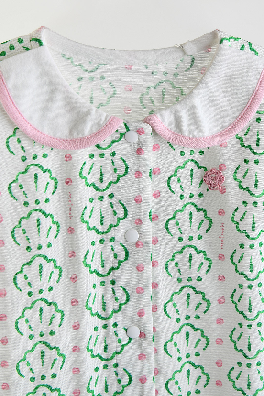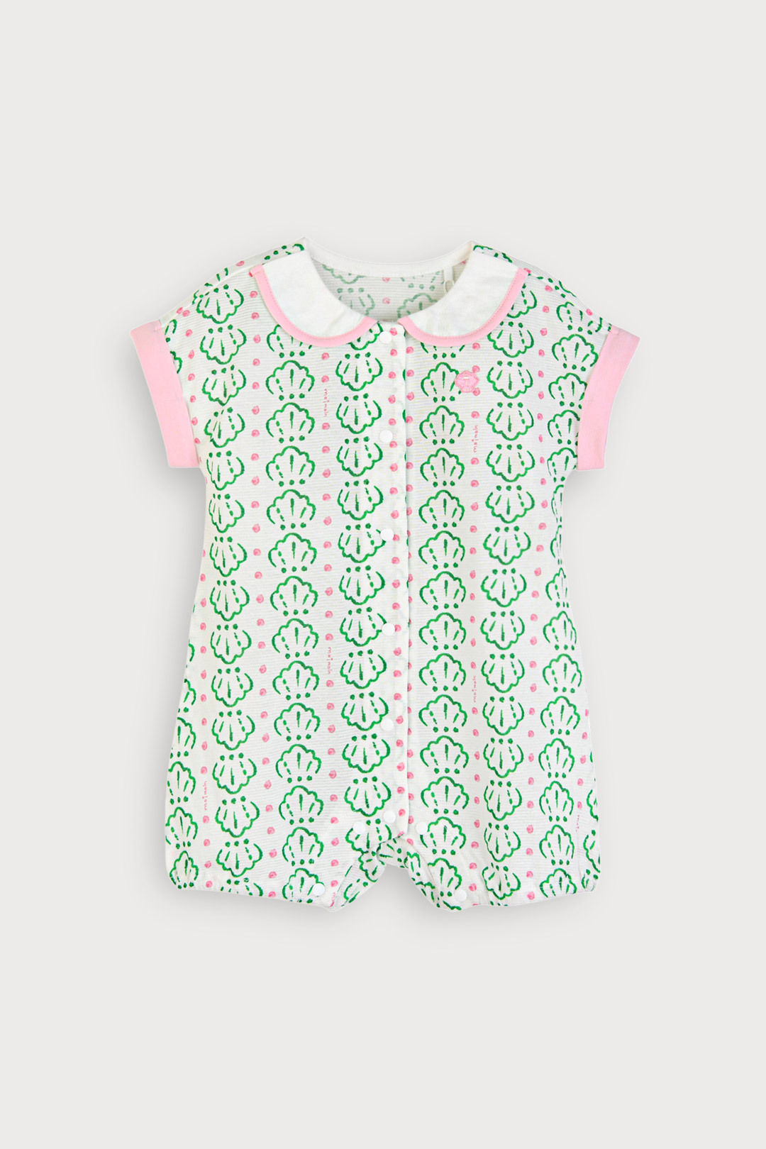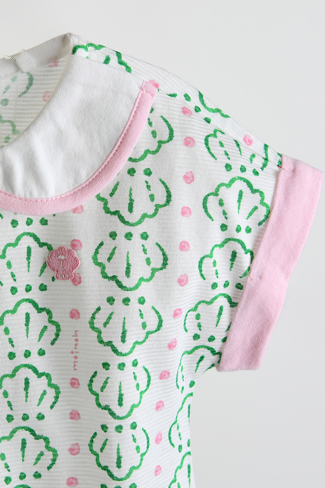 통기성이 우수해 활동량이 많은 날에도 시원하고 편안한 착용감을 제공하며, 가볍게 입히기 좋은 인견메쉬 소재. 조개 모티브 나염과 핑크 컬러 배색, 화이트 카라 디테일이 어우러져 사랑스럽고 산뜻한 여름 무드를 담은 아이템.