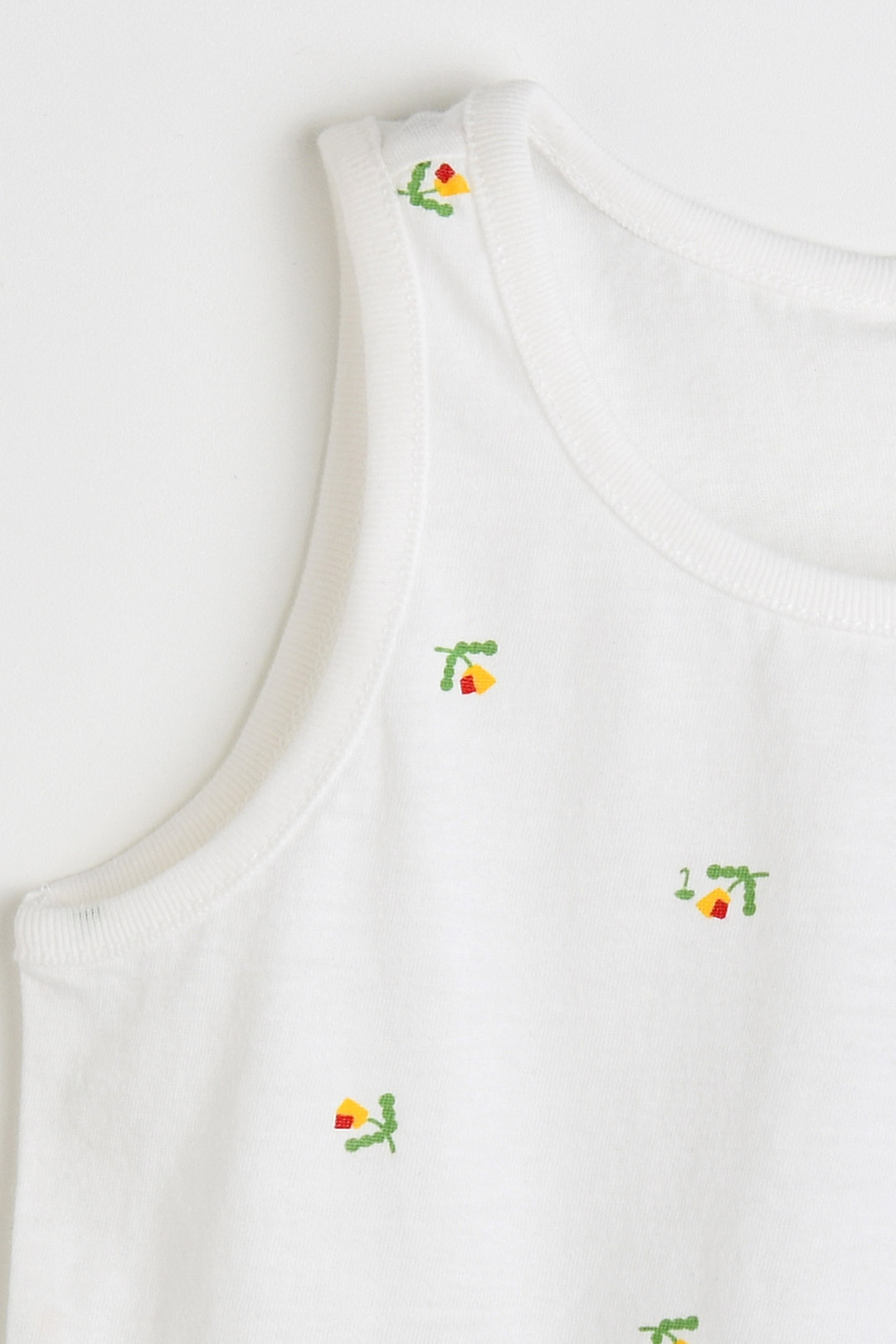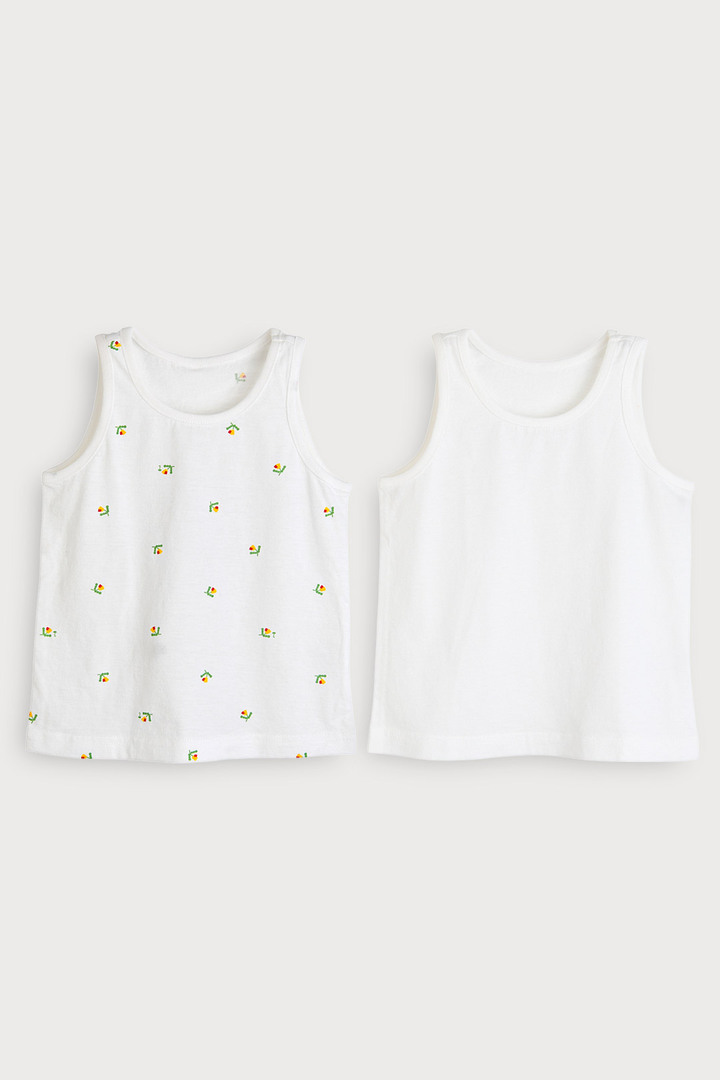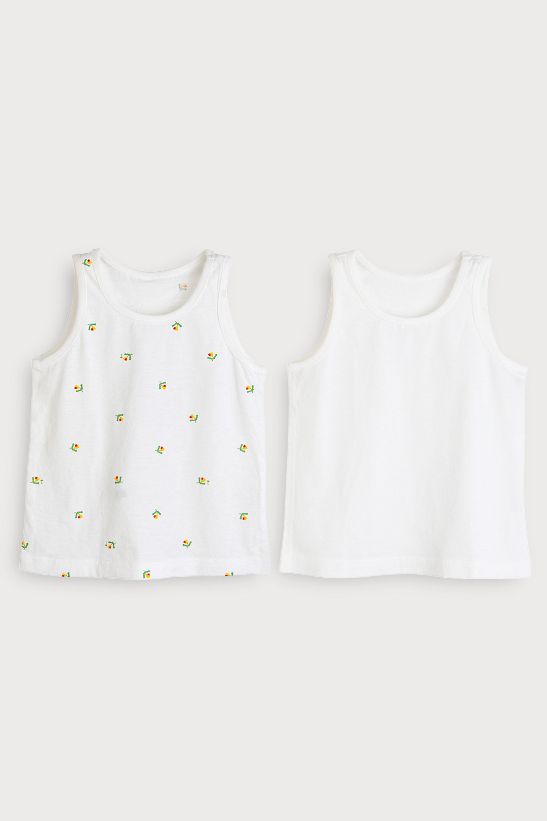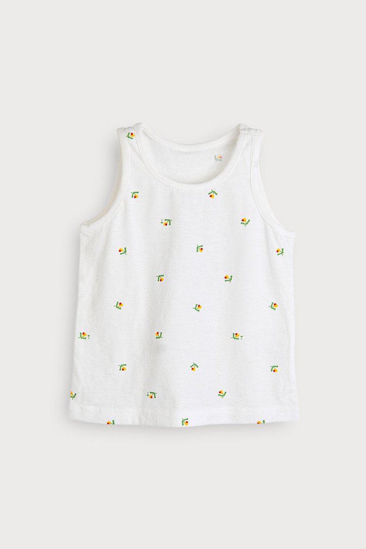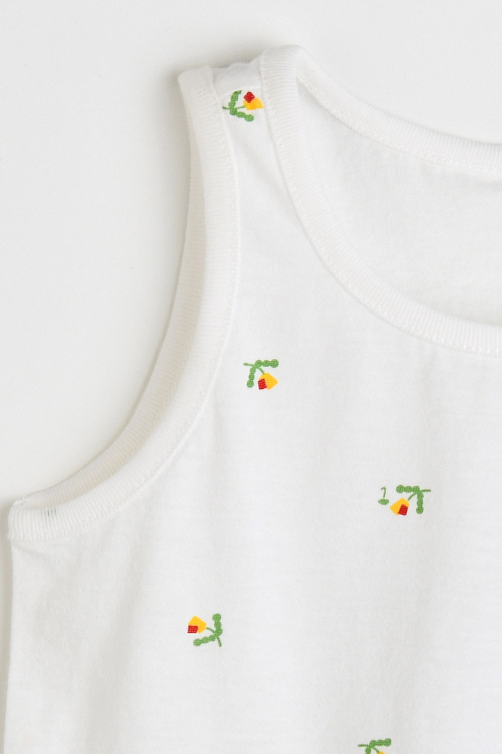 터치감이 부드럽고 스판기가 있어 아이들이 활동하기 편안한 면모달 소재의 런닝 세트. 알록달록한 도형 플라워 모티브가 사랑스럽게 더해진 전판 나염과 어디에나 같이 입기 좋은 깔끔한 런닝으로 구성된 아이템
