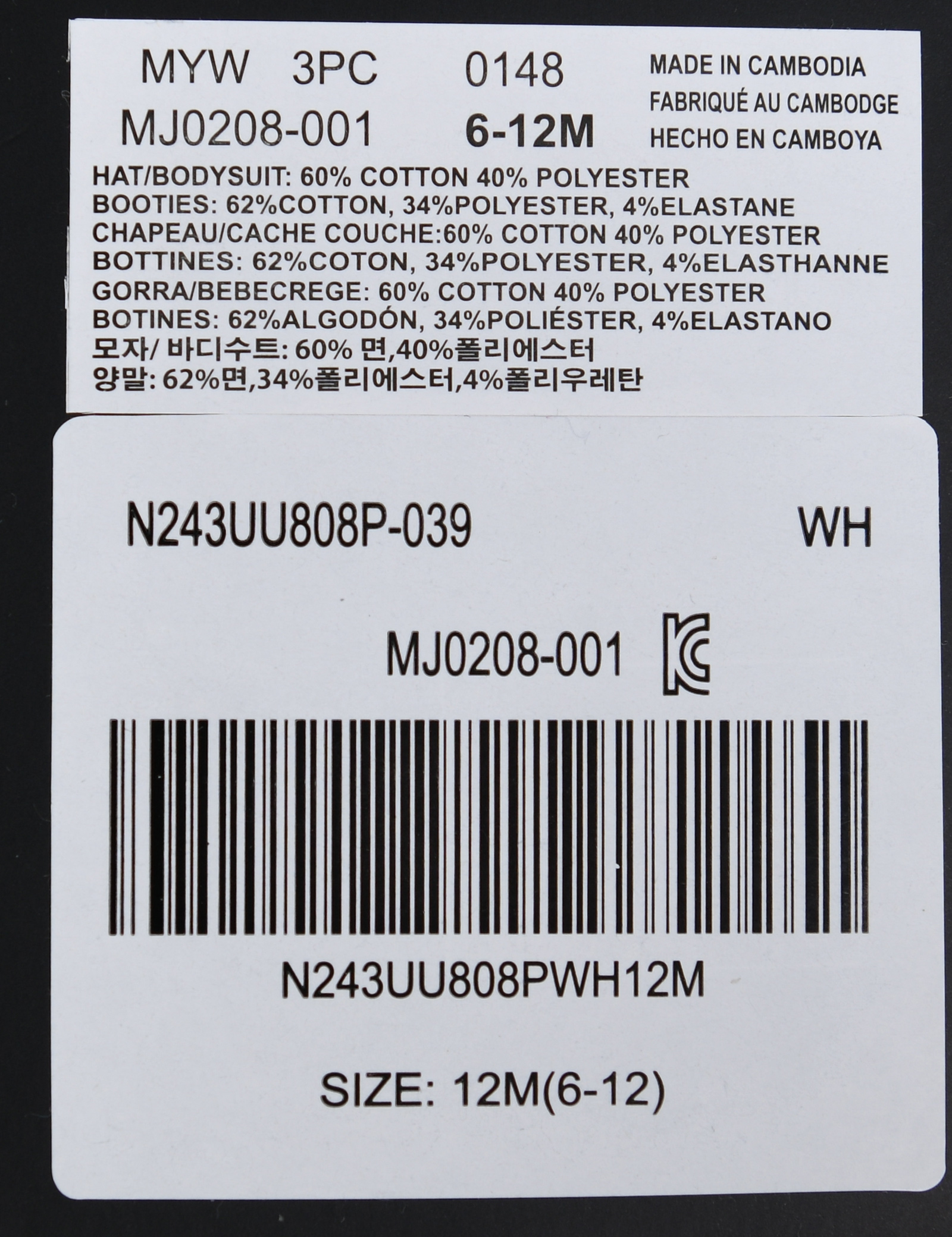 제품소재 (모자/바디수트)면60%,폴리에스터40%(양말)면62%,폴리에스터34%,폴리우레탄4%