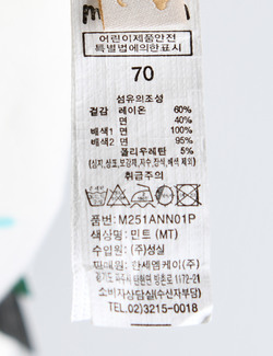 제품소재 (겉감)레이온60%,면40%(배색1)면100%(배색2)면95%,폴리우레탄5%