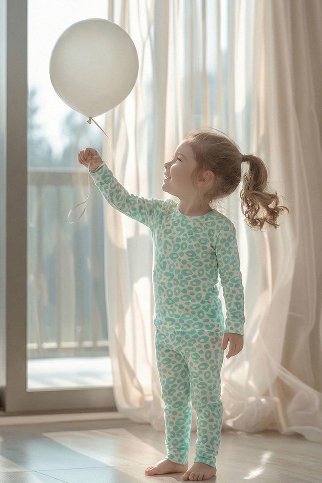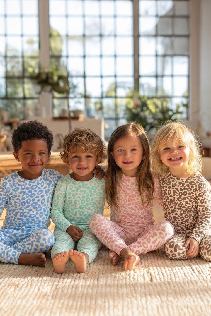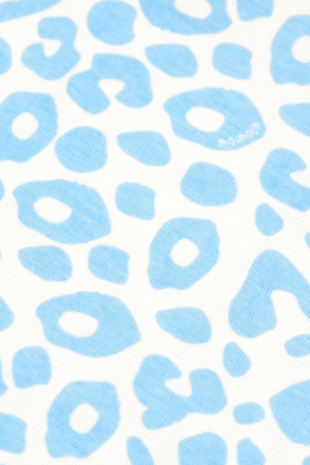 깨끗한 흰색 바탕 위 블루, 민트, 브라운, 핑크 4가지 컬러로 수놓아진 레오파드 패턴은