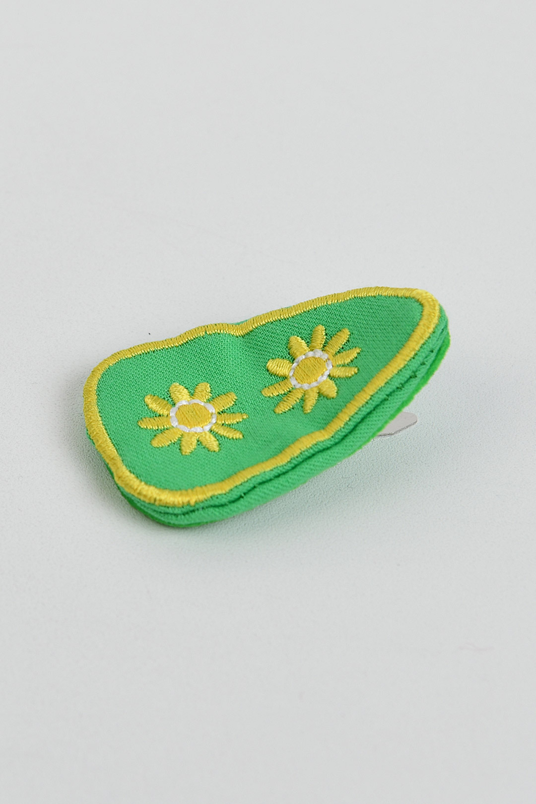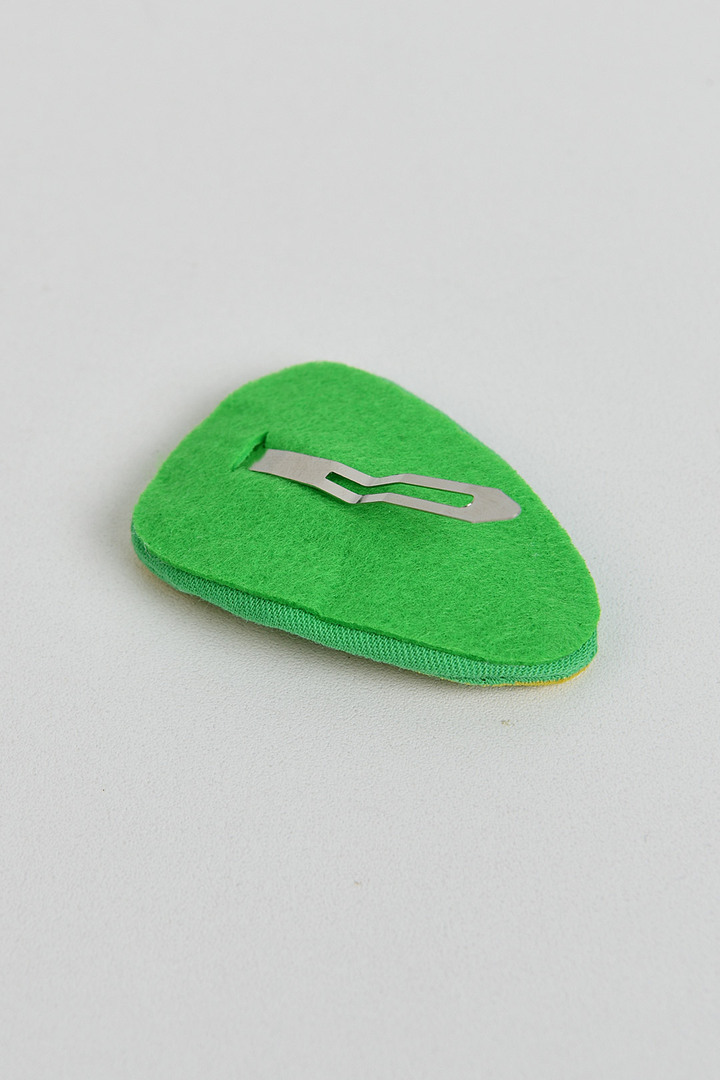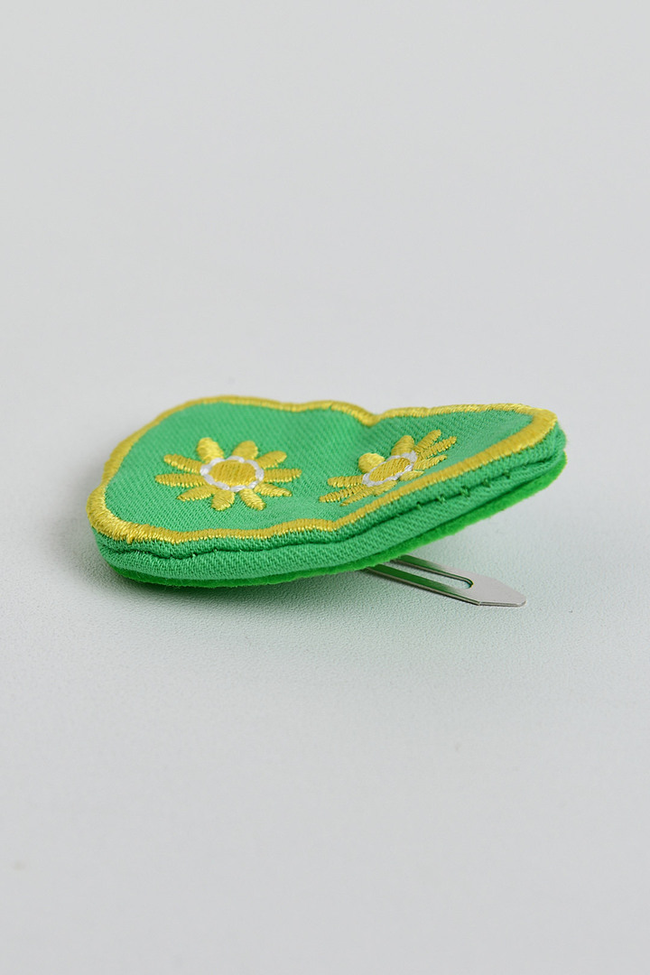 비비드한 컬러감이 돋보이며, 유니크한 자수 모티브로 귀여움을 더해주며, 다양한 아이템과 매칭하여 포인트 주기 좋은 헤어핀. 똑딱핀으로 탈착이 용이한 아이템