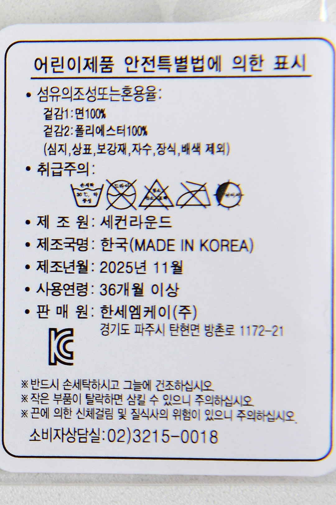 | 제조국 | 한세엠케이㈜ |