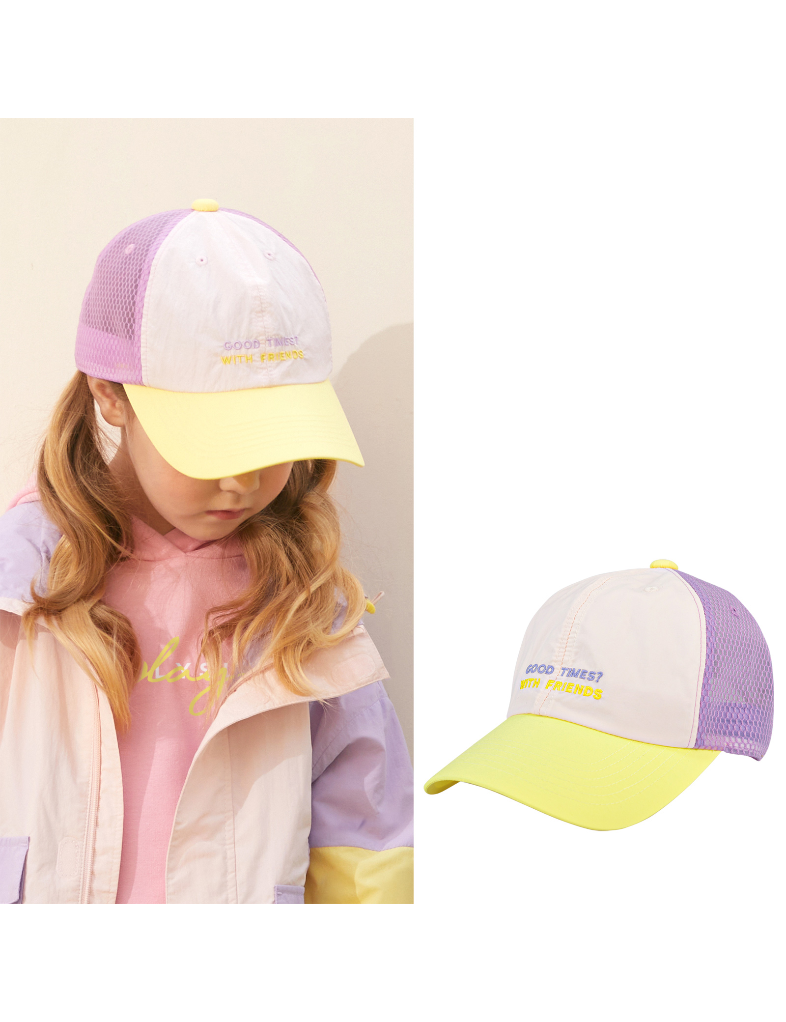애슬래저의 소프트컬러 배색 점퍼와 소재와 컬러를 통일해서 세트처럼 코디 가능하도록 매치한 캡 모자입니다. 여아들이 선호하는 컬러로 캐주얼한 MTM+Denim과 코디해도 예쁜 아이템입니다.