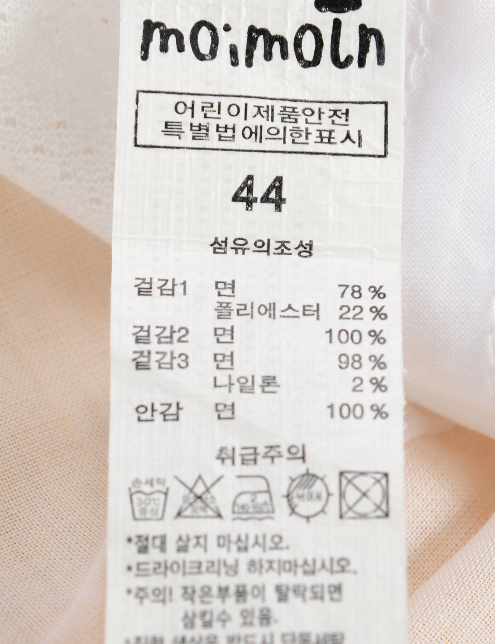 제품소재 (겉감1)면78%,폴리에스터22%(겉감2/안감)면100%(겉감3)면98%,나일론2%