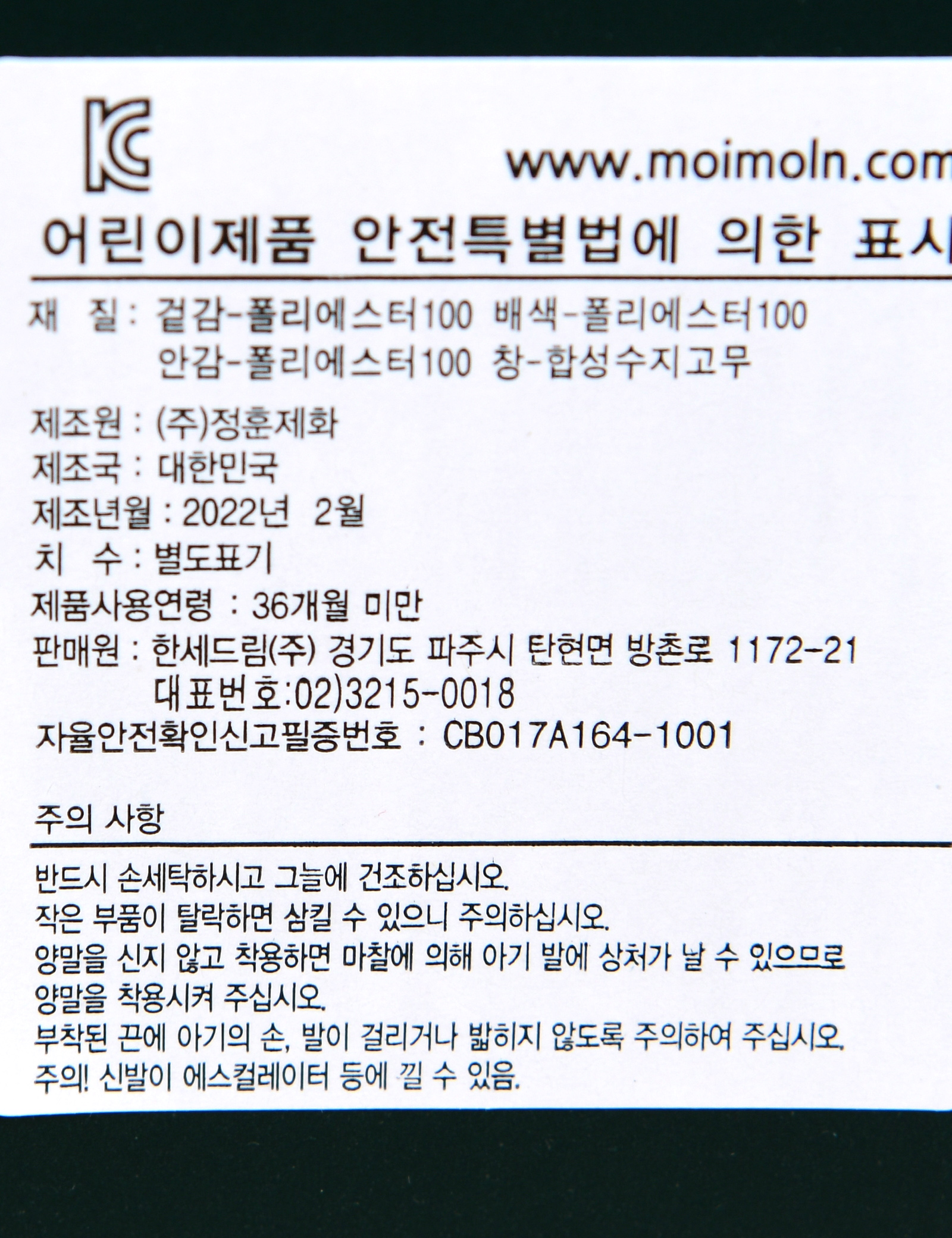 제품소재 (겉감/배색/안감)폴리에스터100%(창)합성수지고무