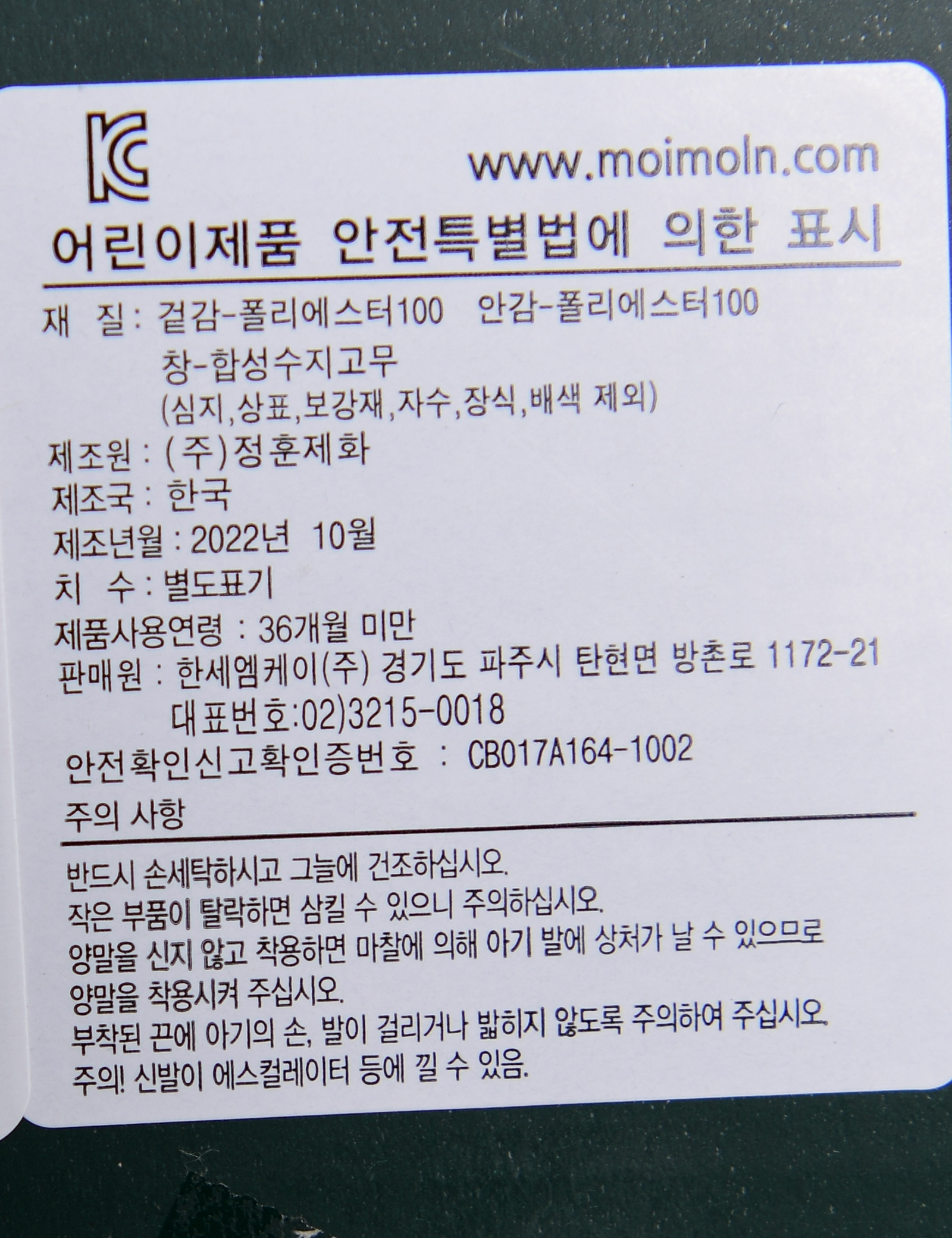 제품소재 (겉감/안감)폴리에스터100%(창)합성수지고무