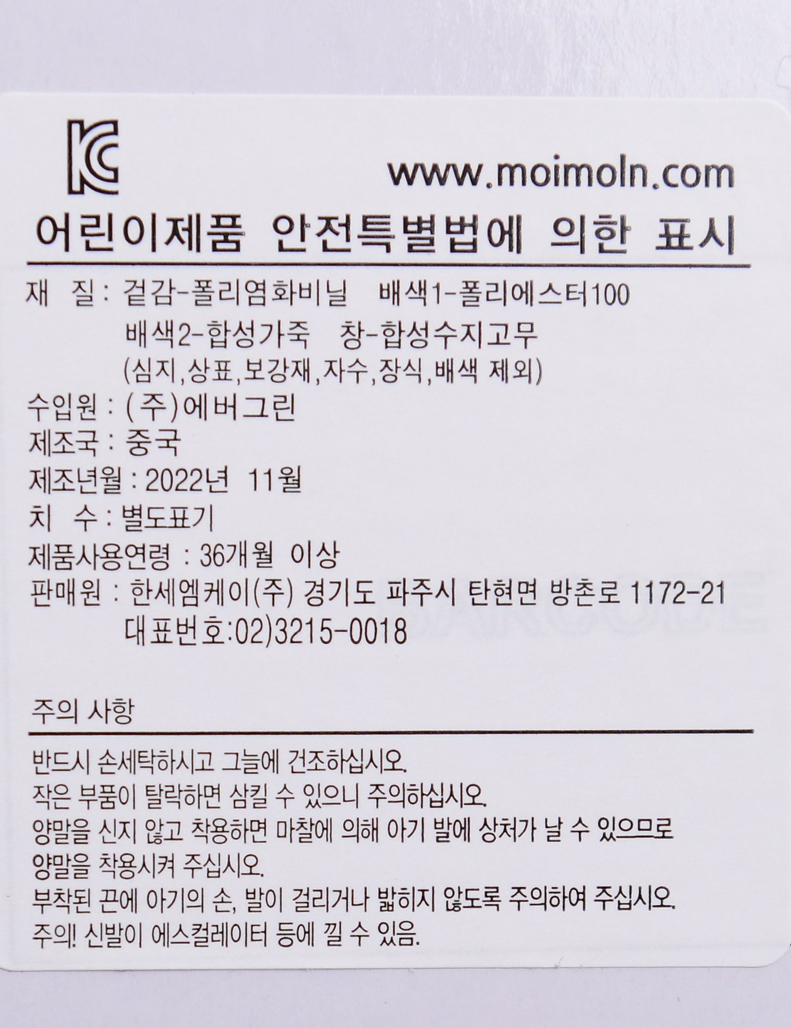 품명 및 모델명 (겉감)폴리염화비닐(배색1)폴리에스터100%(배색2)합성가죽(창)합성수지고무