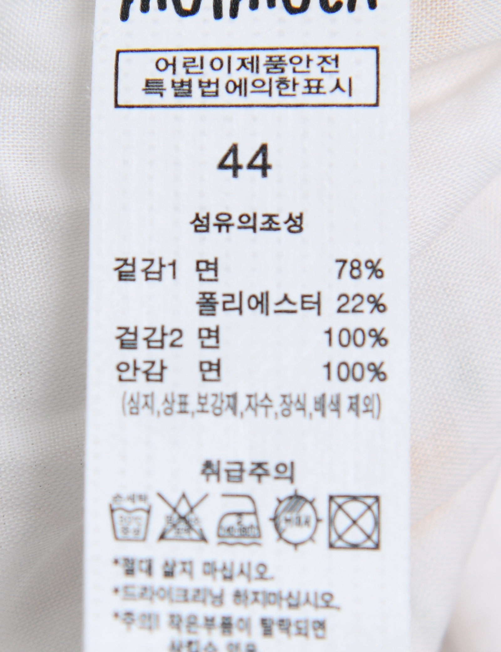 제품소재 (겉감1)면78%,폴리에스터22%(겉감2/안감)면100%