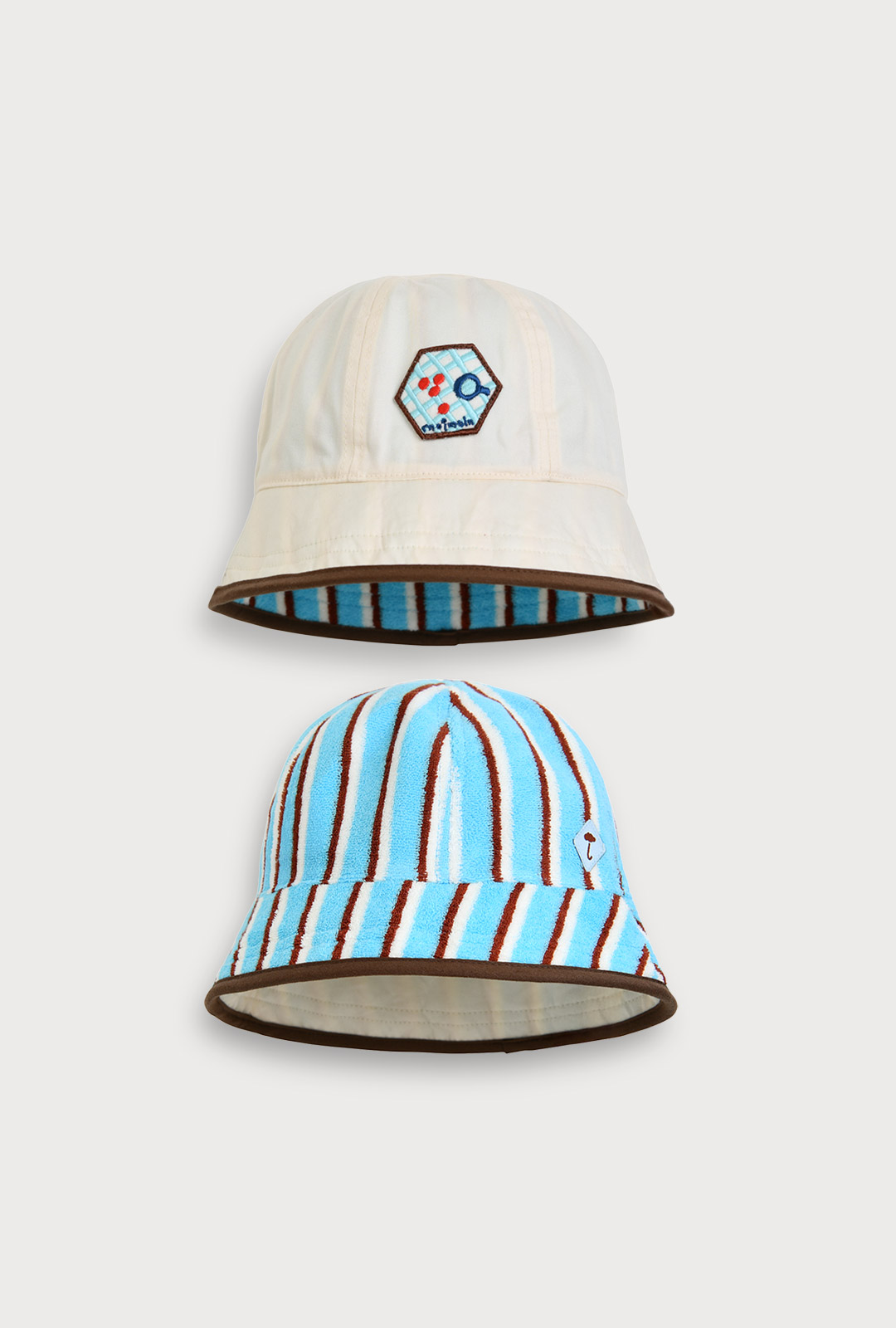 솔리드 면과 스트라이프 테리 소재를 활용해 두 가지 스타일링이 가능한 리버서블 버킷햇