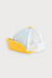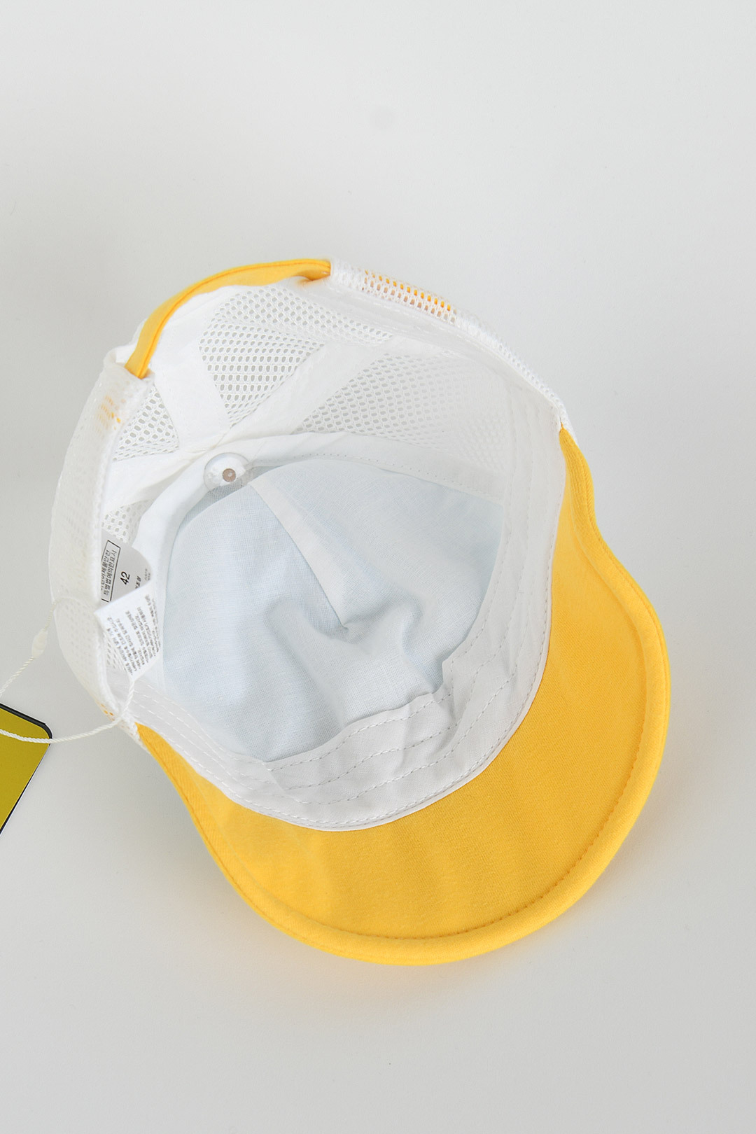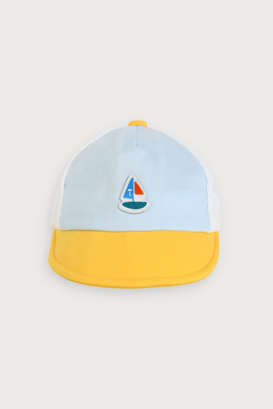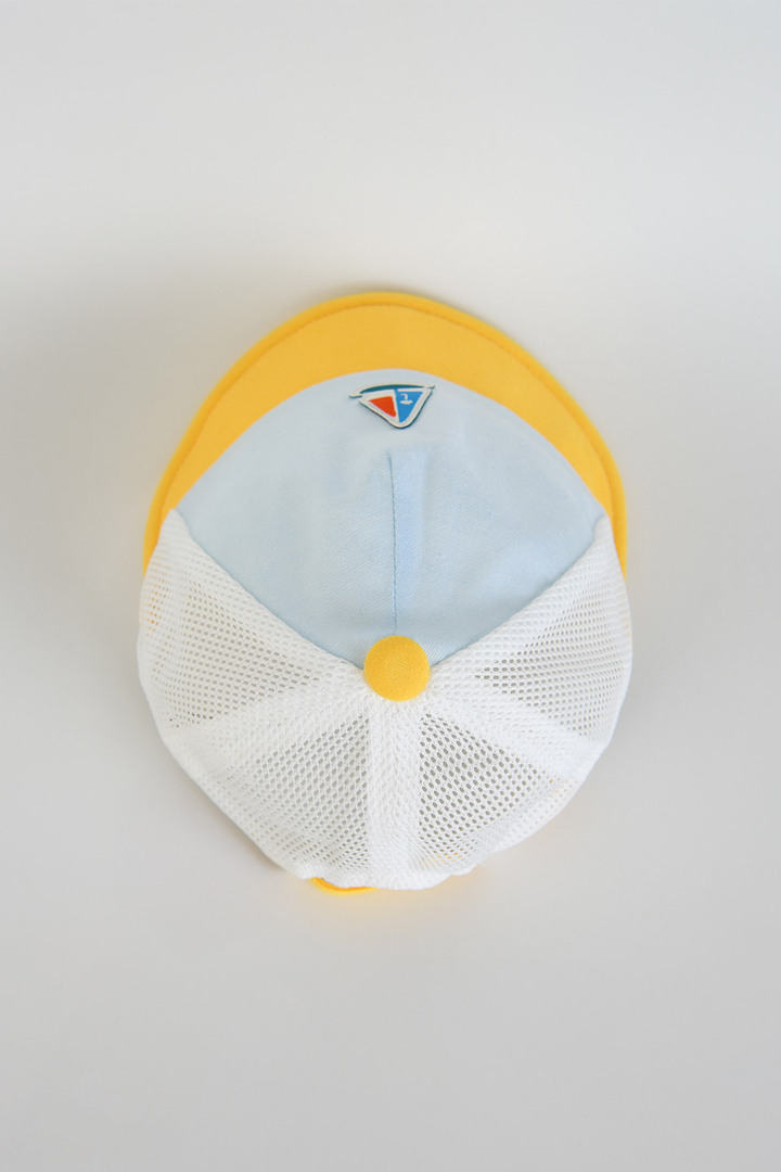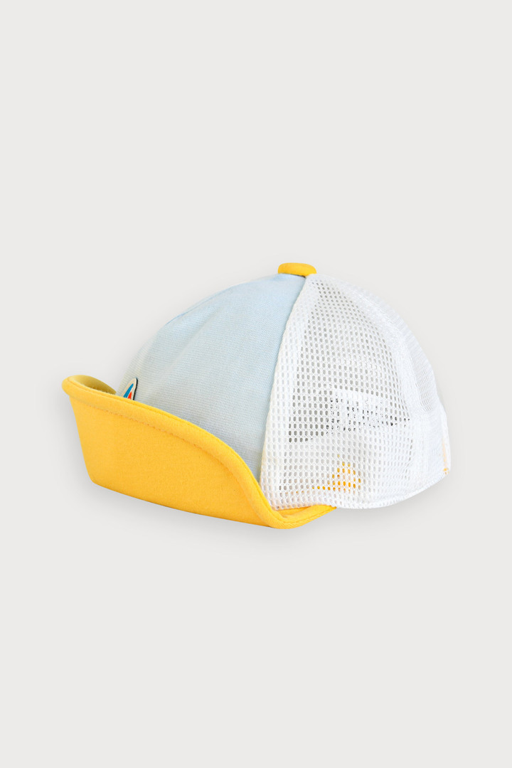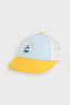 산뜻한 옐로우와 블루 컬러를 배색해 시원함을 더하고 돛단배 모티브의 직조 라벨로 포인트를 주었고, 뒷판은 메쉬 소재를 사용해 통기성이 좋아 더운 여름 쓰기 좋은 캡모자