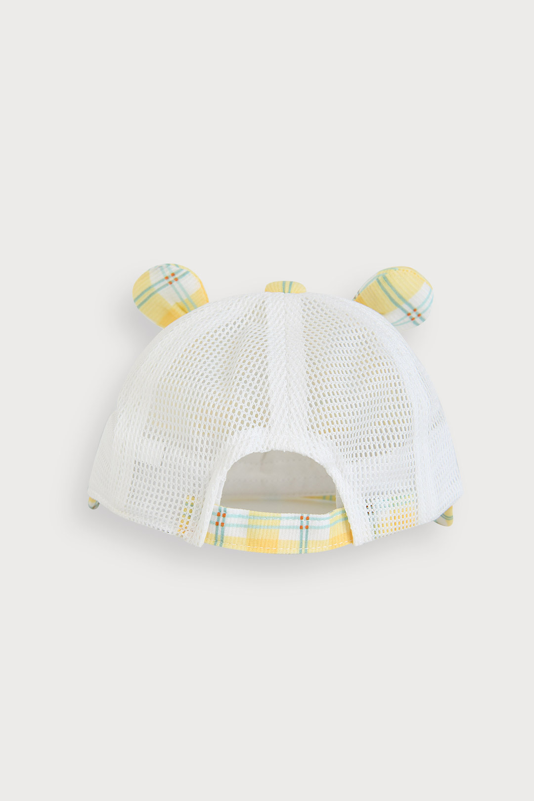 귀여운 곰 입체 귀와 체크 나염에 불박라벨로 포인트를 주었고,뒷판은 메쉬 소재를 사용해 통기성이 좋아 더운 여름 쓰기 좋은 캡모자