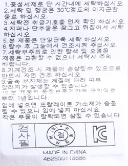 | 세탁방법 및 취급시 주의사항 | 중성세제로 단 시간내에 세탁하십시오.(케어라벨참고) |