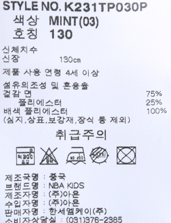제품소재 [겉감]면75% 폴리에스터25% [배색]폴리에스터100%
