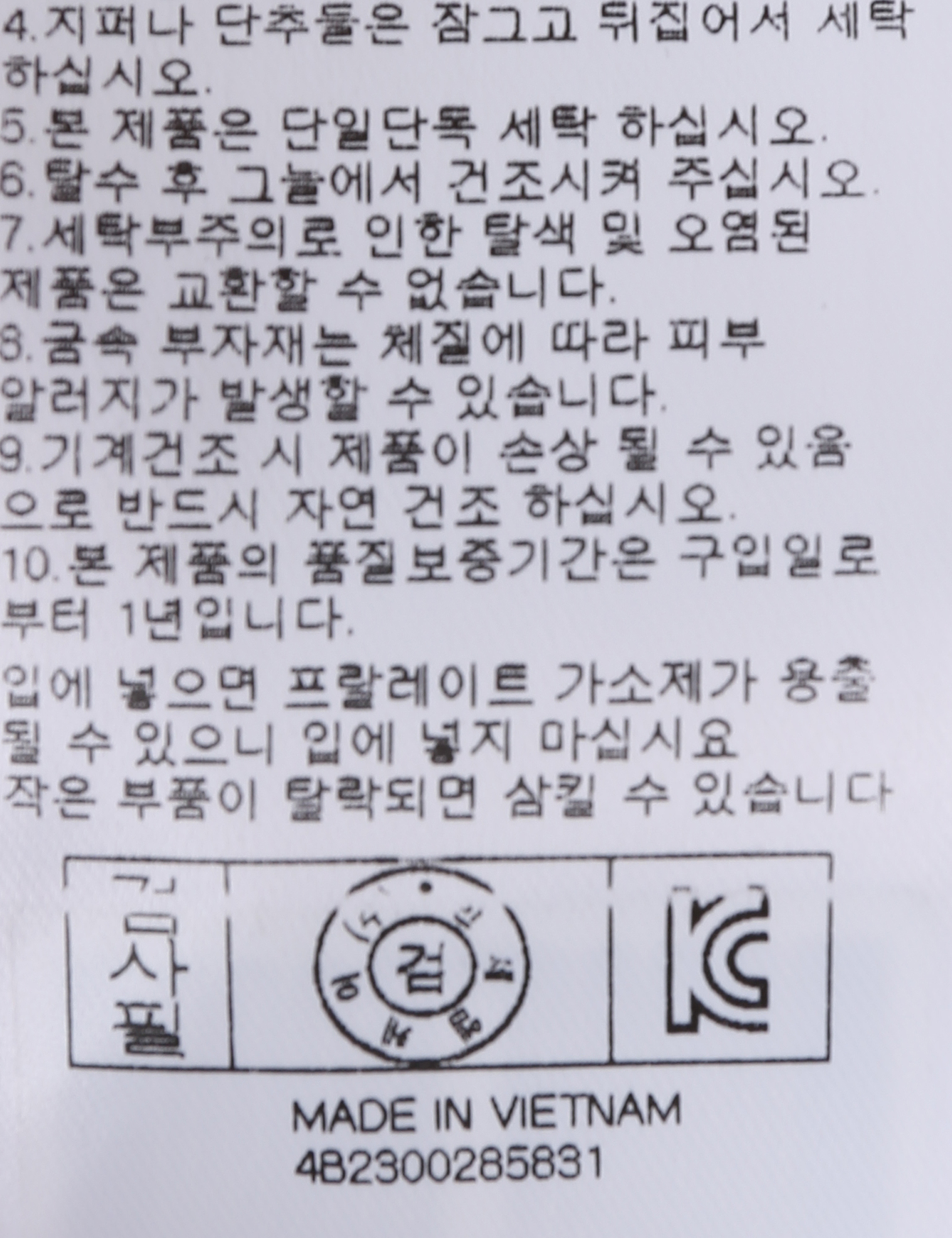 | 세탁방법 및 취급시 주의사항 | 본 제품은 손세탁 하십시오.(케어라벨참고) |
