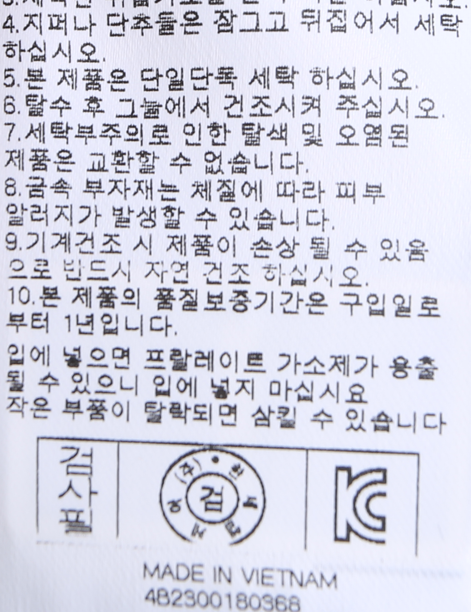 | 세탁방법 및 취급시 주의사항 | 본 제품은 손세탁 하십시오.(케어라벨참고) |