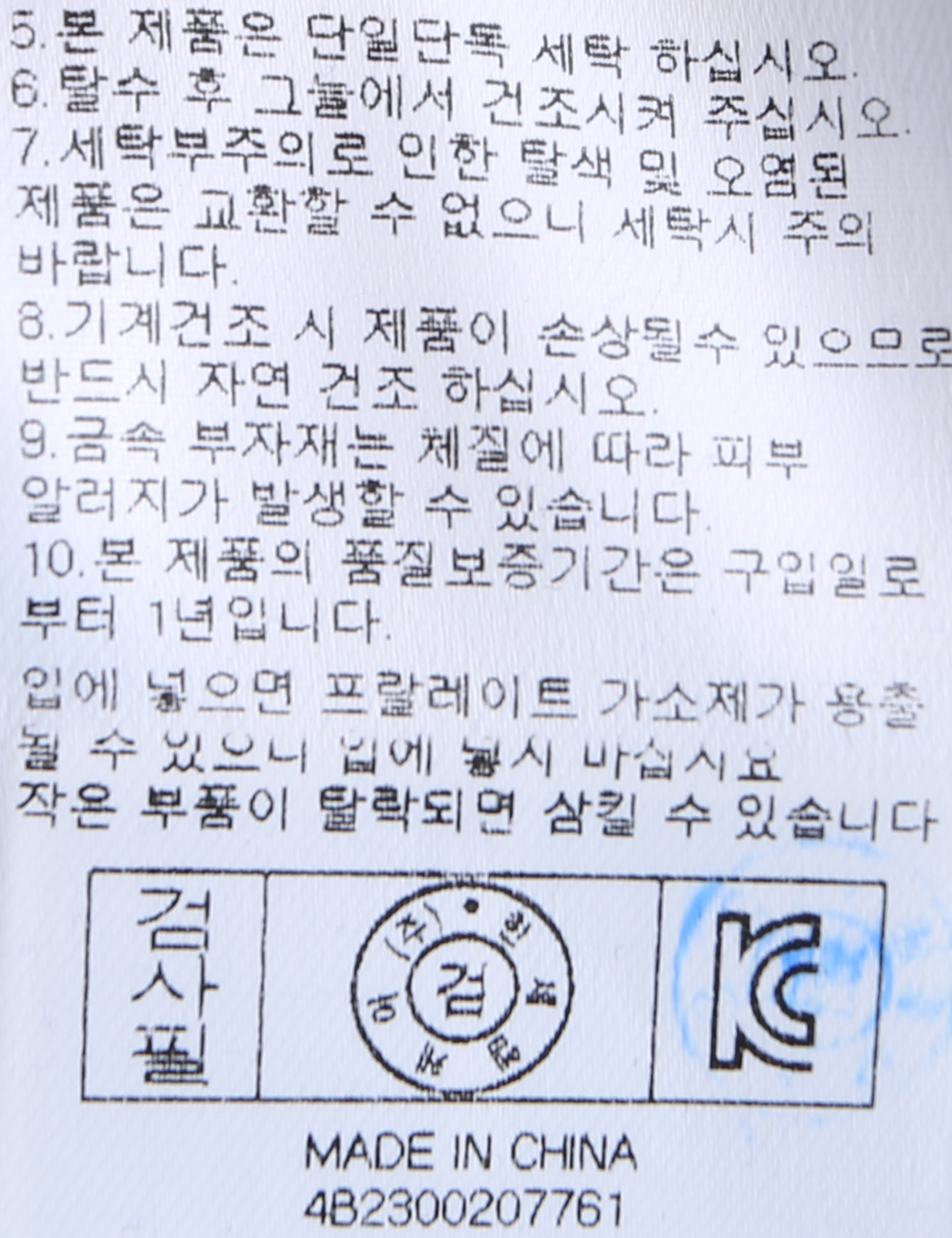 | 세탁방법 및 취급시 주의사항 | 중성세제로 단 시간내에 세탁하십시오.(케어라벨참고) |