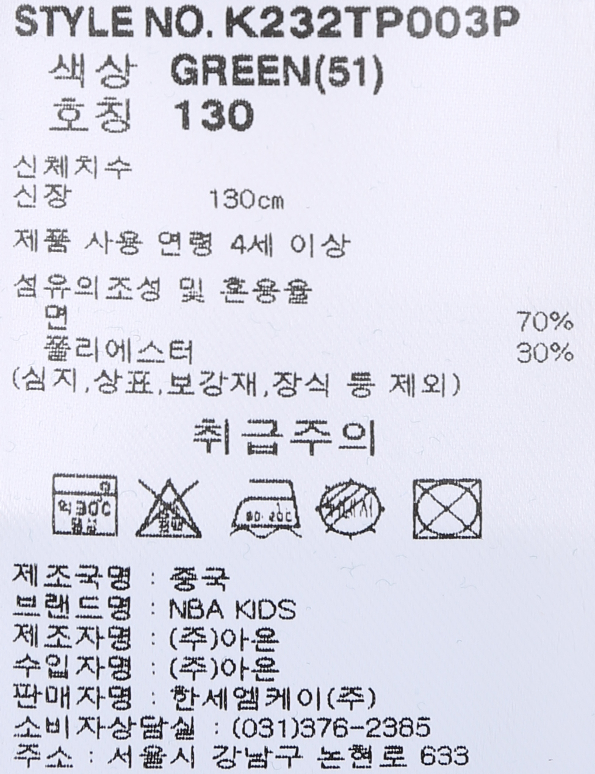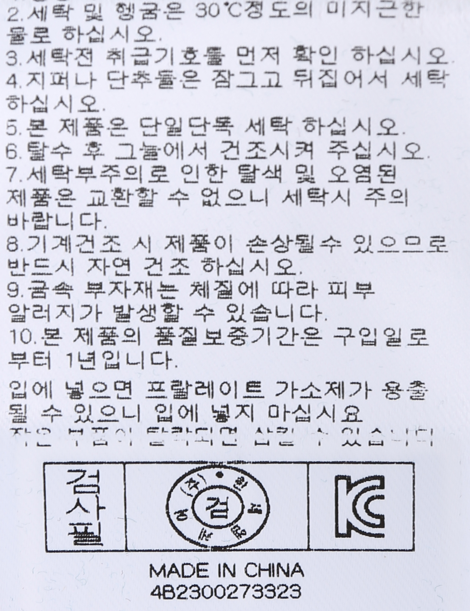 | 세탁방법 및 취급시 주의사항 | 중성세제로 단 시간내에 세탁하십시오.(케어라벨참고) |