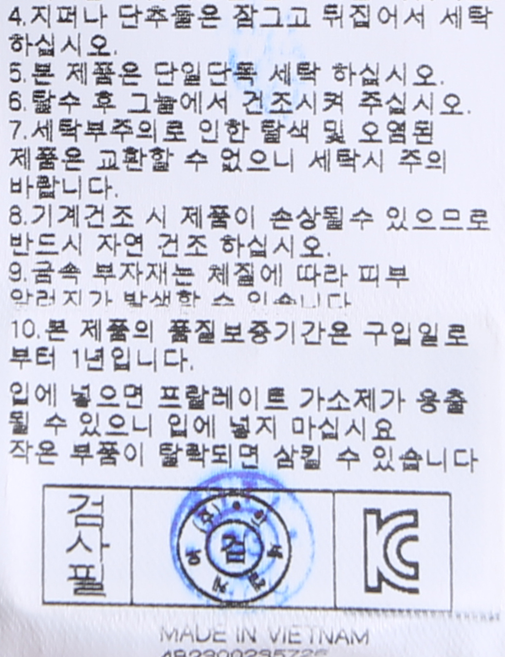 | 세탁방법 및 취급시 주의사항 | 중성세제로 단 시간내에 세탁하십시오.(케어라벨참고) |