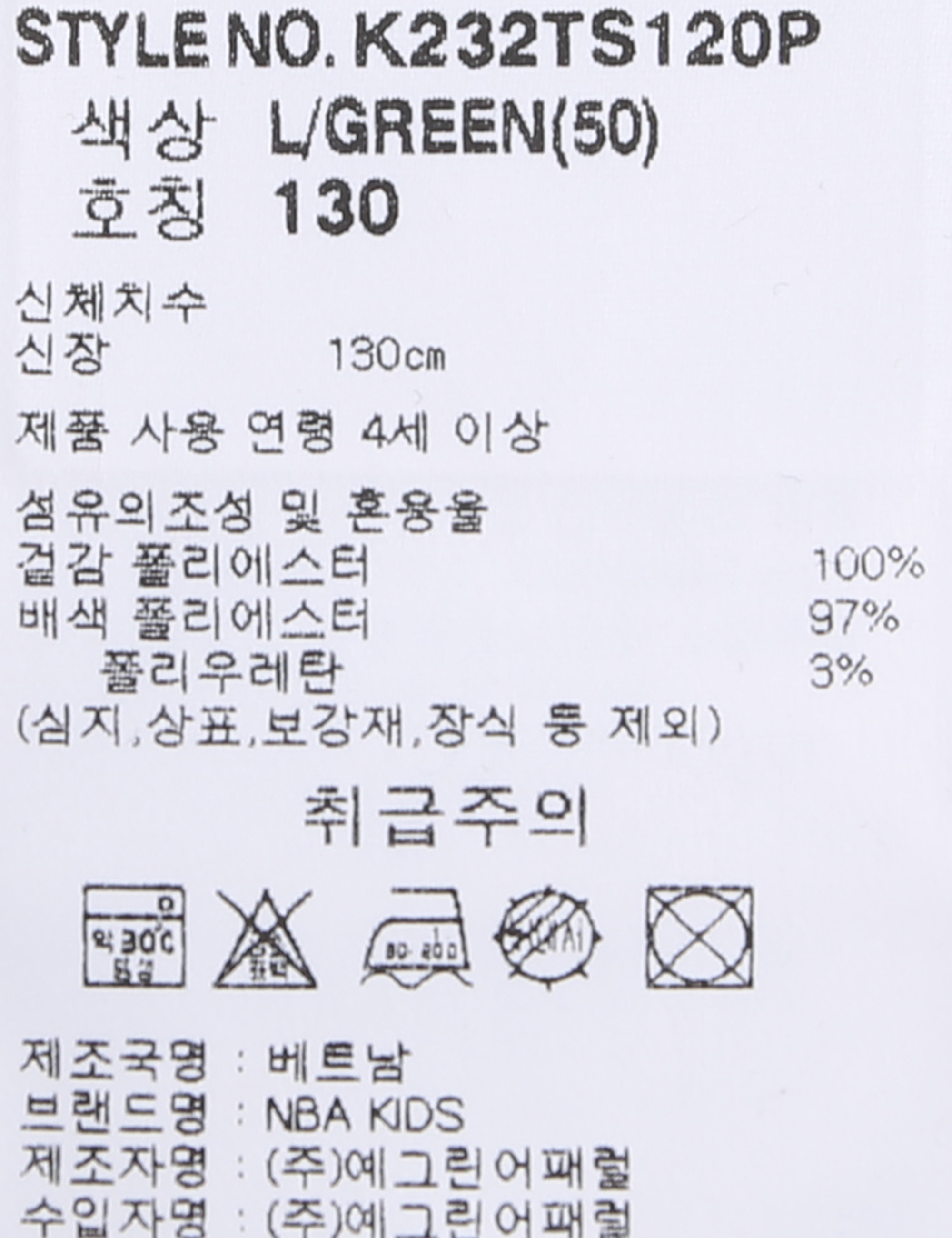 제품소재 [겉감]폴리에스터100% [배색]폴리에스터97% 폴리우레탄3%