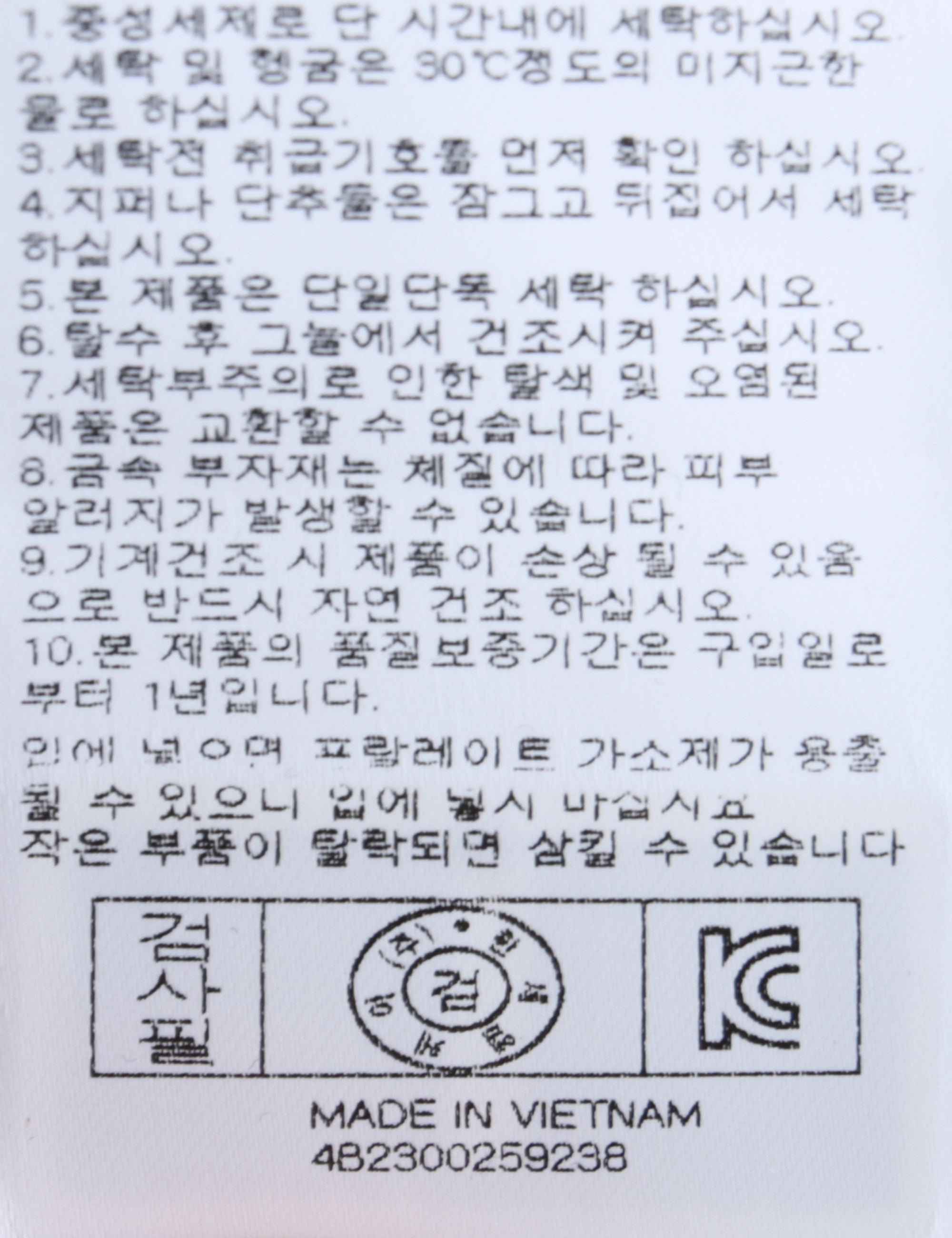 | 세탁방법 및 취급시 주의사항 | 본 제품은 손세탁 하십시오.(케어라벨참고) |