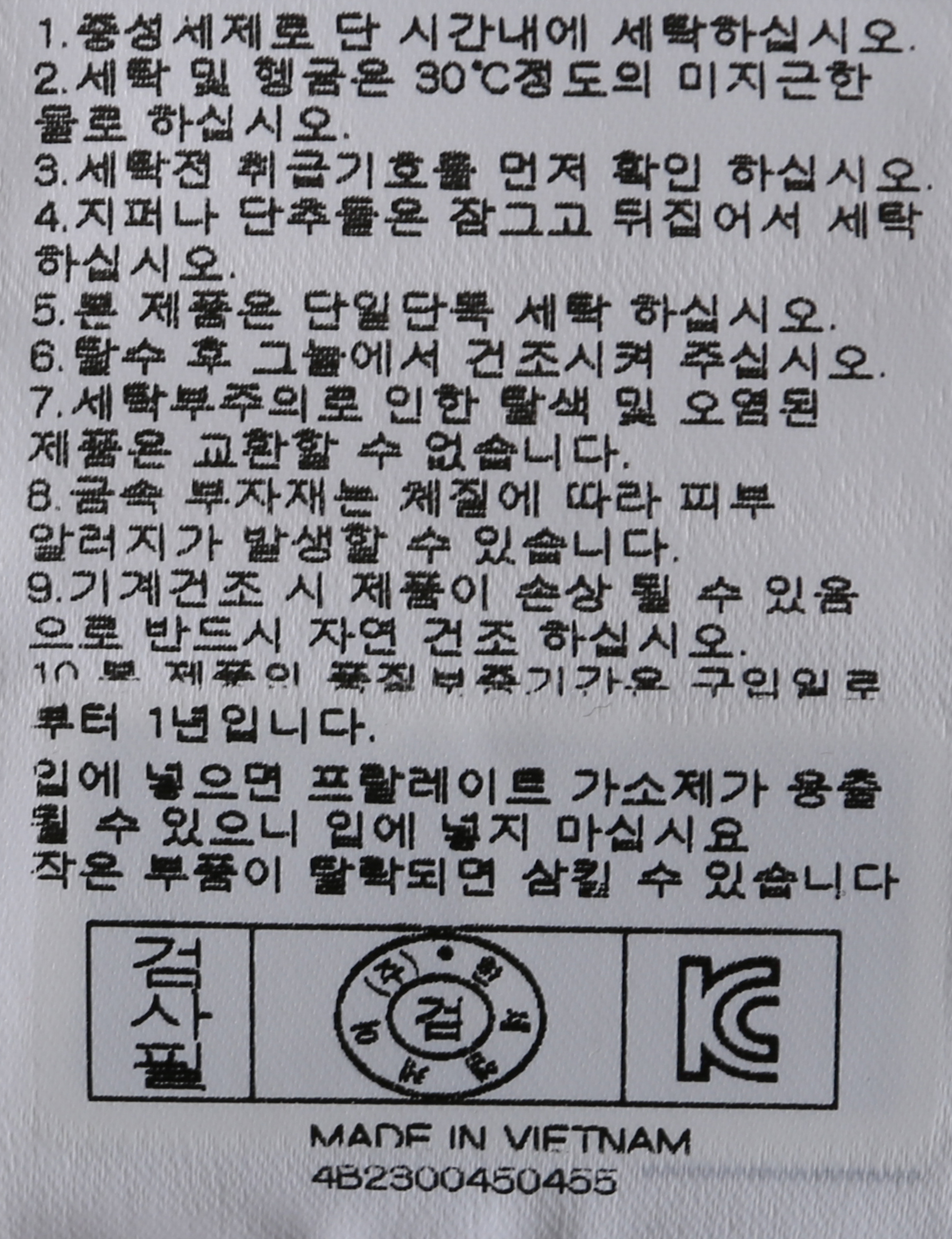 | 세탁방법 및 취급시 주의사항 | 본 제품은 손세탁 하십시오.(케어라벨참고) |