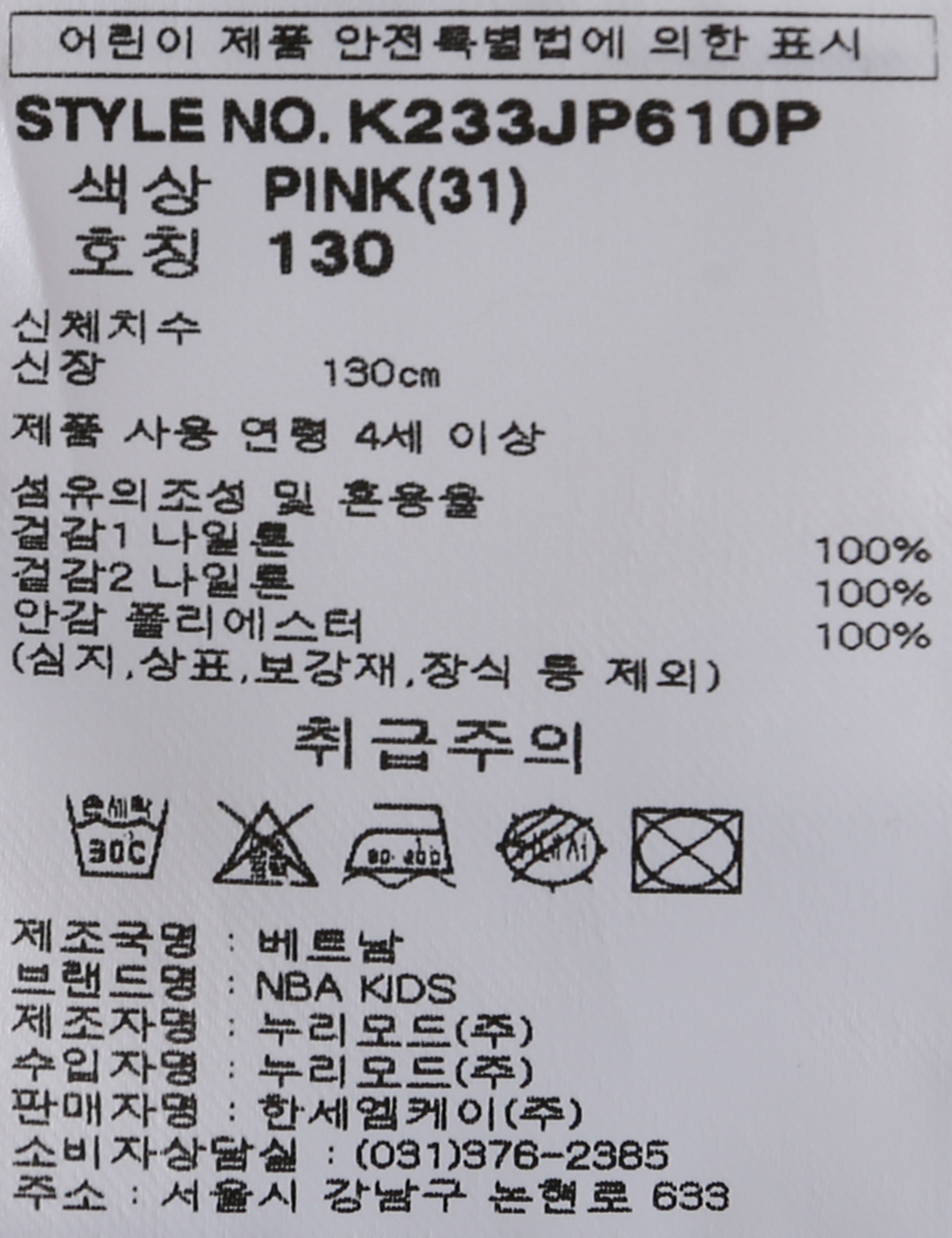 상품명 NBA 여아 블록 바람막이 점퍼(K233SK610P SET)(K233JP610P)