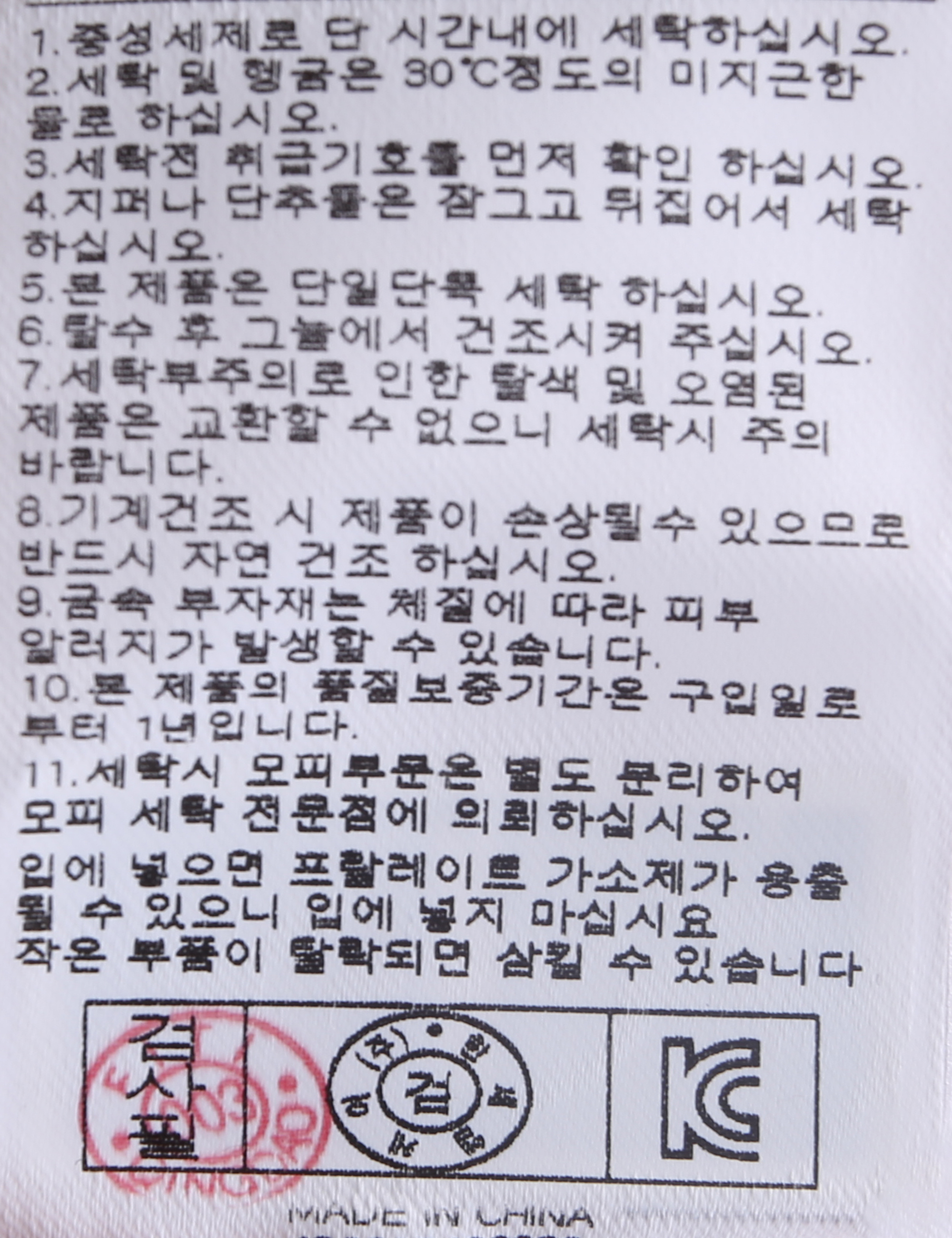 | 세탁방법 및 취급시 주의사항 | 중성세제로 단 시간내에 세탁하십시오.(케어라벨참고) |