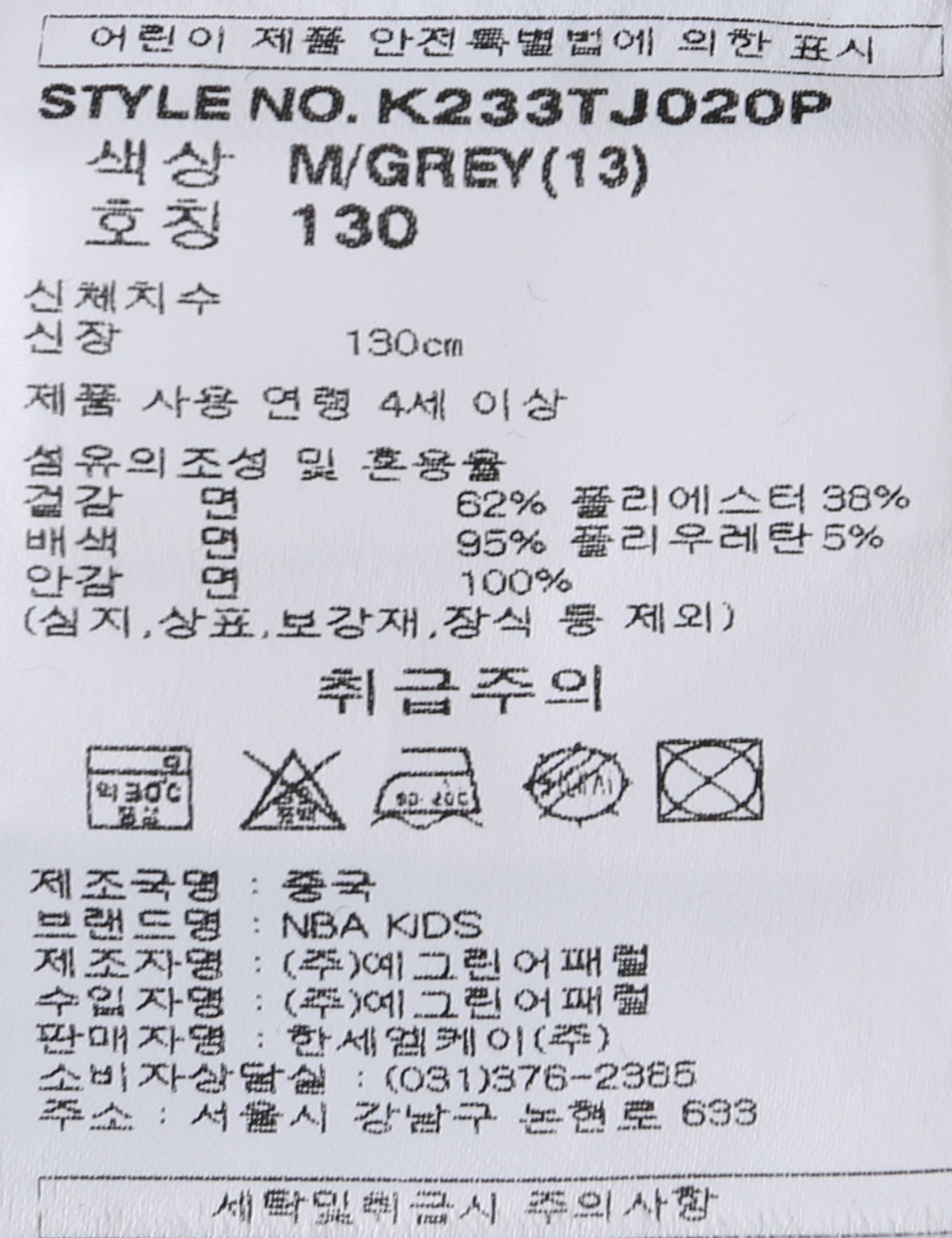 제품소재 [겉감]면62% 폴리에스터38% [배색]면95% 폴리우레탄5% [안감]면100%