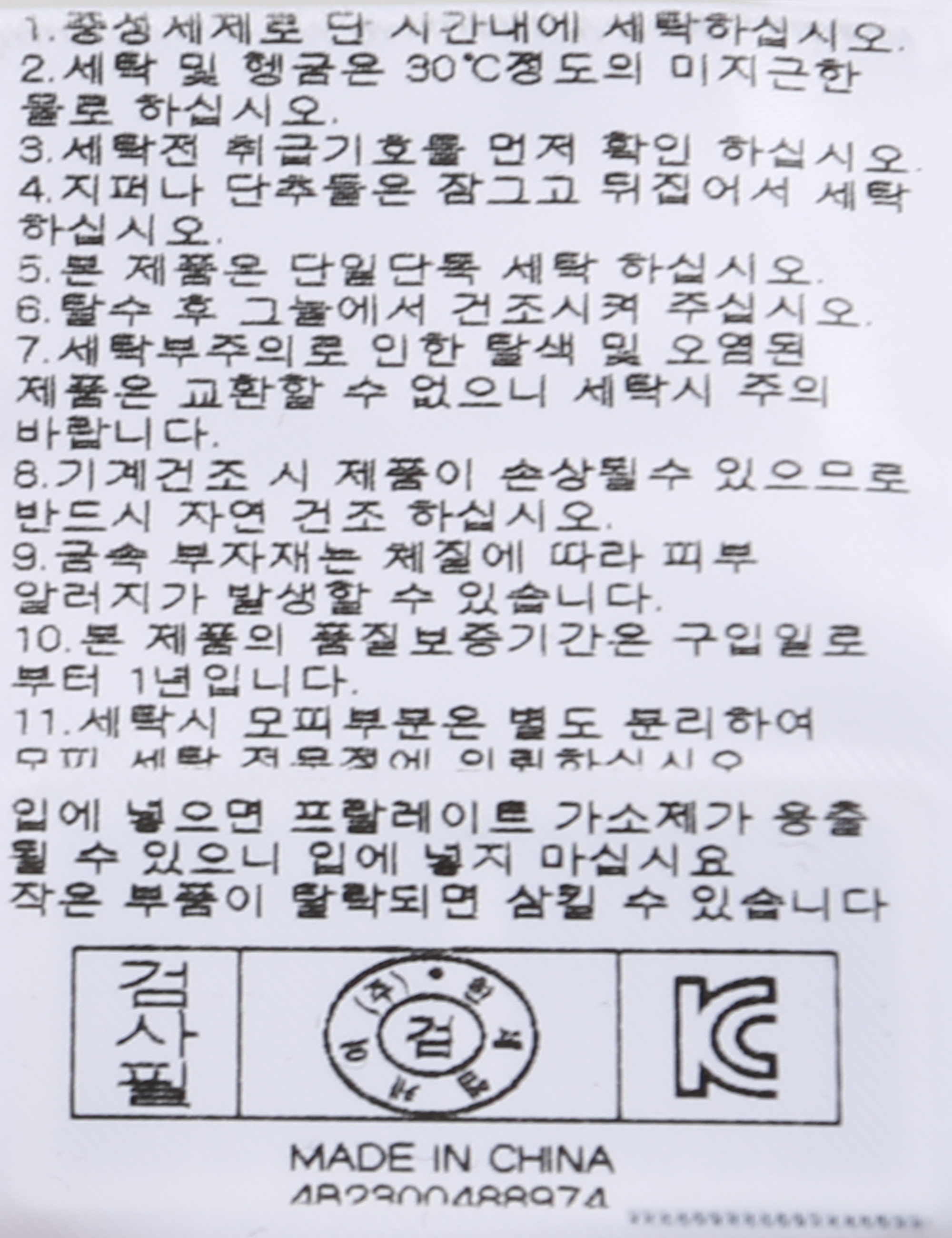 | 세탁방법 및 취급시 주의사항 | 중성세제로 단 시간내에 세탁하십시오.(케어라벨참고) |