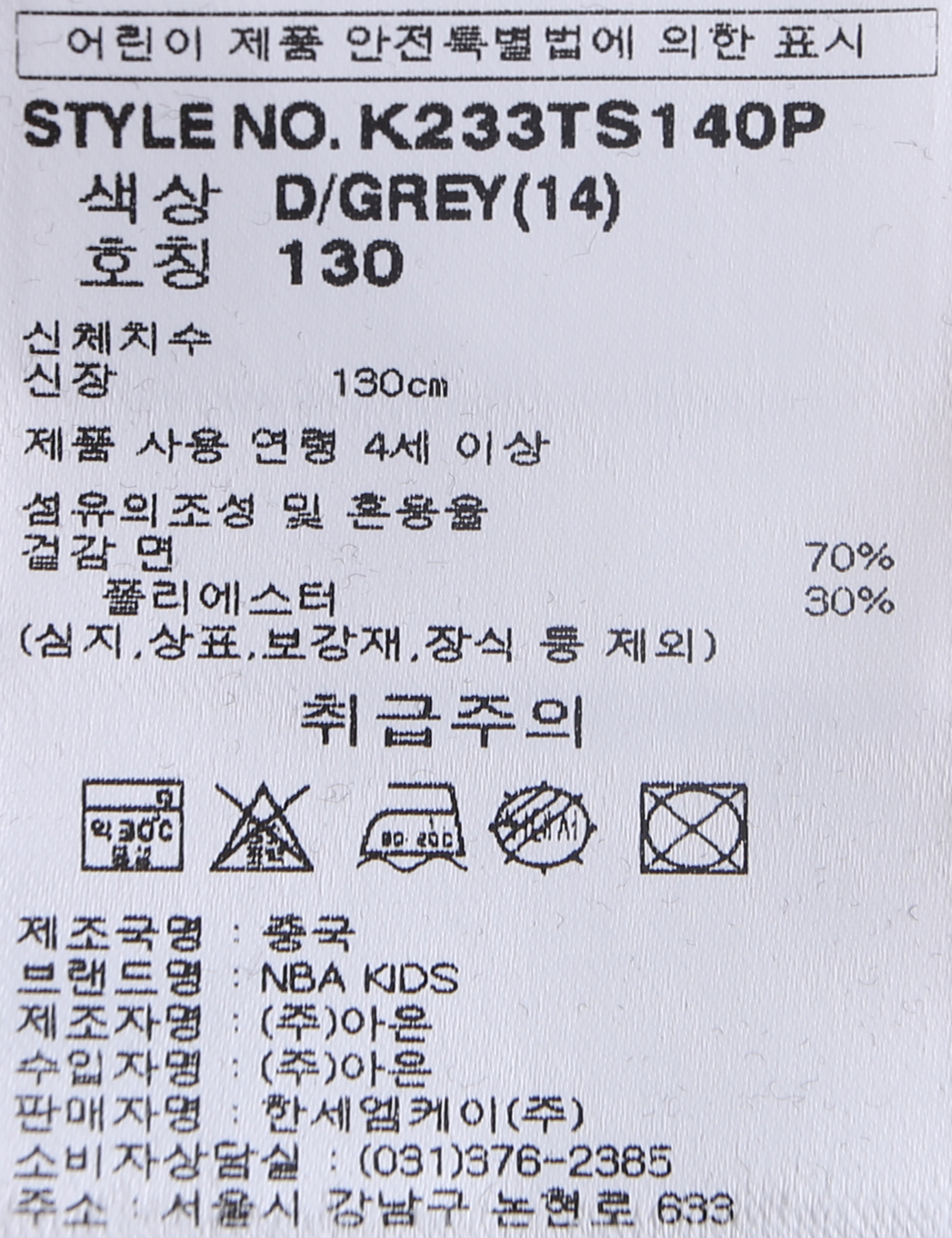 상품명 NBA 로고 싱글티셔츠(K233TS140P)